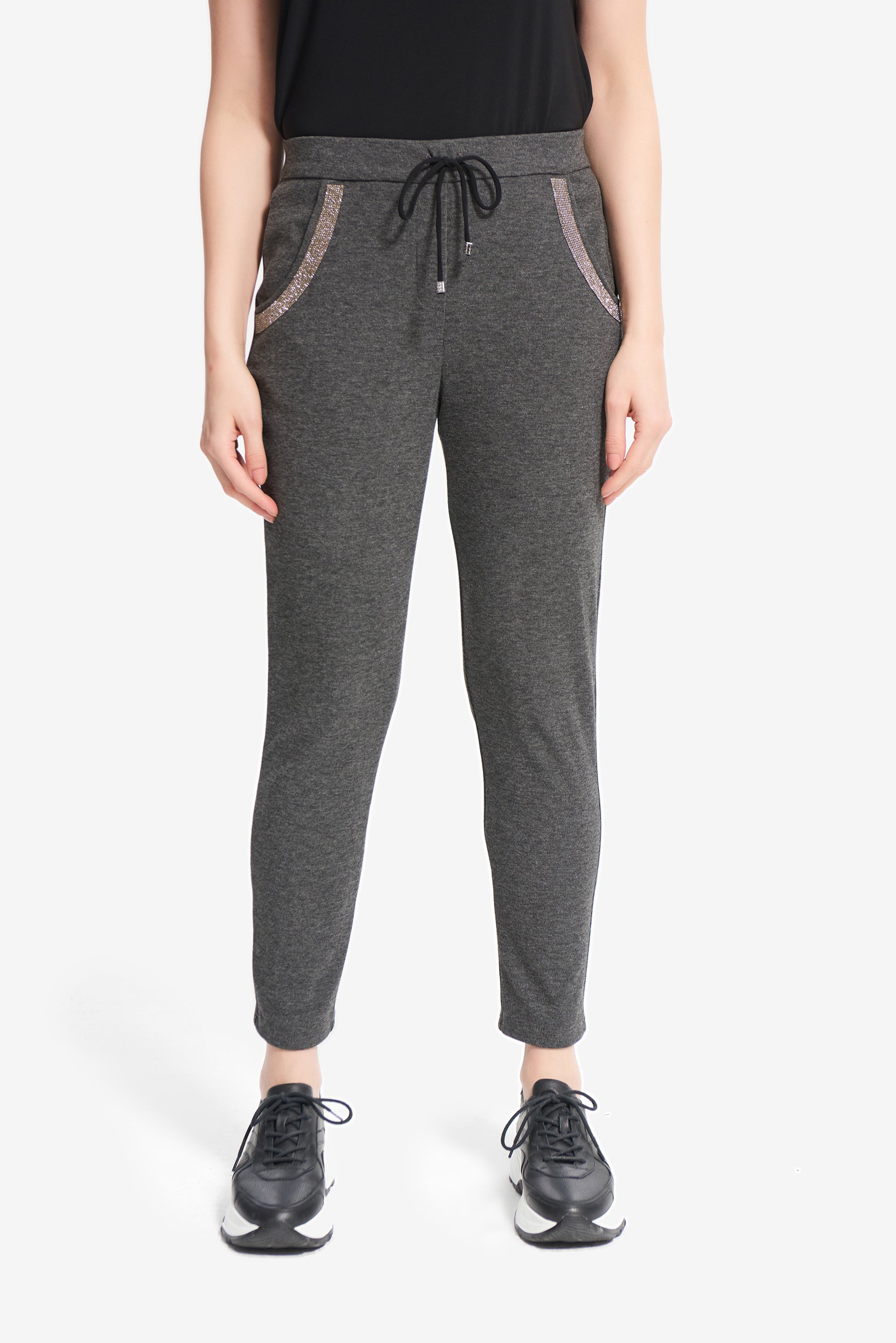 Pantalón estilo para dama color gris jaspe, , tira decorativa con brillo sobre las bolsas frontales, jareta para ajuste