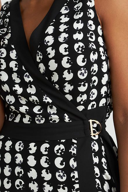 Un vestido sin mangas fresco para la primavera de Joseph Ribkoff, el frente de envoltura favorecedor de este impresionante diseño es un estilo fácil de usar. Te encantará su llamativo motivo circular en blanco y negro, que aparece de nuevo en la corbata.