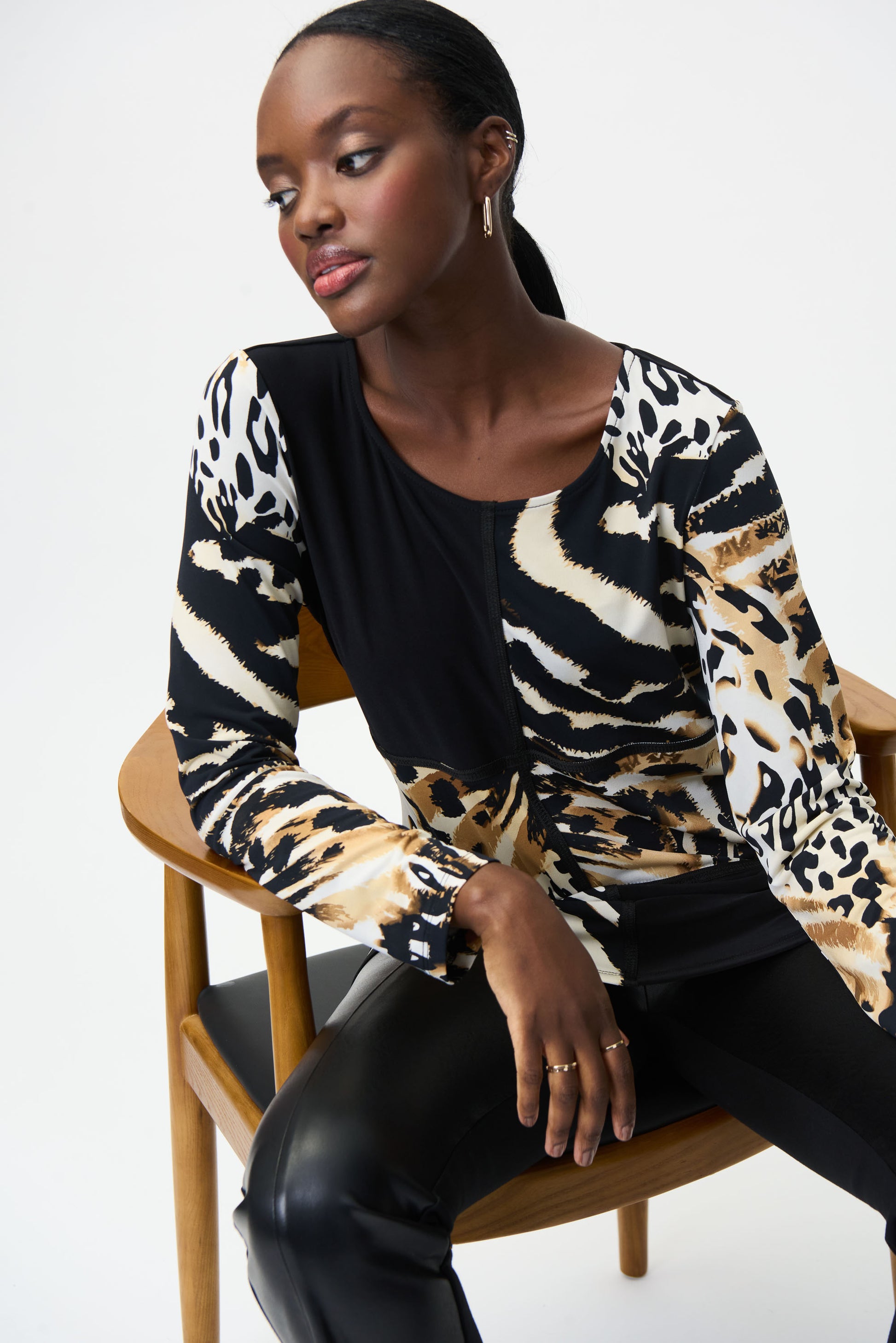 Tœnica para dama en bloques negro y animal print, cuello redondo, manga larga.