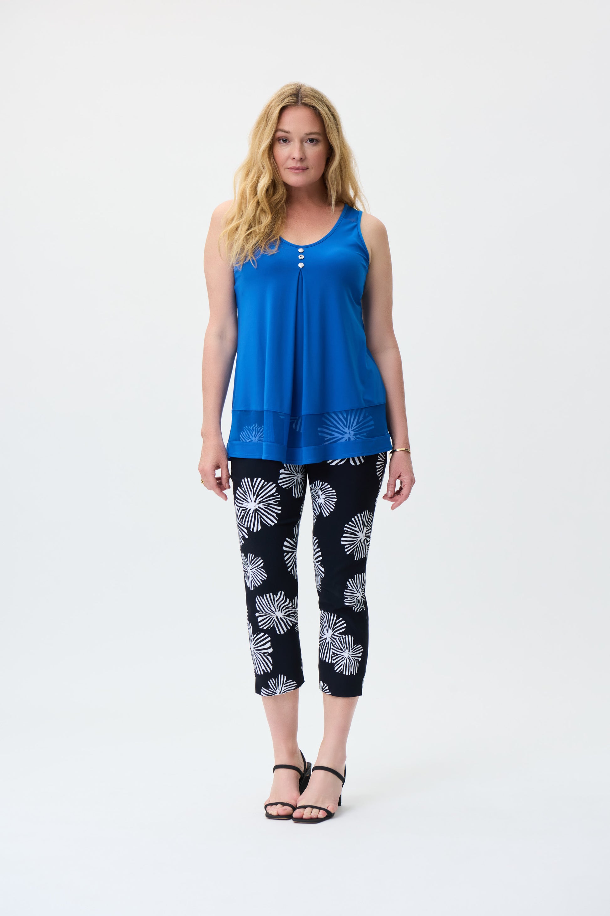 Top para dama color azul eléctrico, escote redondo, botones decorativos en el busto, pliegue bajo el busto, sin mangas, con transparencia sobre el ruedo y en hombros.