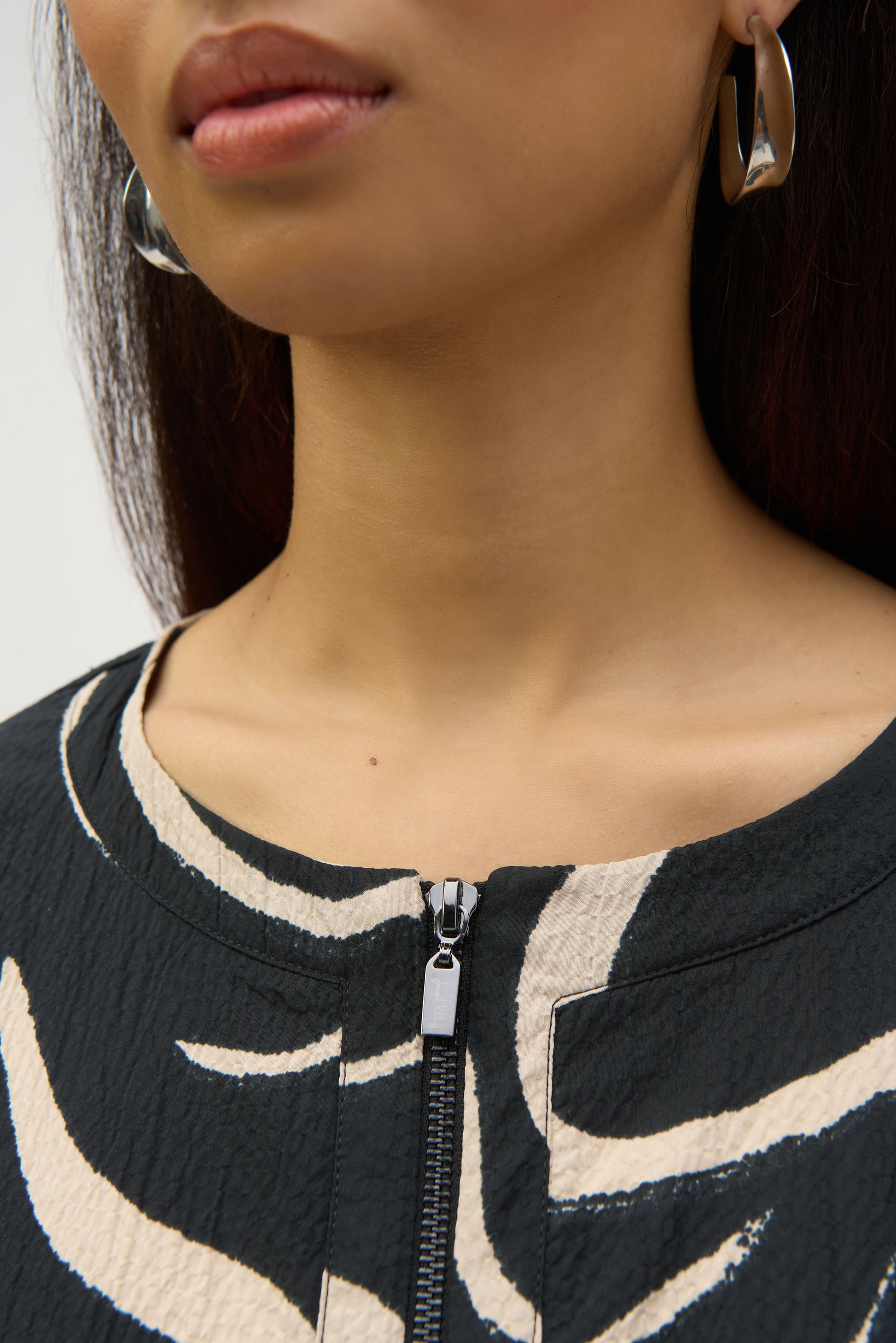 Disfrute de la combinación perfecta de comodidad y estilo con este vestido de línea A, confeccionado en un ligero tejido mil rayas con un llamativo estampado abstracto. El cuello redondo, las mangas cortas tipo dolmán y la longitud hasta la rodilla garantizan un look elegante y cómodo sin esfuerzo. Rematado con bolsillos de parche y cremallera en el escote, este vestido es tan práctico como estiloso.