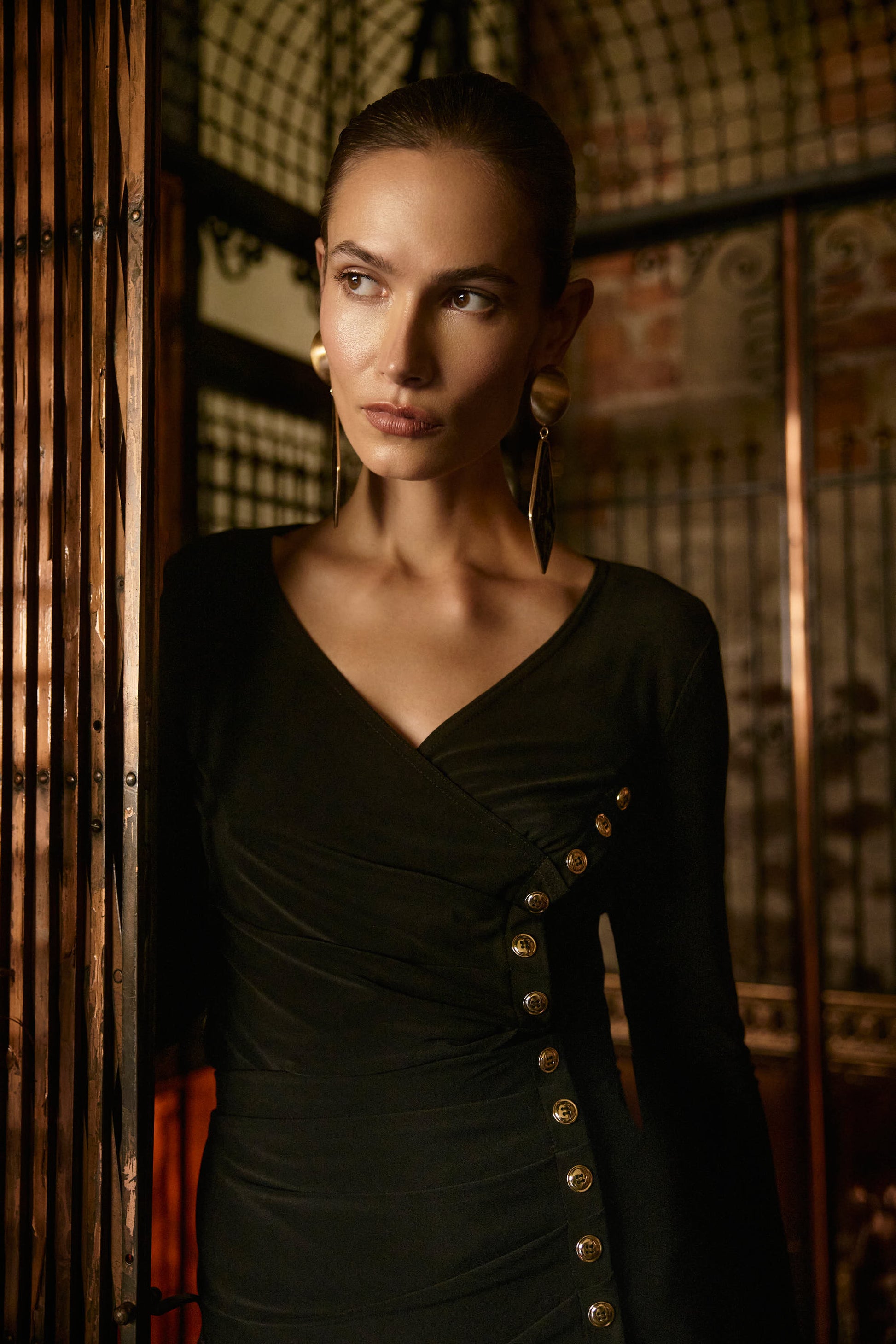 Este top de raso realza cualquier atuendo porque derrocha pura elegancia. El escote cruzado y la silueta ajustada se combinan a la perfección para crear un look extraordinariamente refinado y atemporal. La prenda cuenta también con unos bonitos botones dorados que añaden un toque glamuroso a este impresionante diseño contemporáneo.