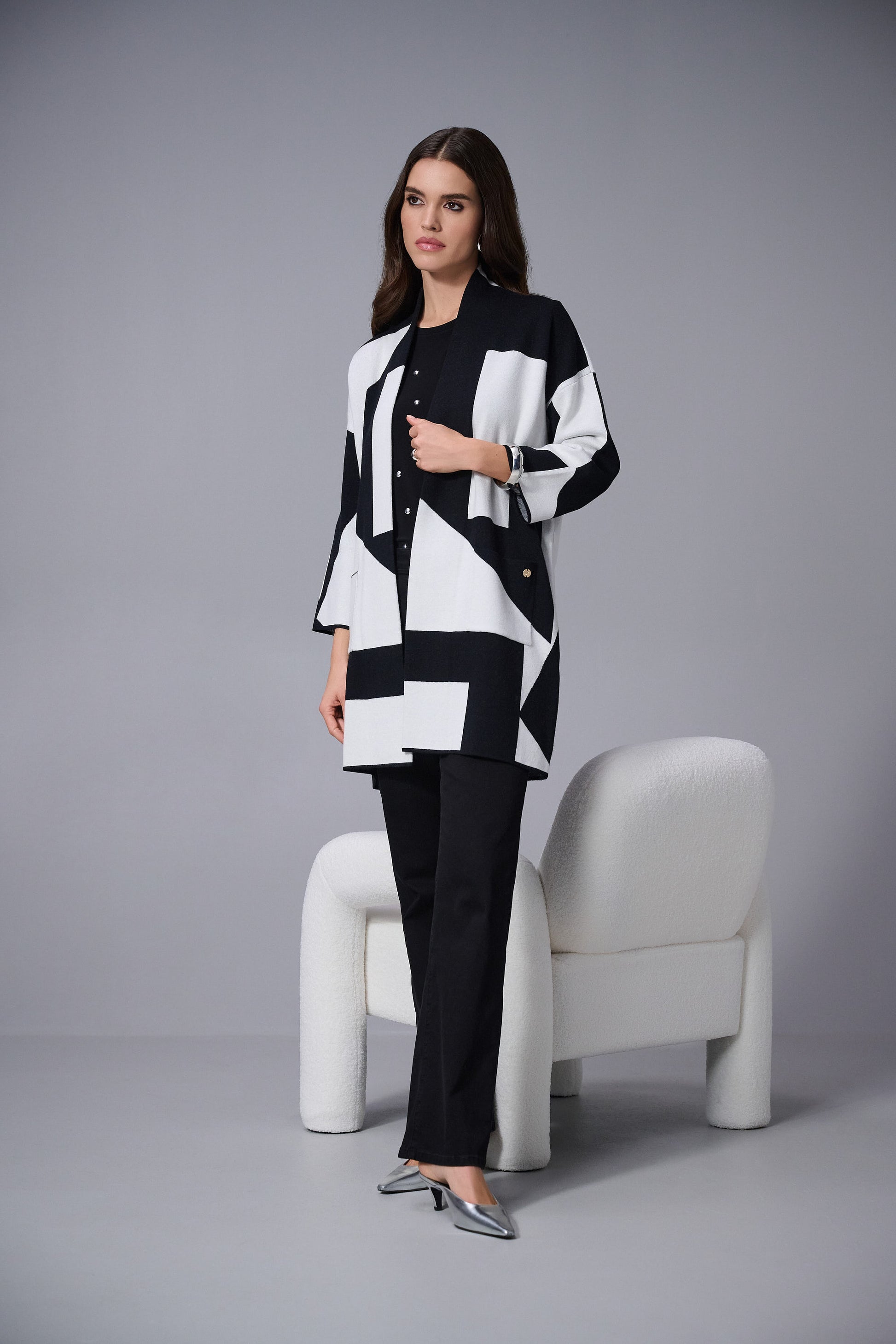 Amplíe su estilo con este lujoso cover up de jersey de jacquard, que presenta un atrevido estampado geométrico monocromático para causar impacto de inmediato con cualquier conjunto. Diseñada con una silueta abierta por la parte delantera, un escote contemporáneo reforzado y mangas tres cuartos, esta llamativa prenda de abrigo le dará toque de sofisticación artística a su look.