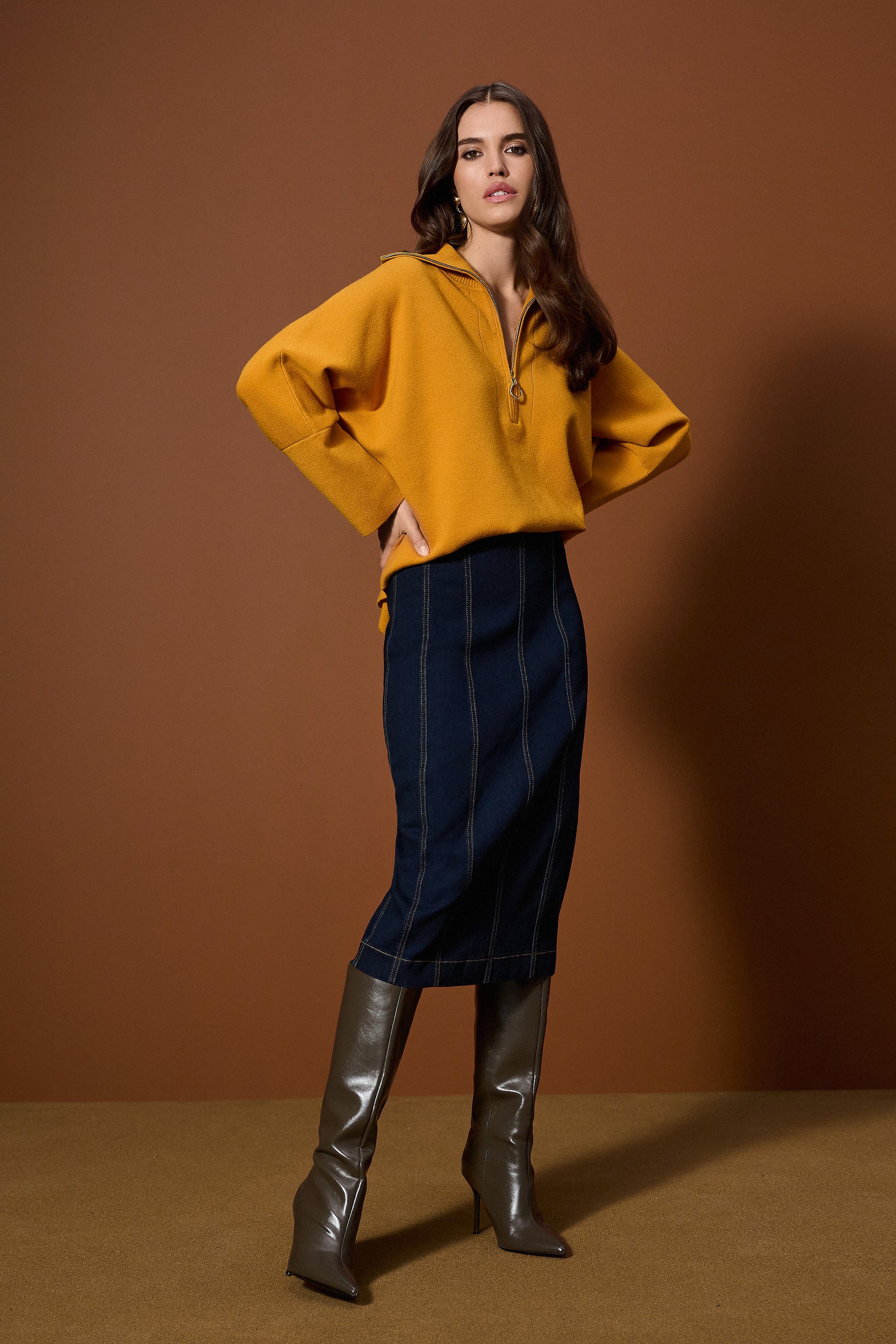 Mejore su colección de prendas vaqueras con nuestra moderna falda lápiz, diseñada con una elegante estructura de paneles y costuras en contraste para favorecer su figura. Está confeccionada en un tejido vaquero Repreve® ultrasuave y elástico, por lo que resulta el complemento perfecto para su vestuario de primavera. Combínela con un top de punto ligero y unas botas hasta la rodilla para lograr un estilazo sin esfuerzo. Como guinda, trae una abertura a la espalda que garantiza la facilidad de movimiento, que la harán ir cómoda durante todo el día.