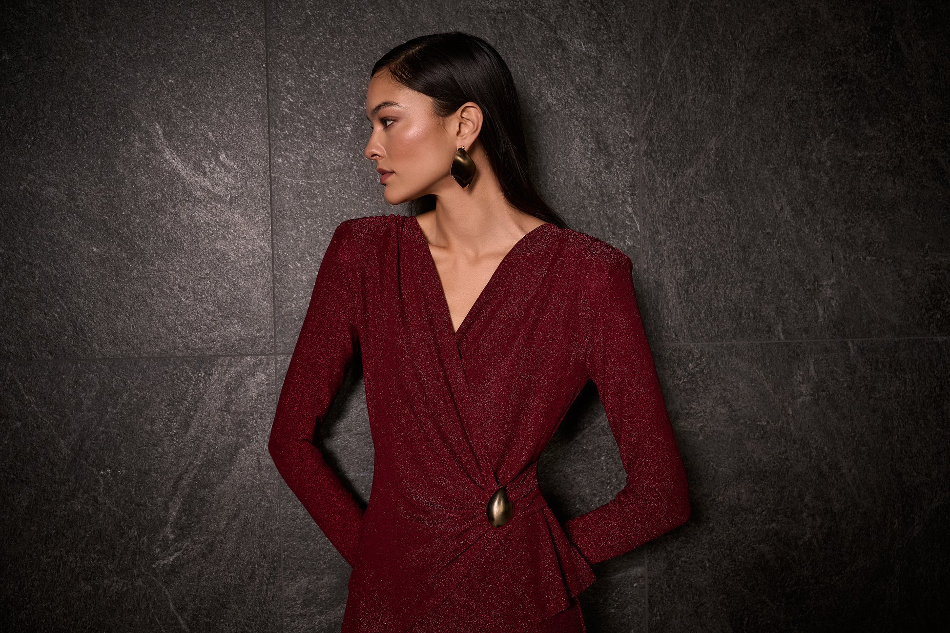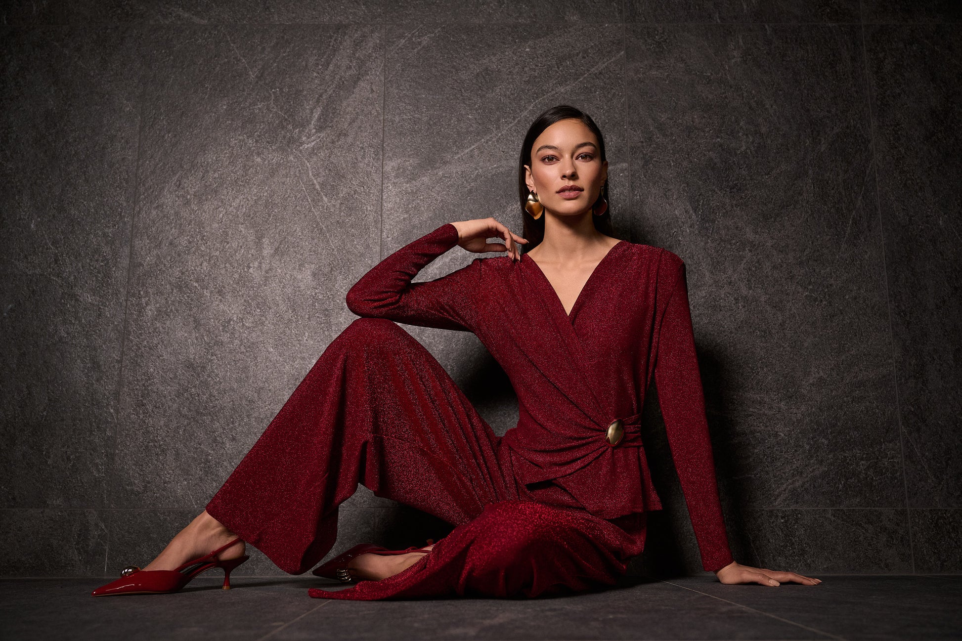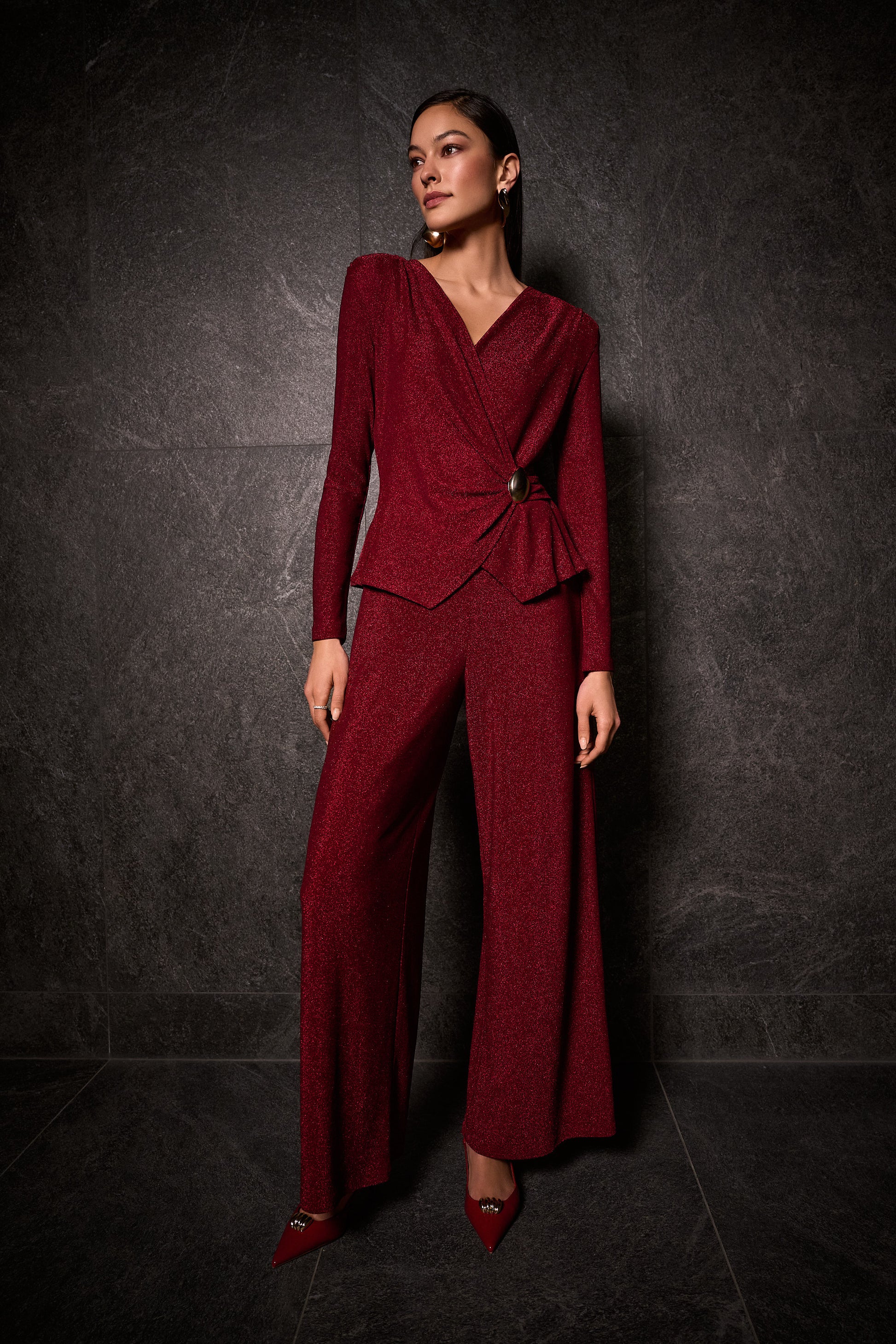 Abrace la sofisticación de este mono de punto de lúrex diseñado con un seductor corpiño cruzado y un hermoso adorno abstracto antiguo. La silueta de pierna ancha añade aplomo a cada paso y un atractivo atemporal a la prenda.