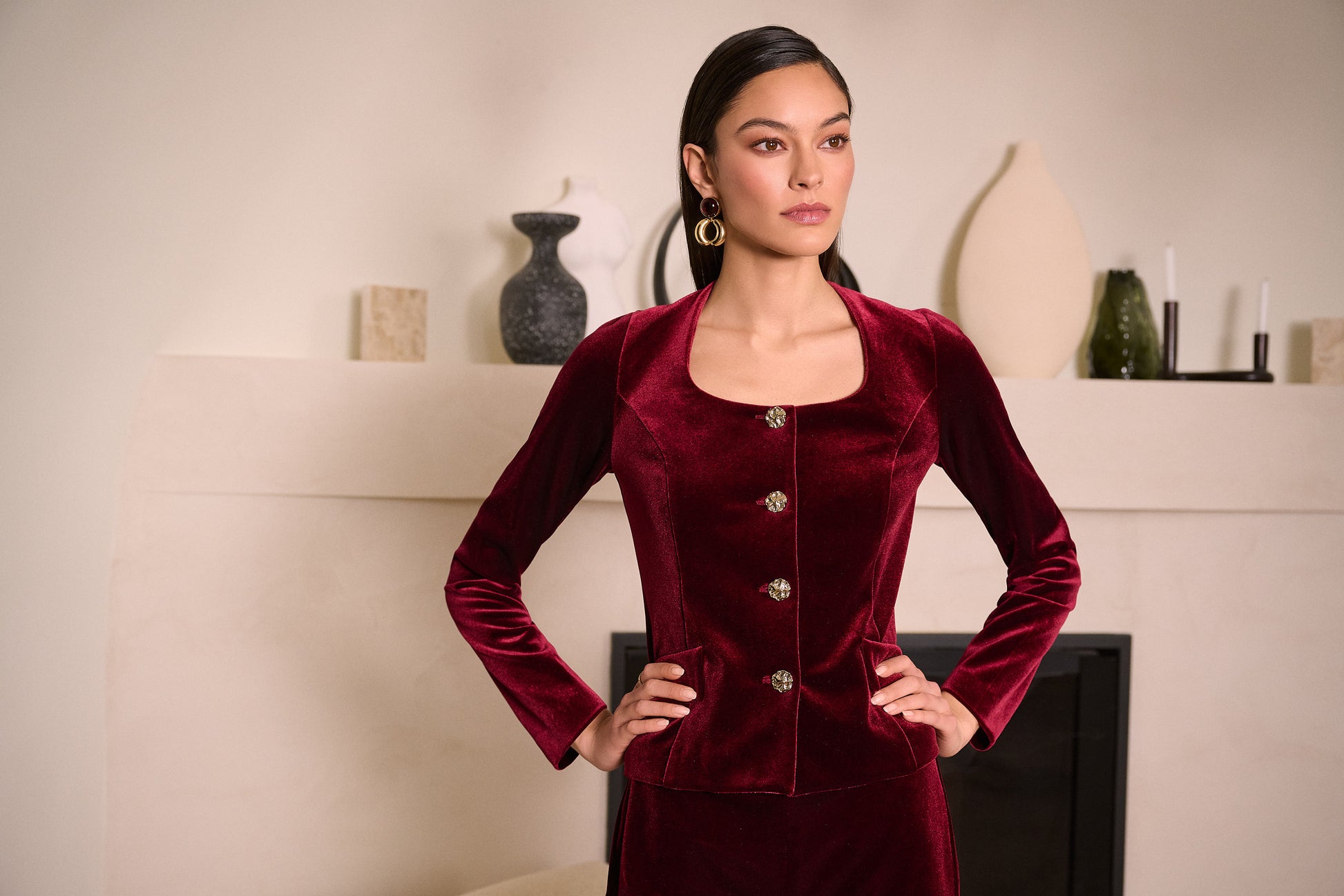 Confeccionados en suave terciopelo, estos pantalones que irradian elegancia sin esfuerzo cuentan con una cómoda cintura sin cierres y pierna acampanada fluida que crea una favorecedora silueta de ensueño. El pantalón perfecto que no sabía que ansiaba.