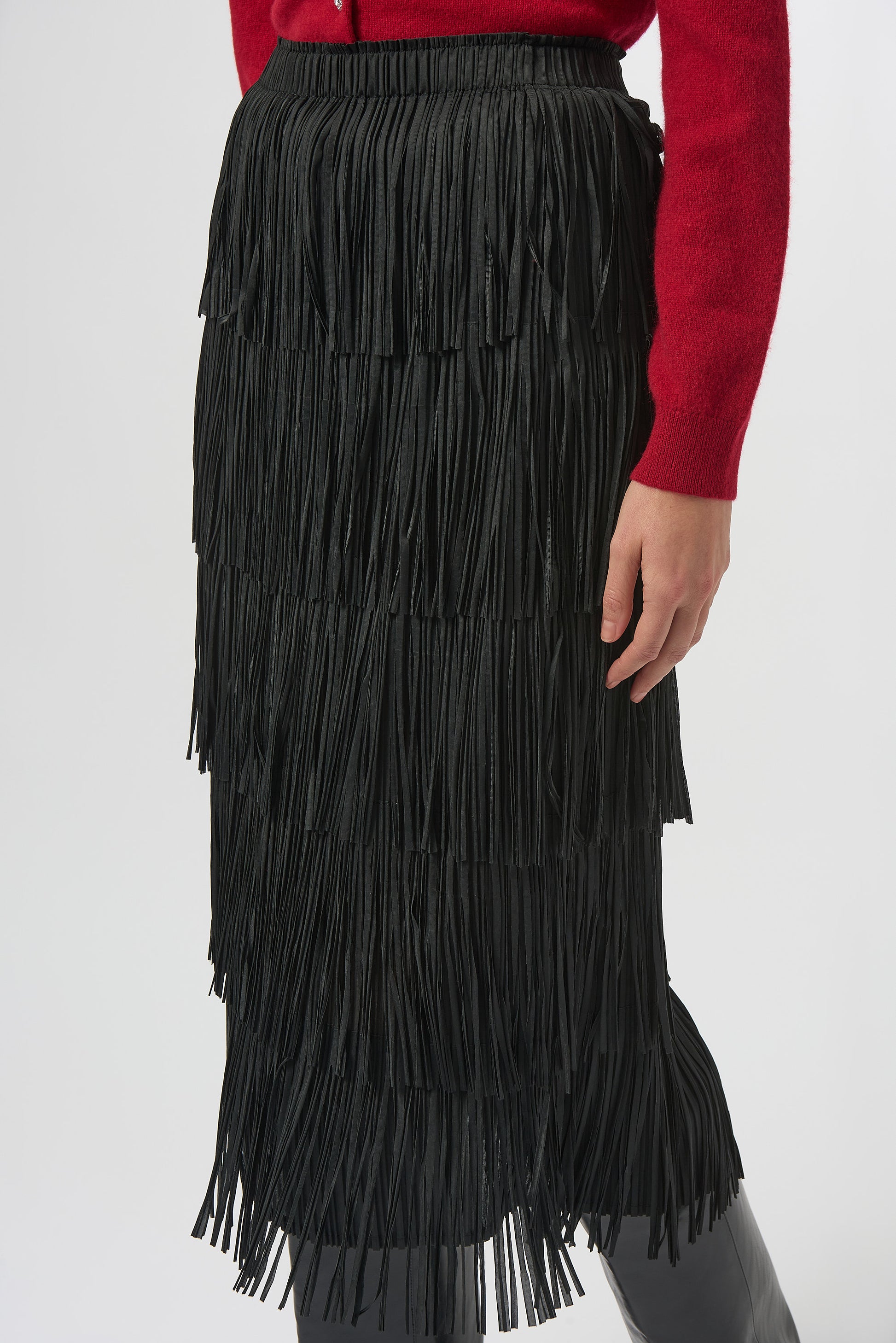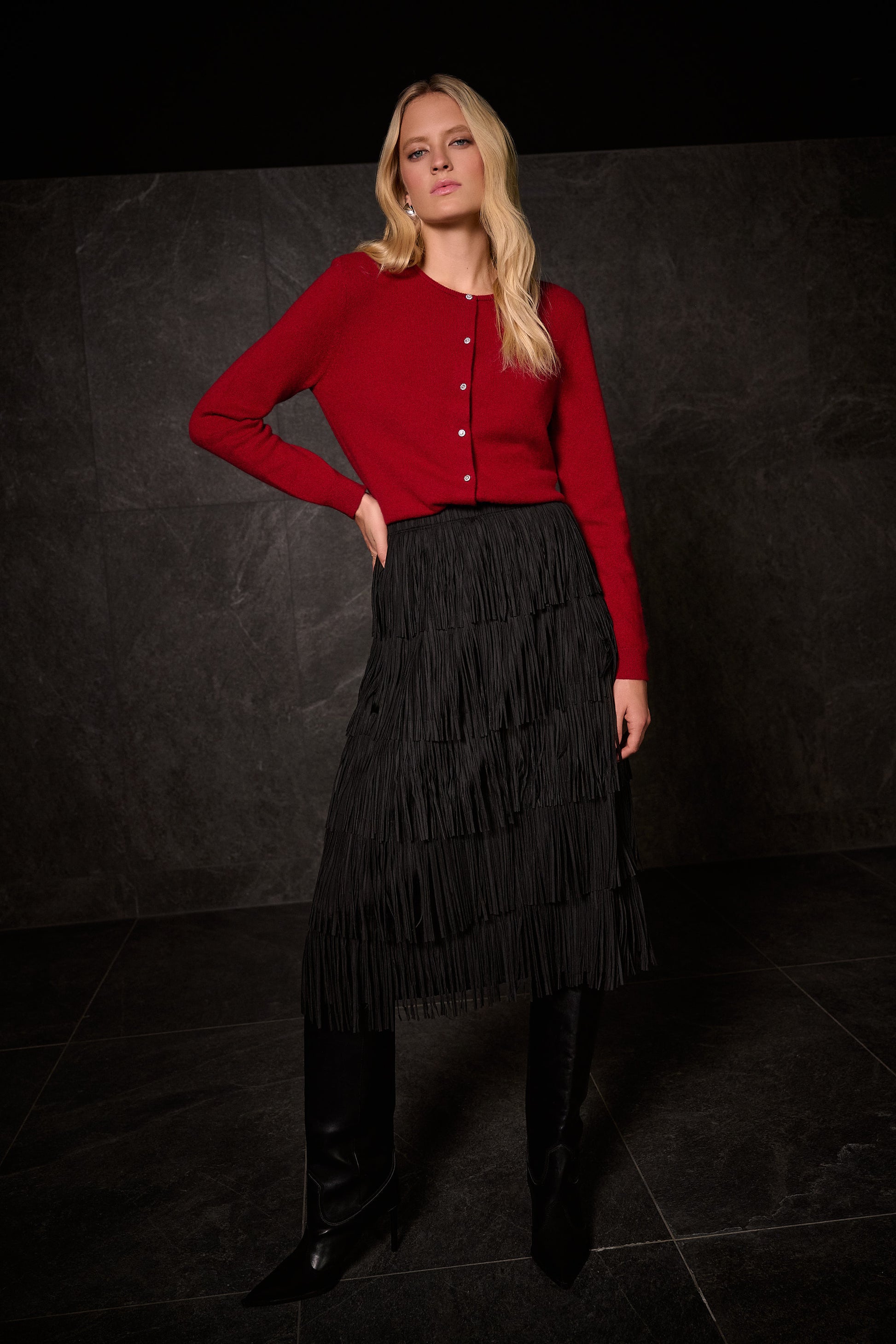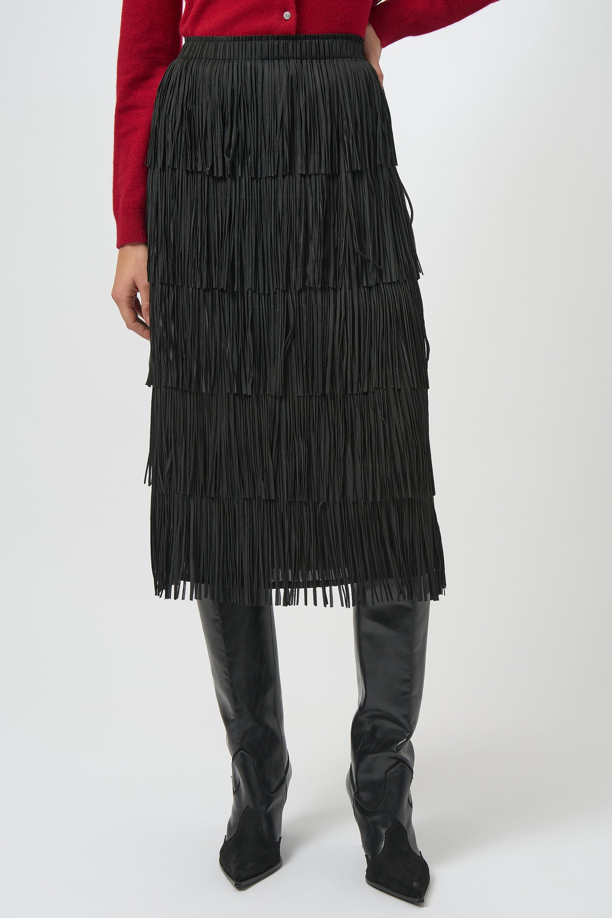Destaque con esta falda con plisado tipo lápiz, diseñada con delicadas capas de flecos que aportan movimiento y sofisticación. Su cintura elástica y su largo por debajo de la rodilla garantizan un ajuste cómodo y un estilo impecable.