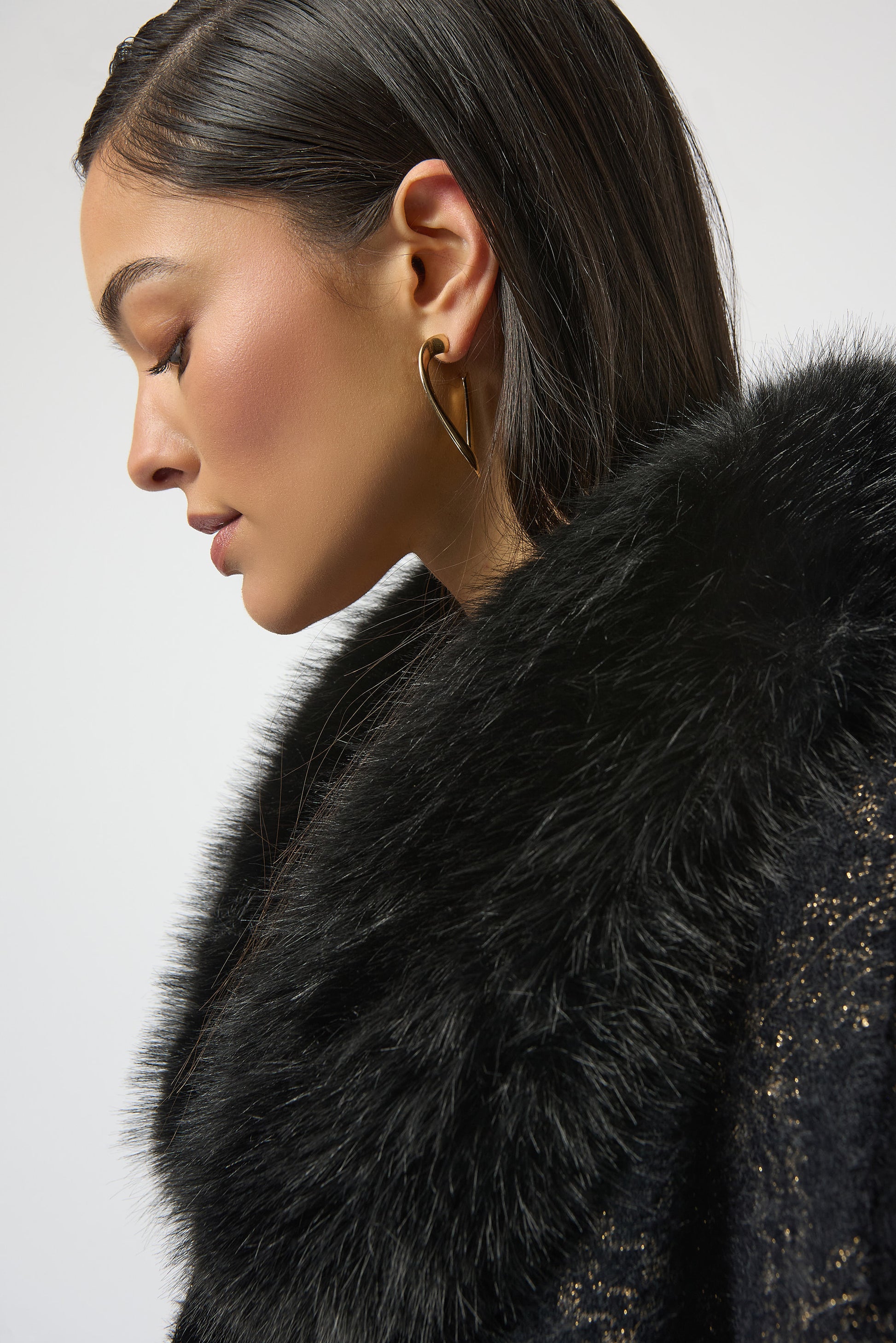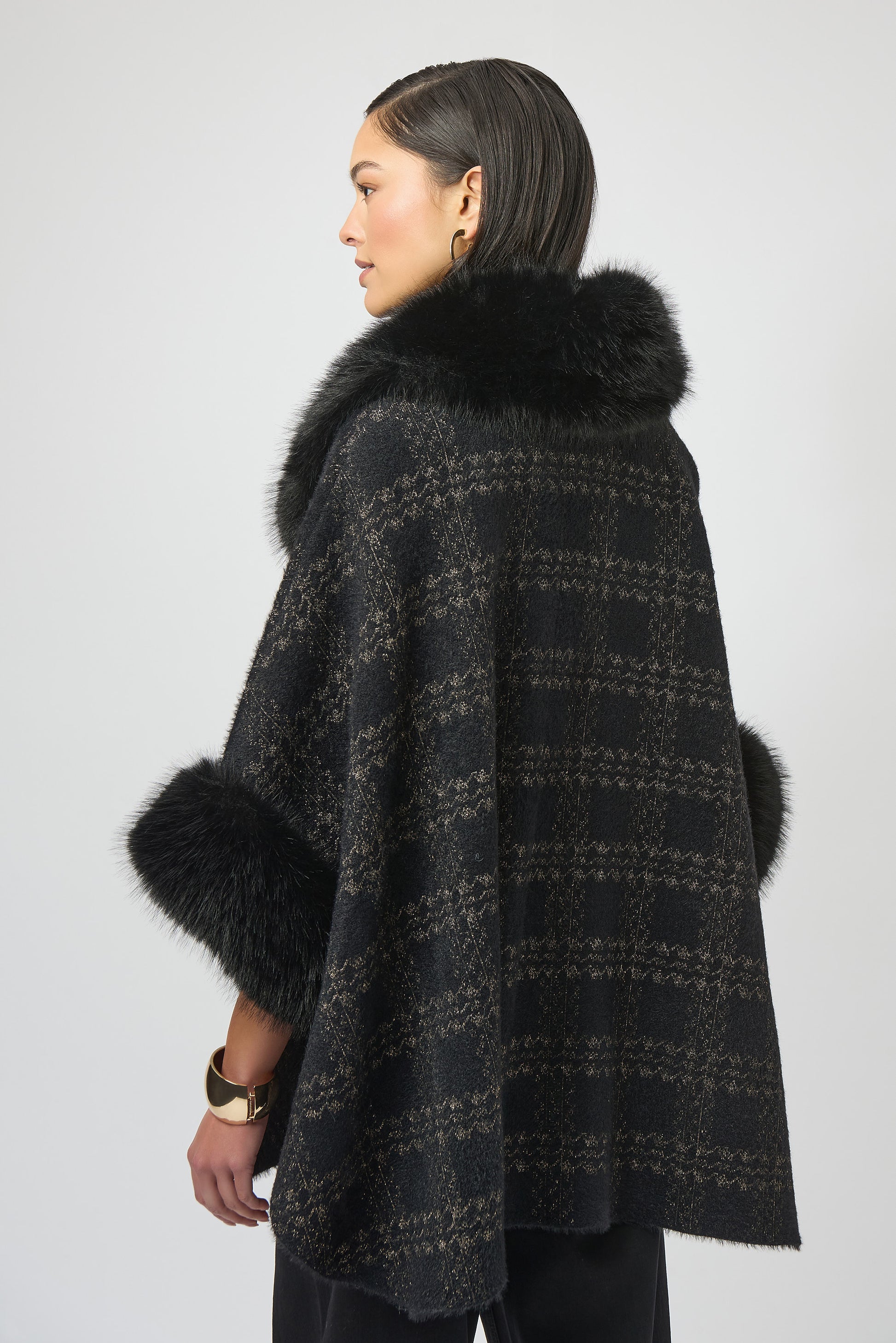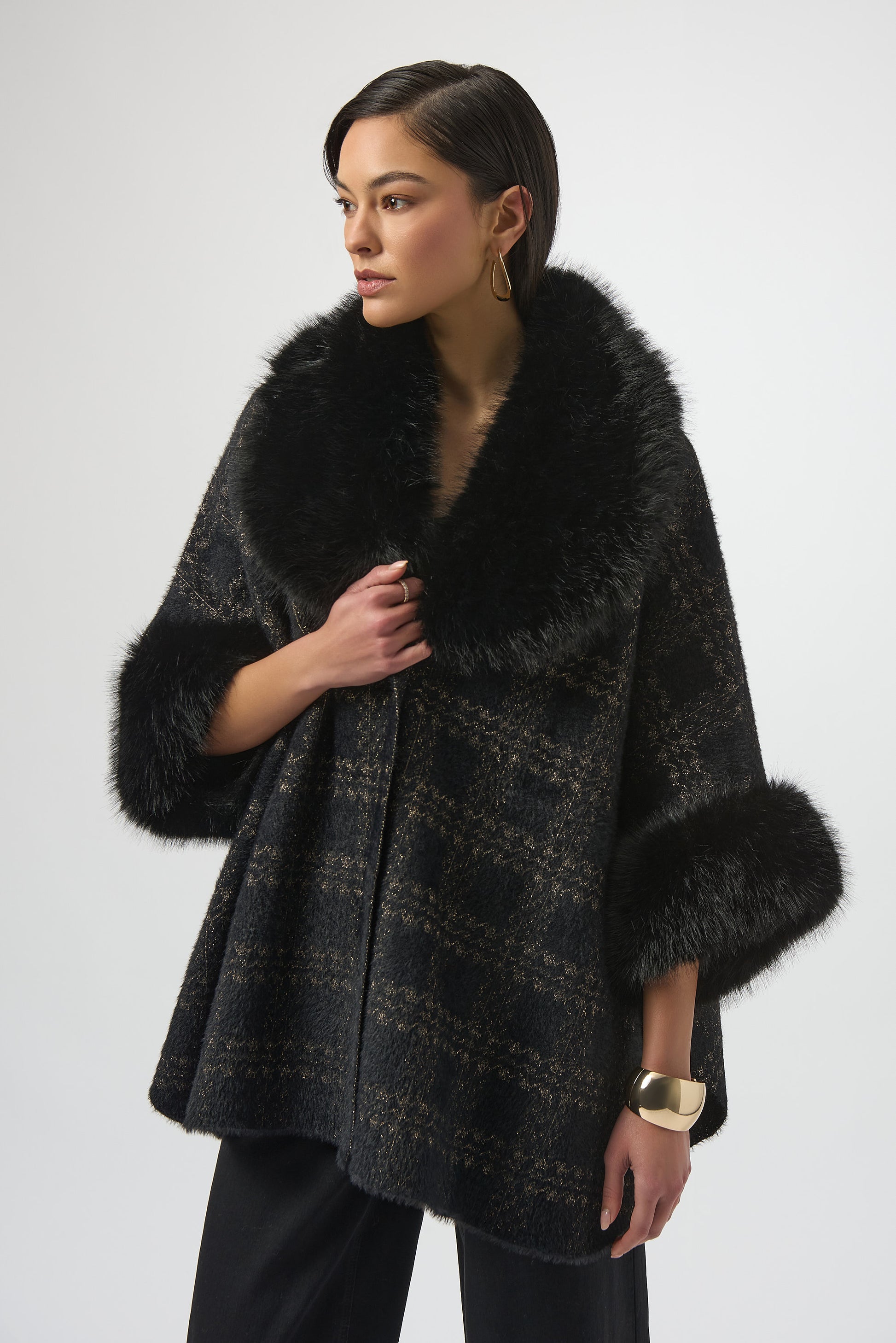 Esta sofisticada capa realza cualquier conjunto con su exquisito punto de jacquard con estampado de tartán y su atemporal cuello estilo chal. El ribete de piel sintética que adorna el cuello y los puños añade un toque de glamur, mientras que el cierre con un único y llamativo botón crea una elegante silueta drapeada.