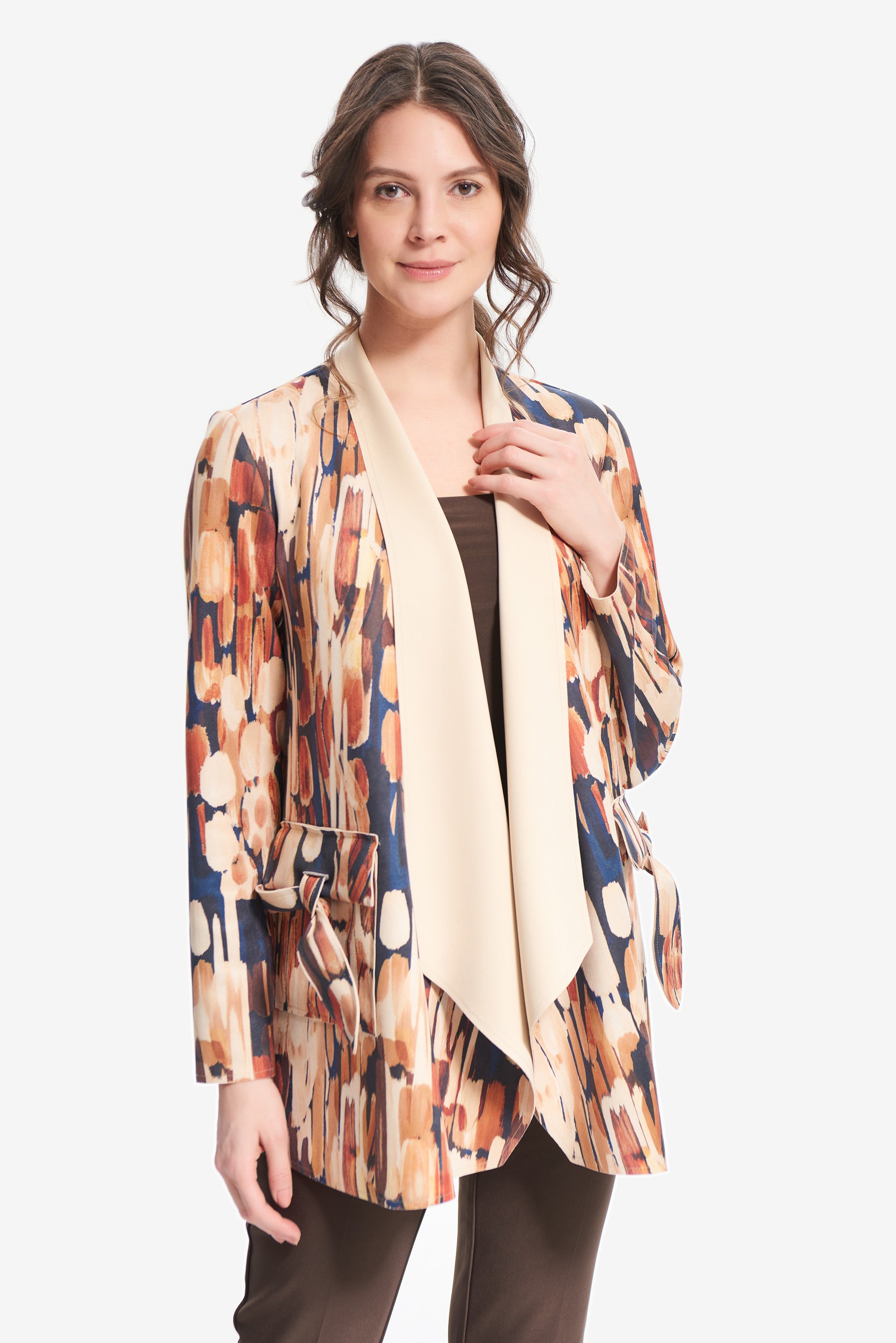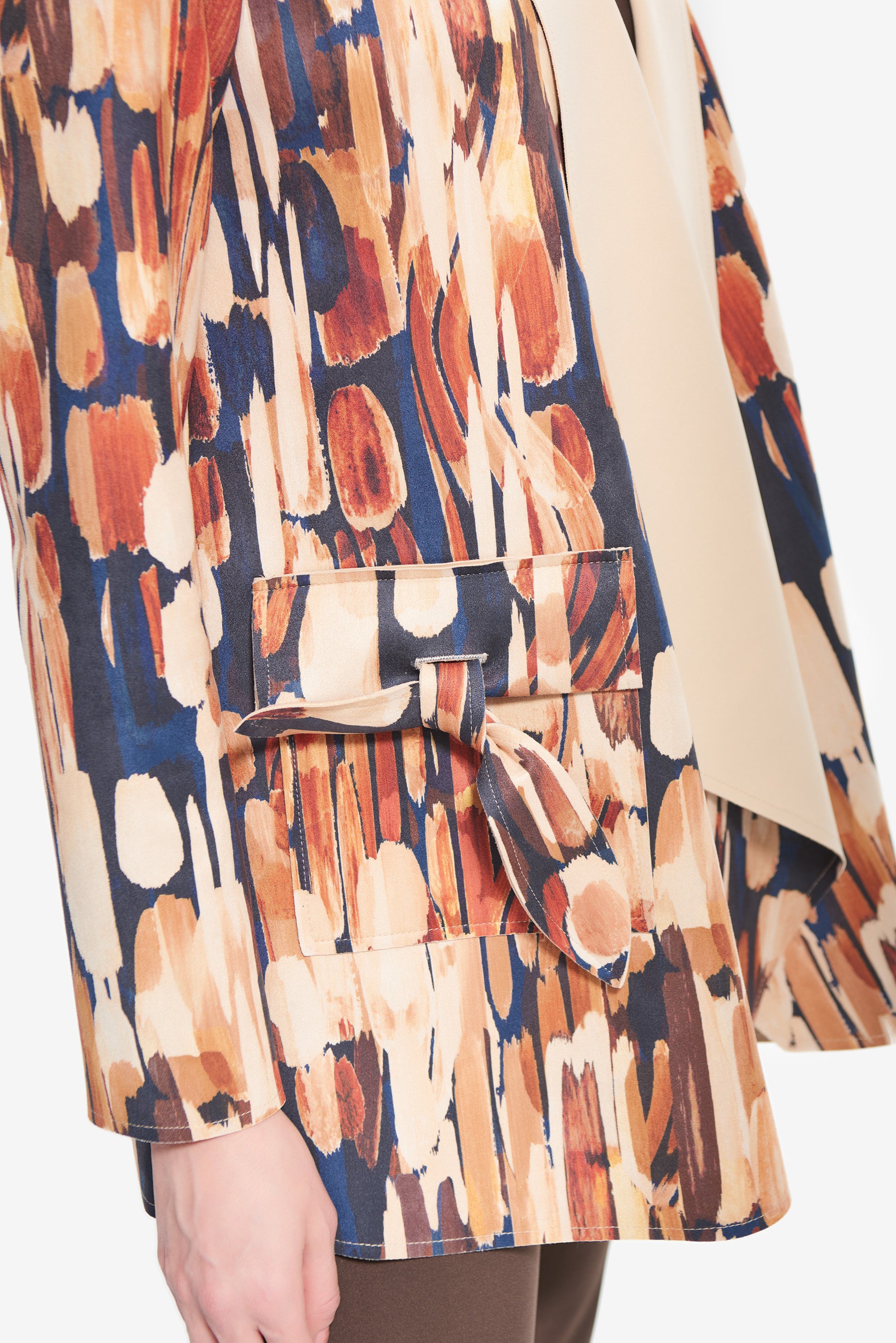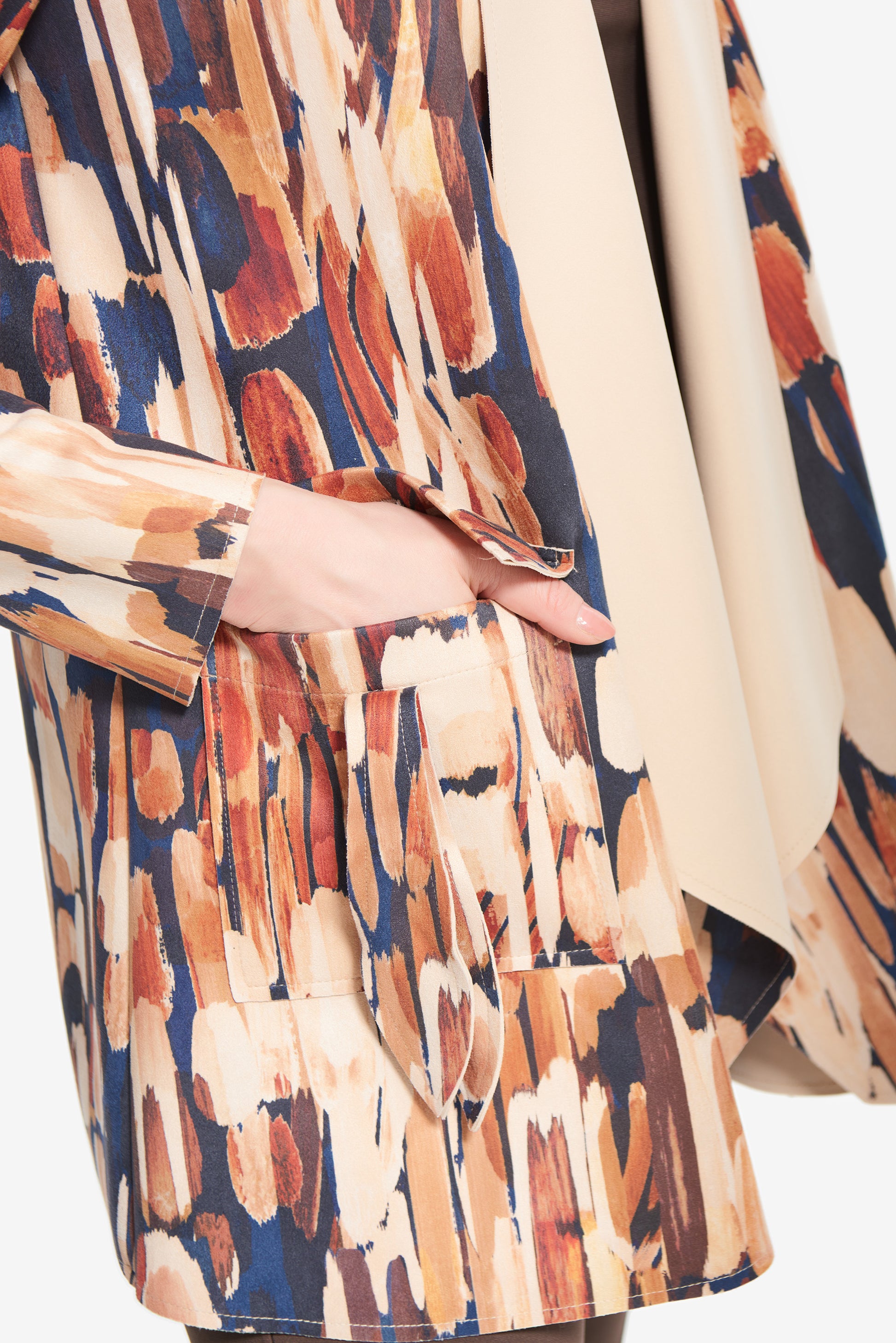 Abrigo para dama en tonos de café, naranja y azul, solapa en color beige, manga larga, bolsas de parche con tapadera y jareta para anudar.