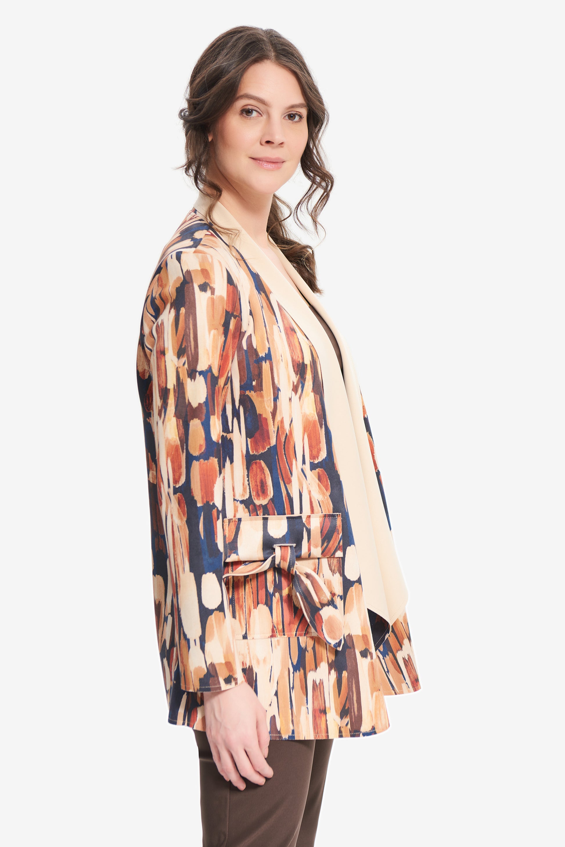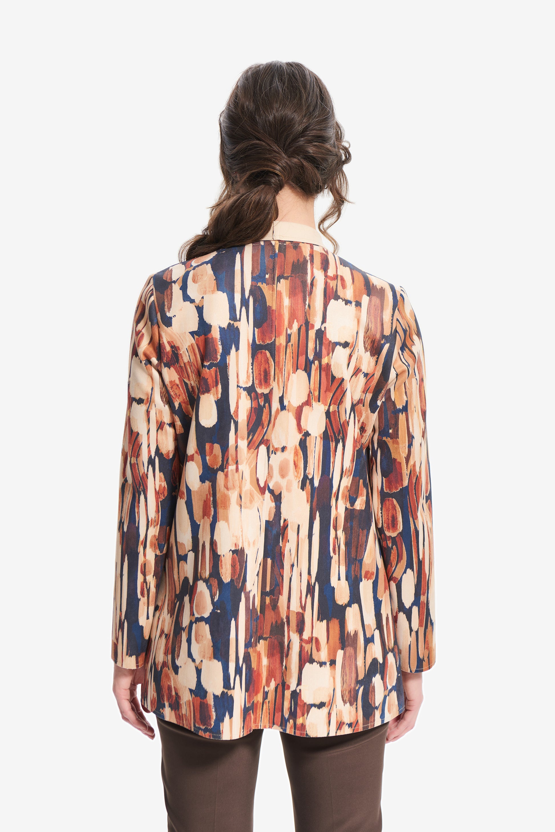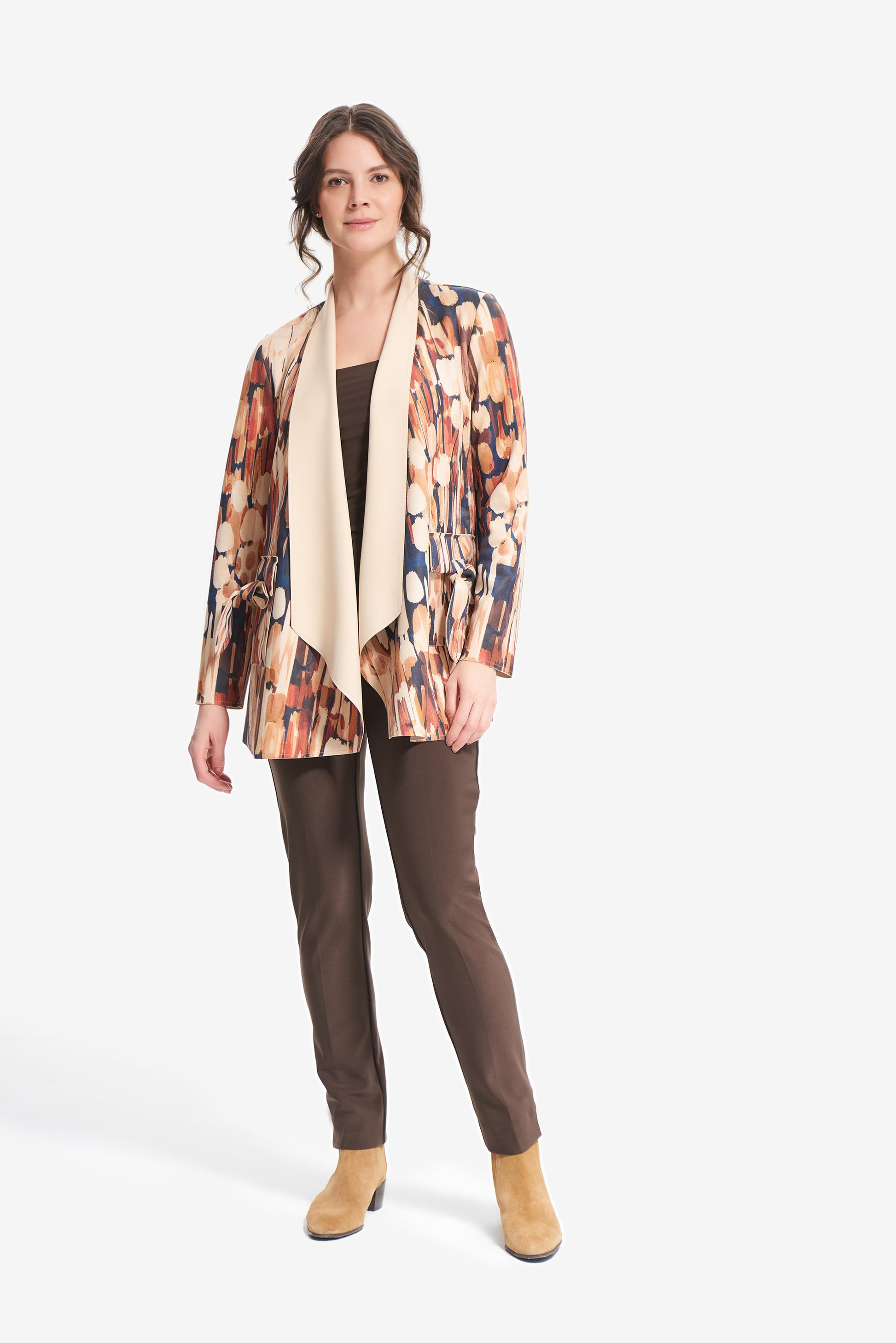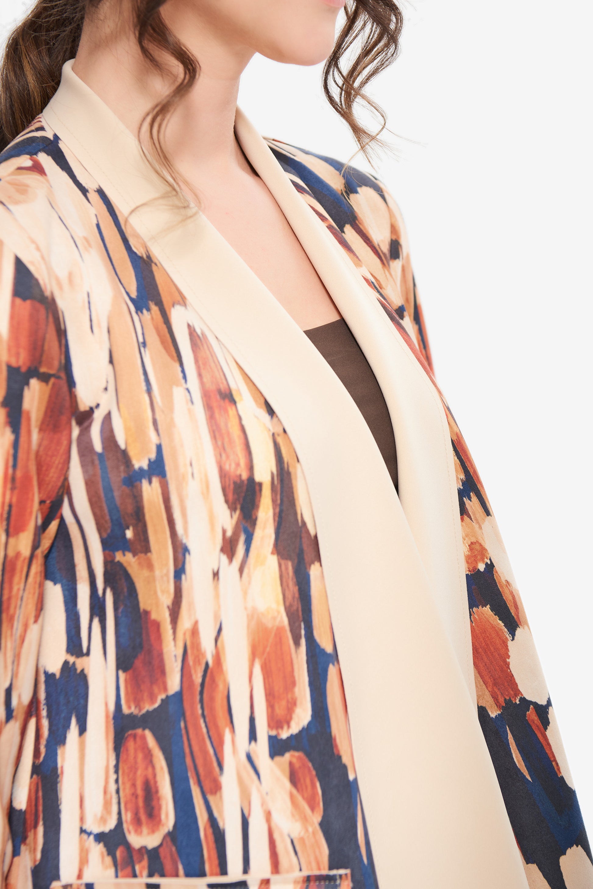 Abrigo para dama en tonos de café, naranja y azul, solapa en color beige, manga larga, bolsas de parche con tapadera y jareta para anudar.