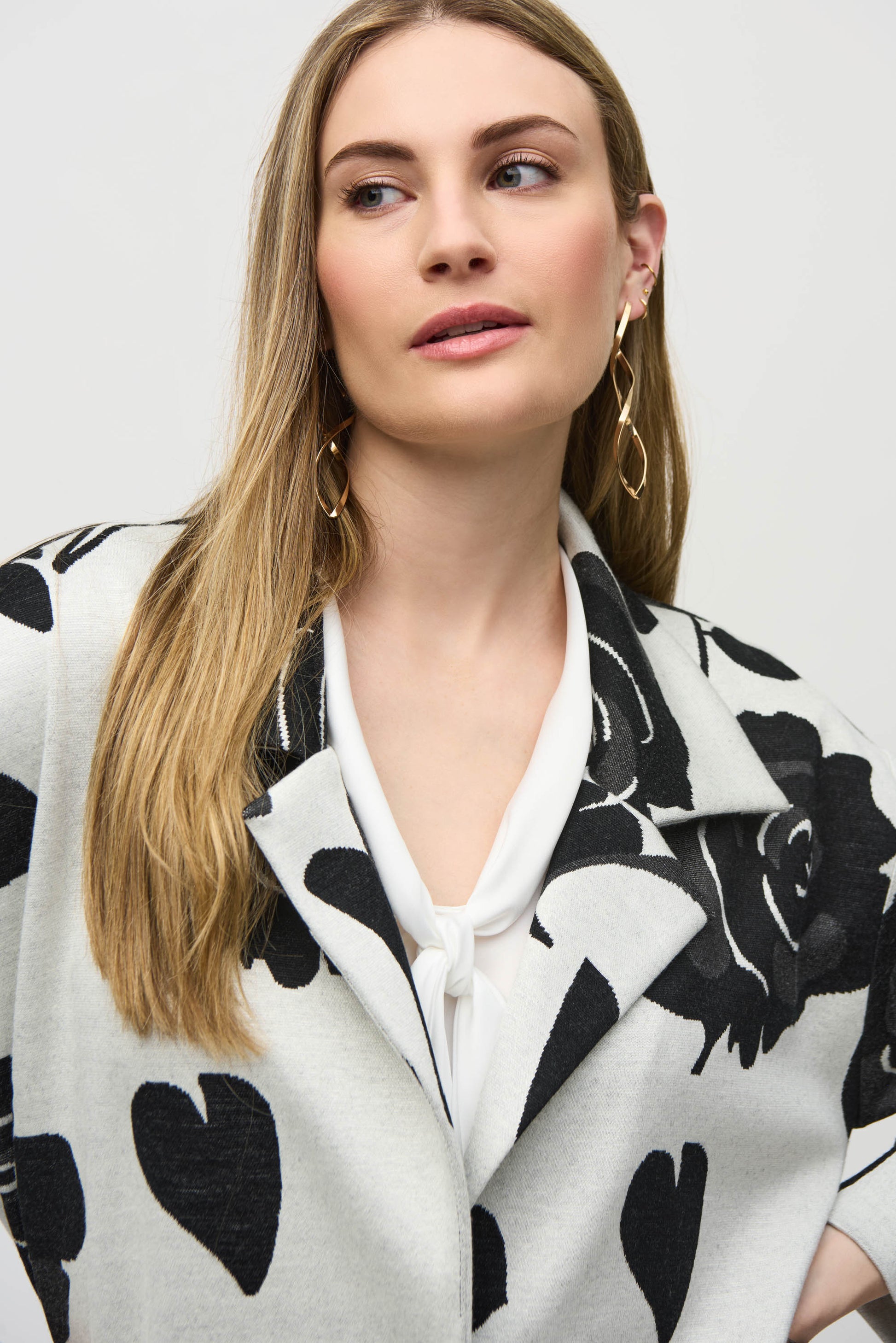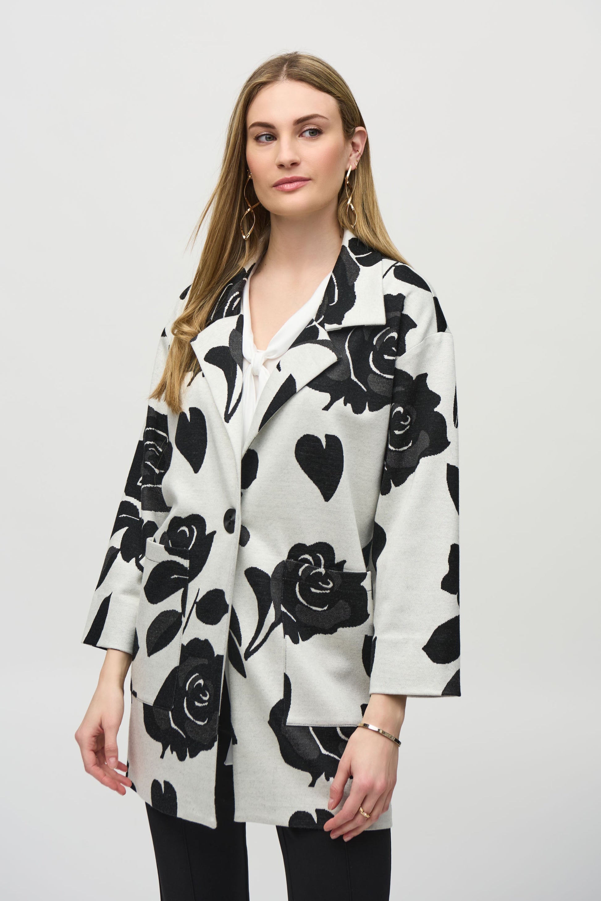 Abrigo estampado en fondo beige con flores negras con solapa , dos botones al frente y bolsas de parche, Composición 38% poliéster 30% acrílico 30% rayón 2% spandex