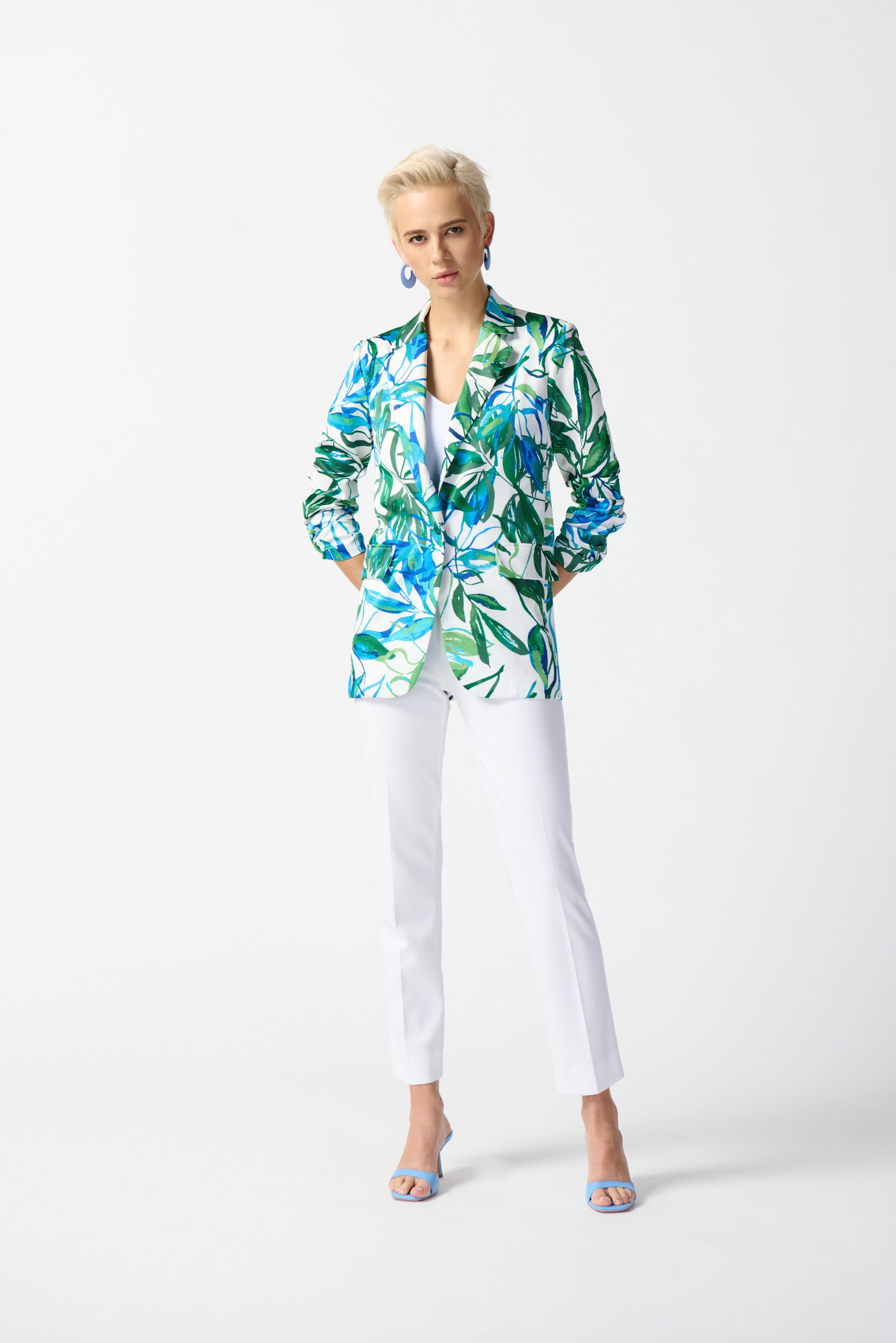 Este blazer es una fusión del estilo moderno y la elegancia atemporal. El delicado brillo del raso le da un aire lujoso a la prenda y su fascinante estampado tropical sirve como un alegre tapiz que mejorará cualquier conjunto. El corte recto del blazer garantiza un ajuste favorecedor, mientras que el cuello con muesca, el cierre con un botón y los falsos bolsillos con solapa en la parte delantera rinden homenaje a un básico muy querido del armario.