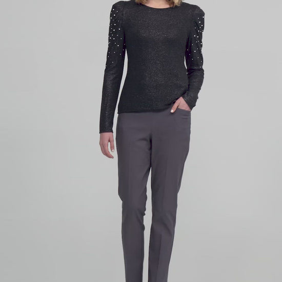 Blusa para dama, tejida, color gris oscuro con hilos color plata, manga larga, cuello redondo, incrustación de perlas en las mangas.