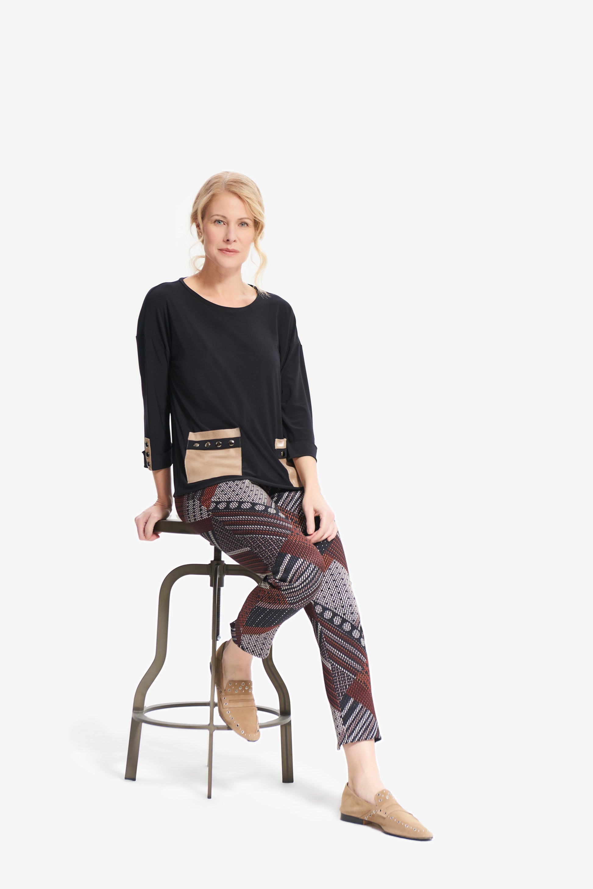 Blusa para dama color negro, cuello redondo, con bolsas de parche al frente en piel sintética color beige, franja horizontal sobre bolsas con estoperoles metálicos, manga 3/4 con aplicación de piel color beige y estoperoles.