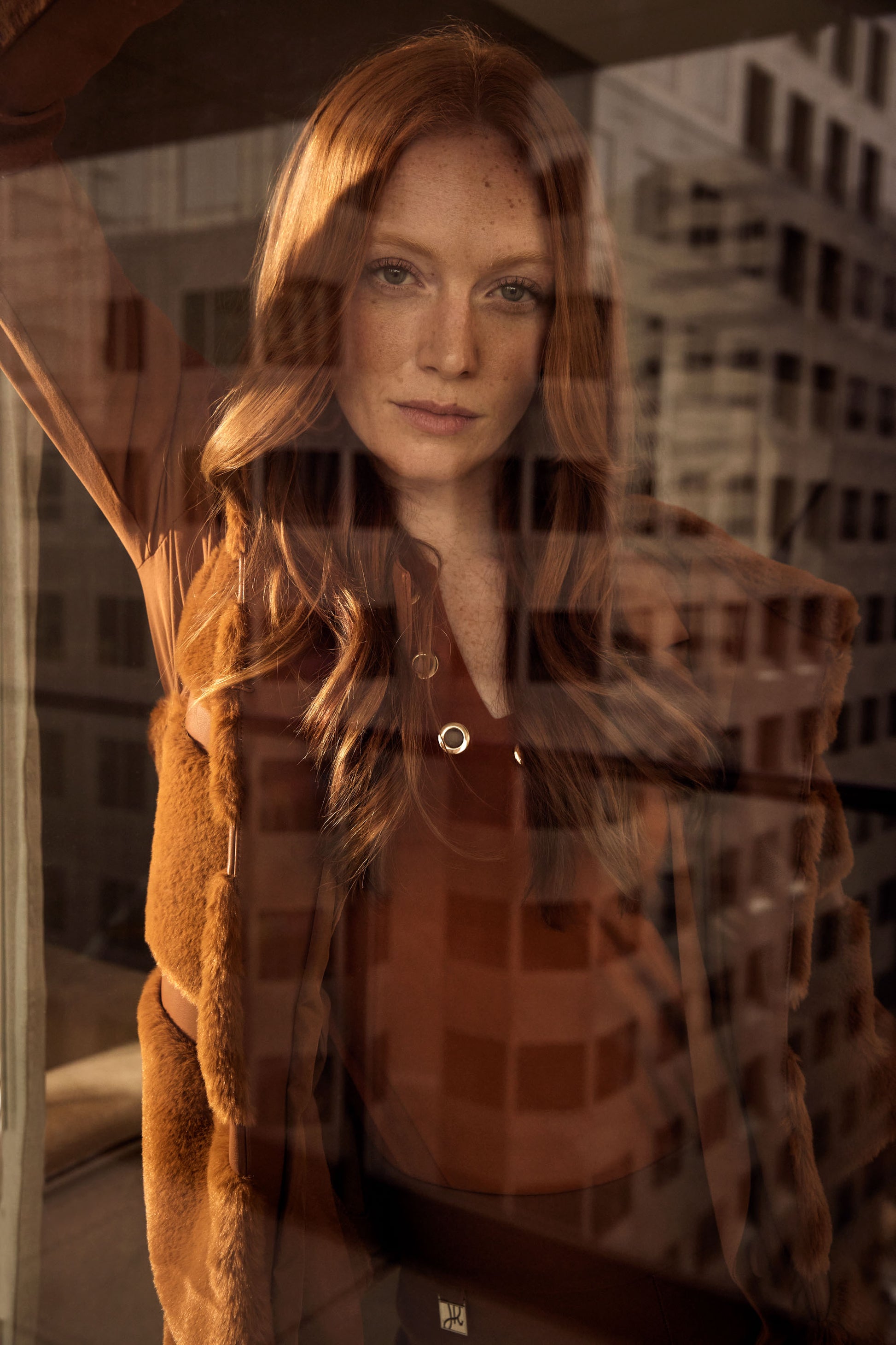 Blusa color café, escote en "V" con ojillos metálicos a los lados, manga 3/4