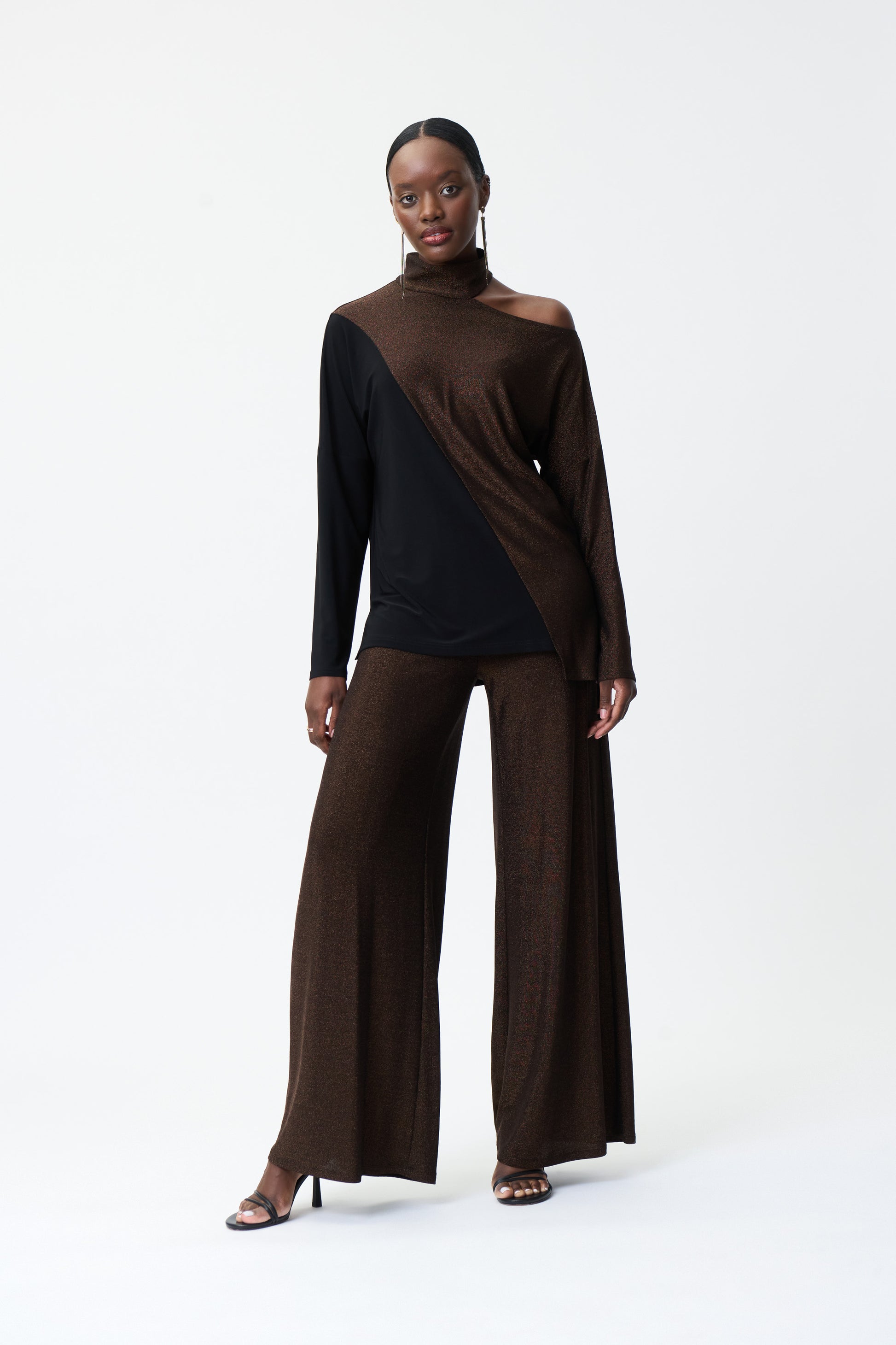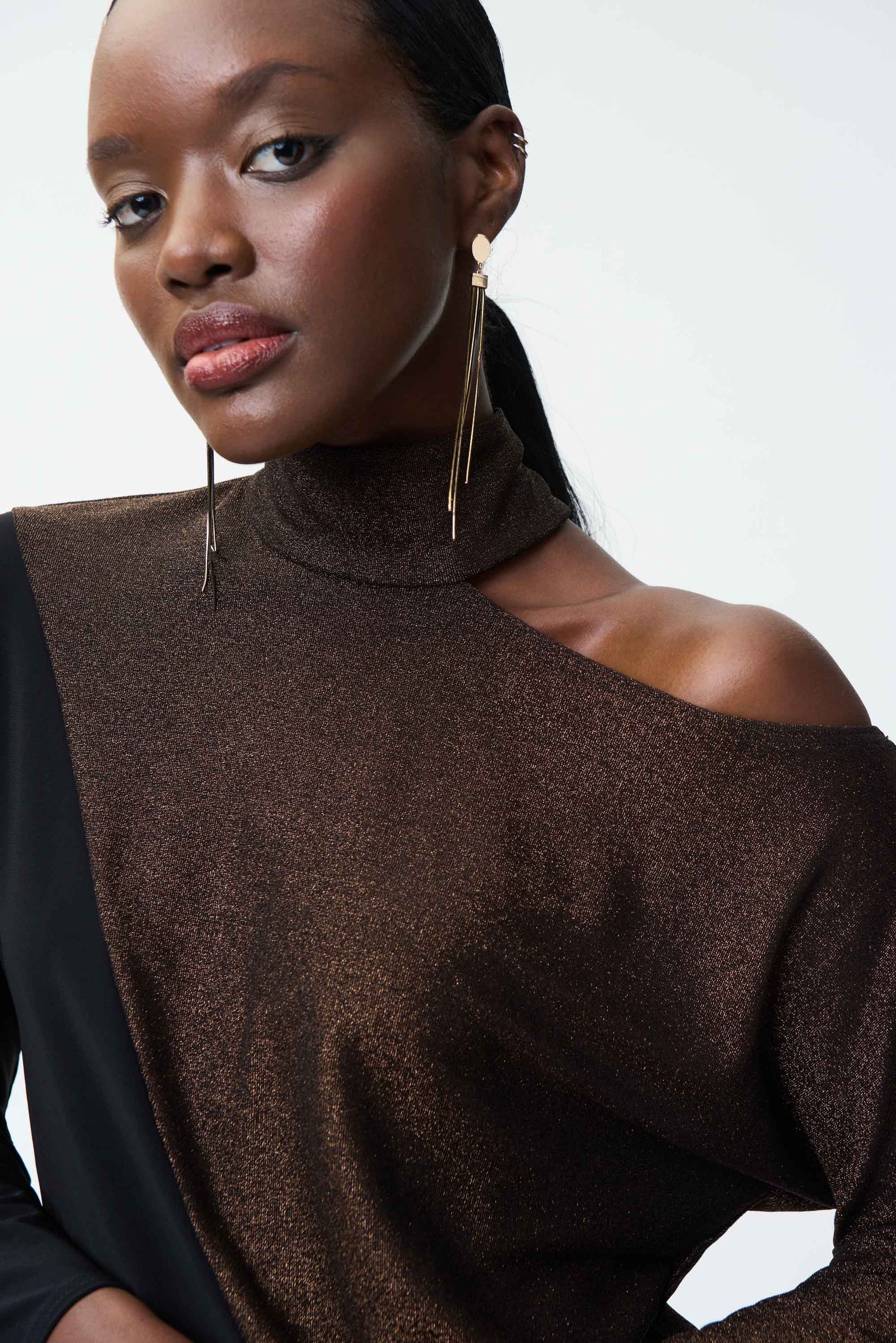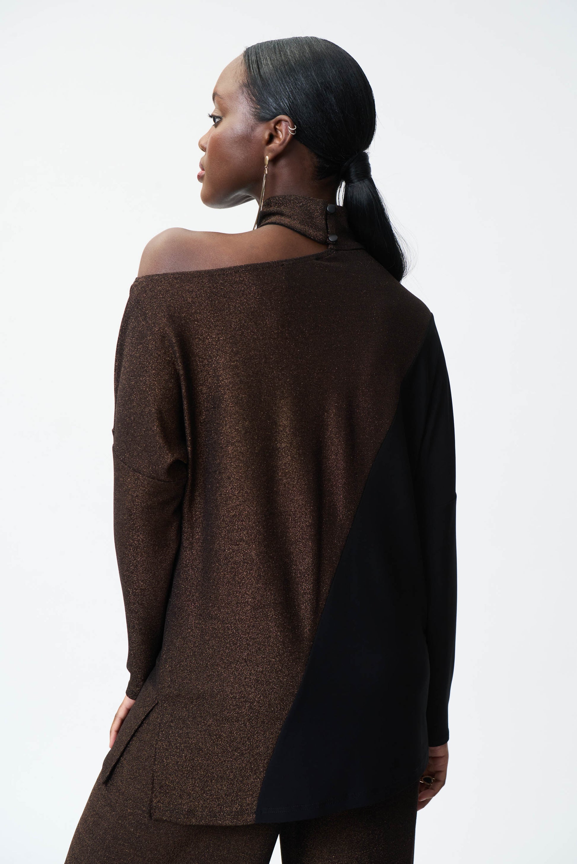 Blusa color café metálico con bloque de color en diagonal color negro, manga larga, frente asimétrico, hombro descubierto de un solo lado, cuello alto.