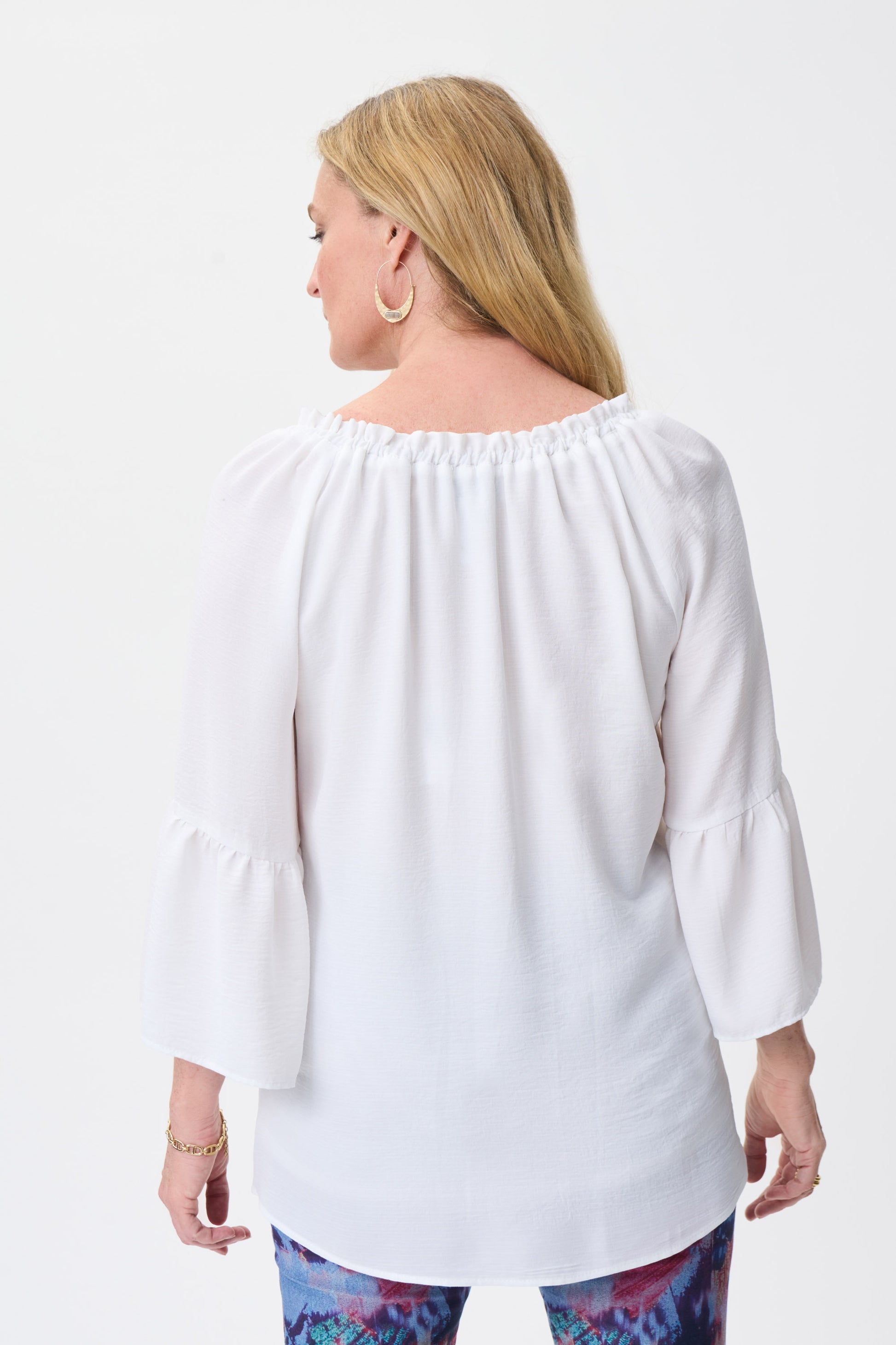 Blusa color blanco, con escarolas en el cuello, escote en “V” profundo, con jaretas que salen del cuello, manga 3/4 con puños con volantes.