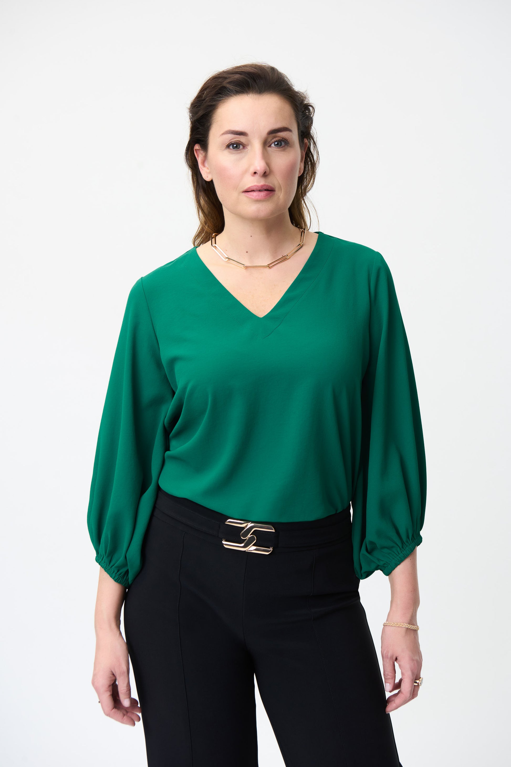 Blusa color verde jade, cuello "V", manga 3/4 abullonada con resorte en el puño, aberturas laterales, plisado en la espalda.