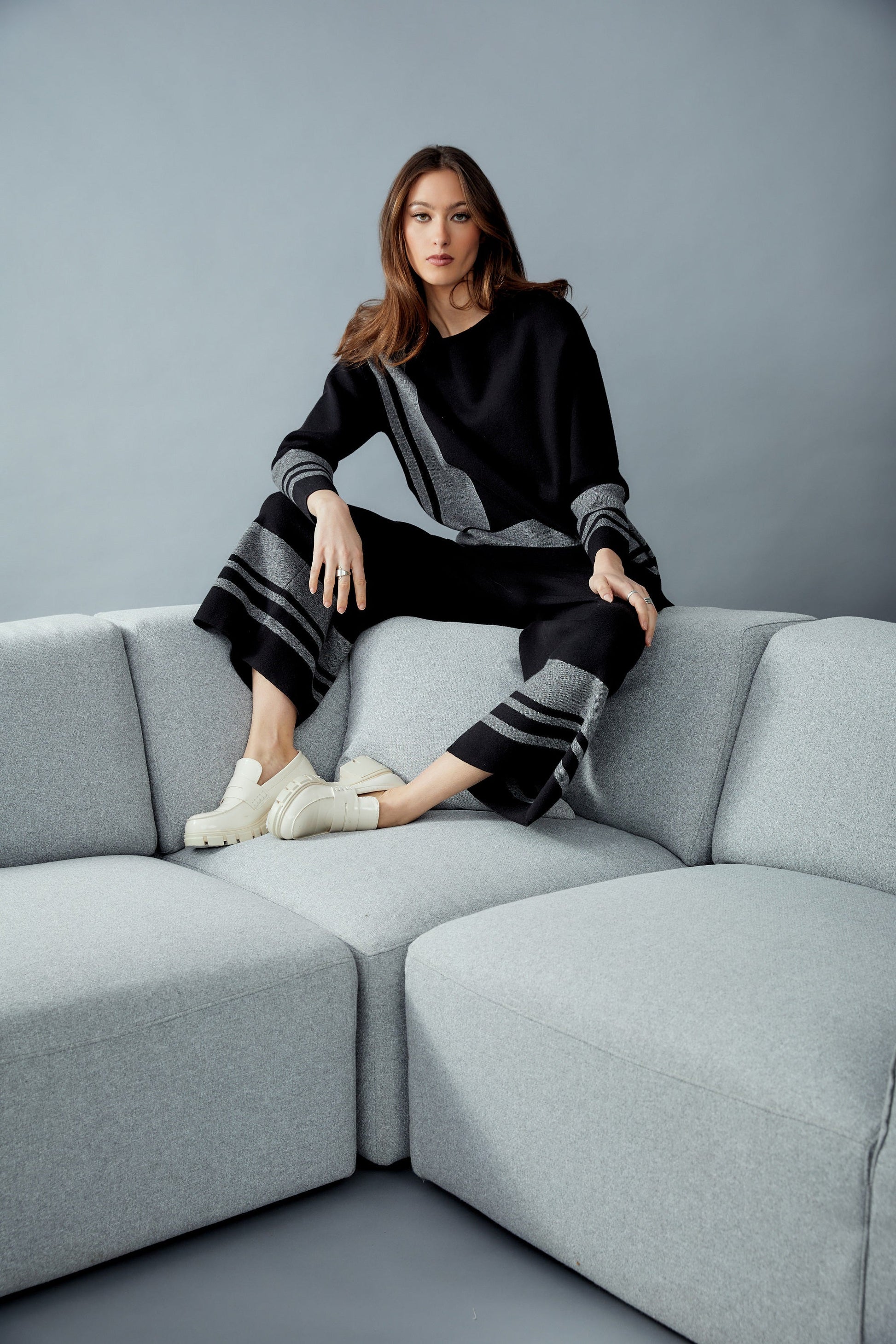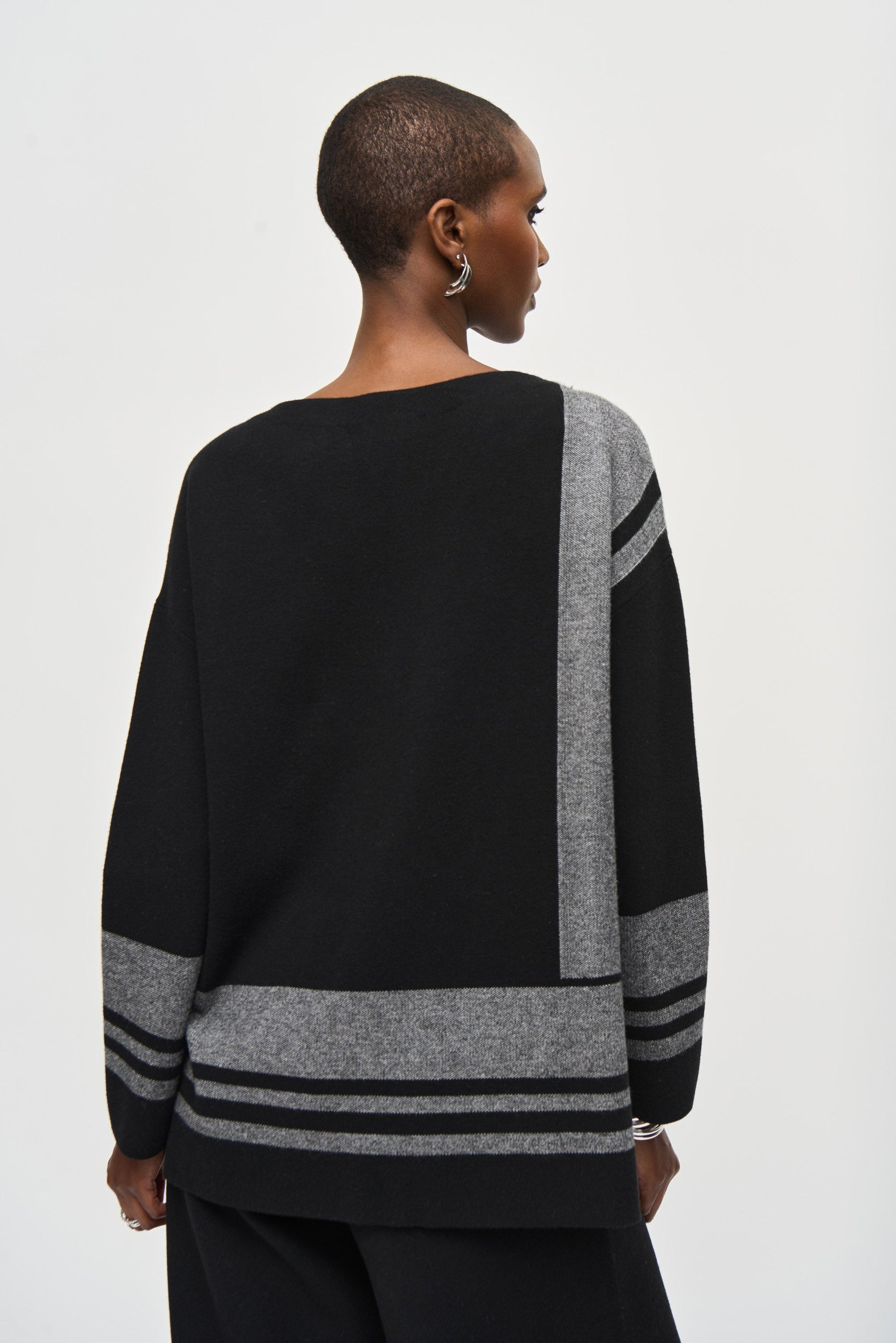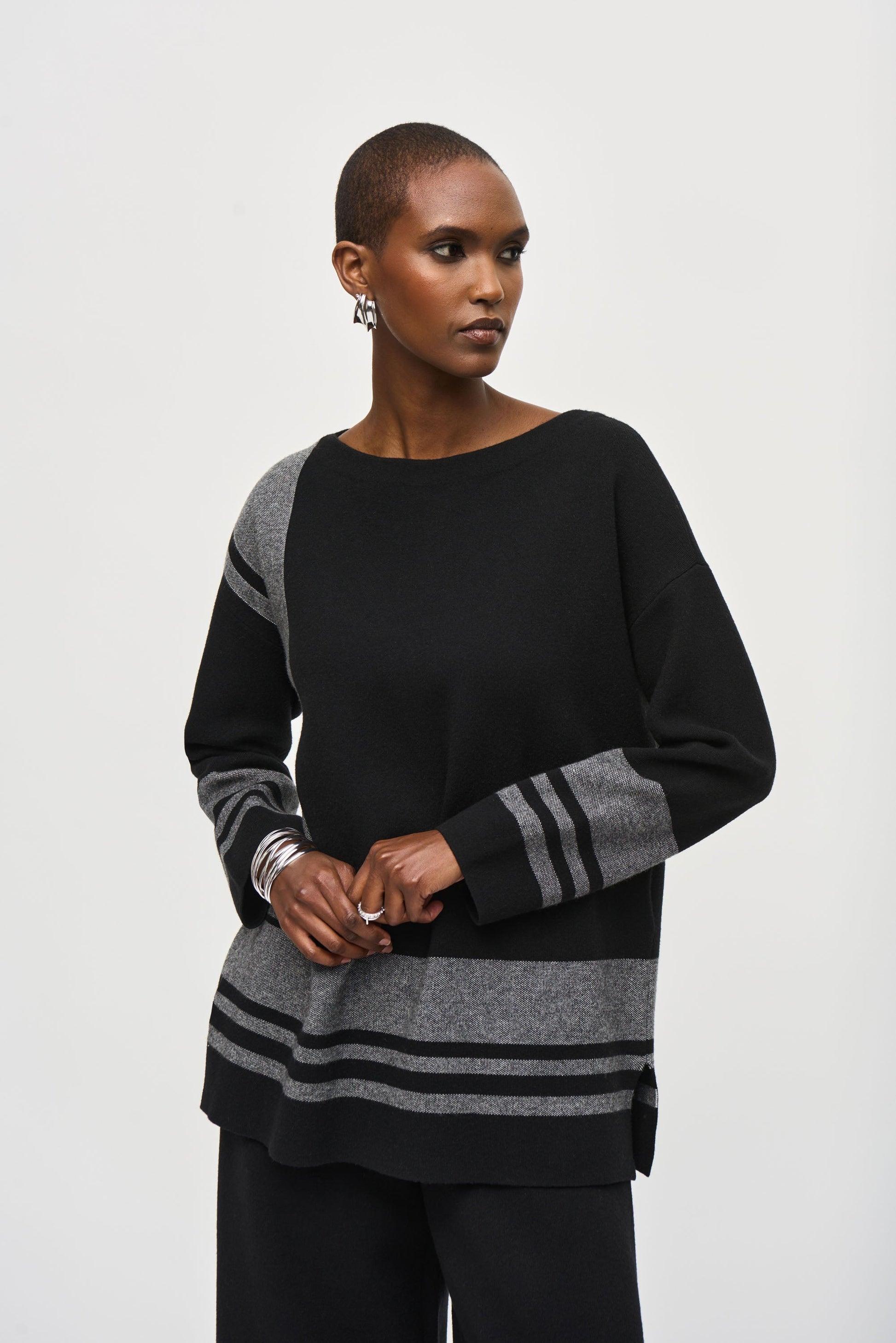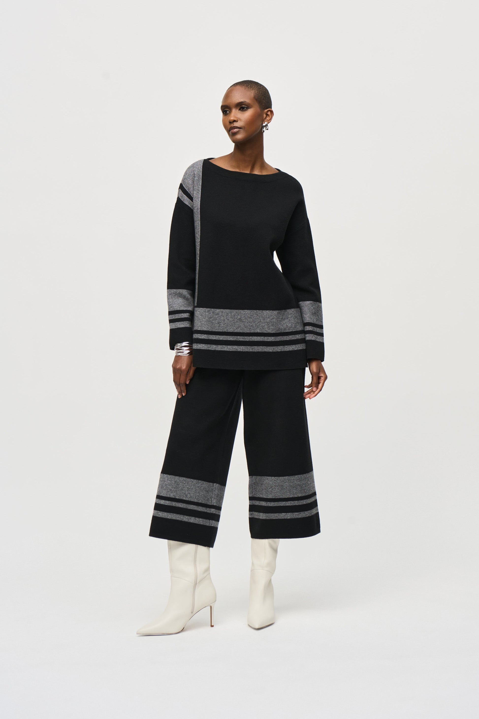 Elegantemente adornada con un cuello barco y mangas largas rectas, esta belleza hasta el muslo cuenta con un patrón distintivo de mármol intercalado con rayas universitarias clásicas.