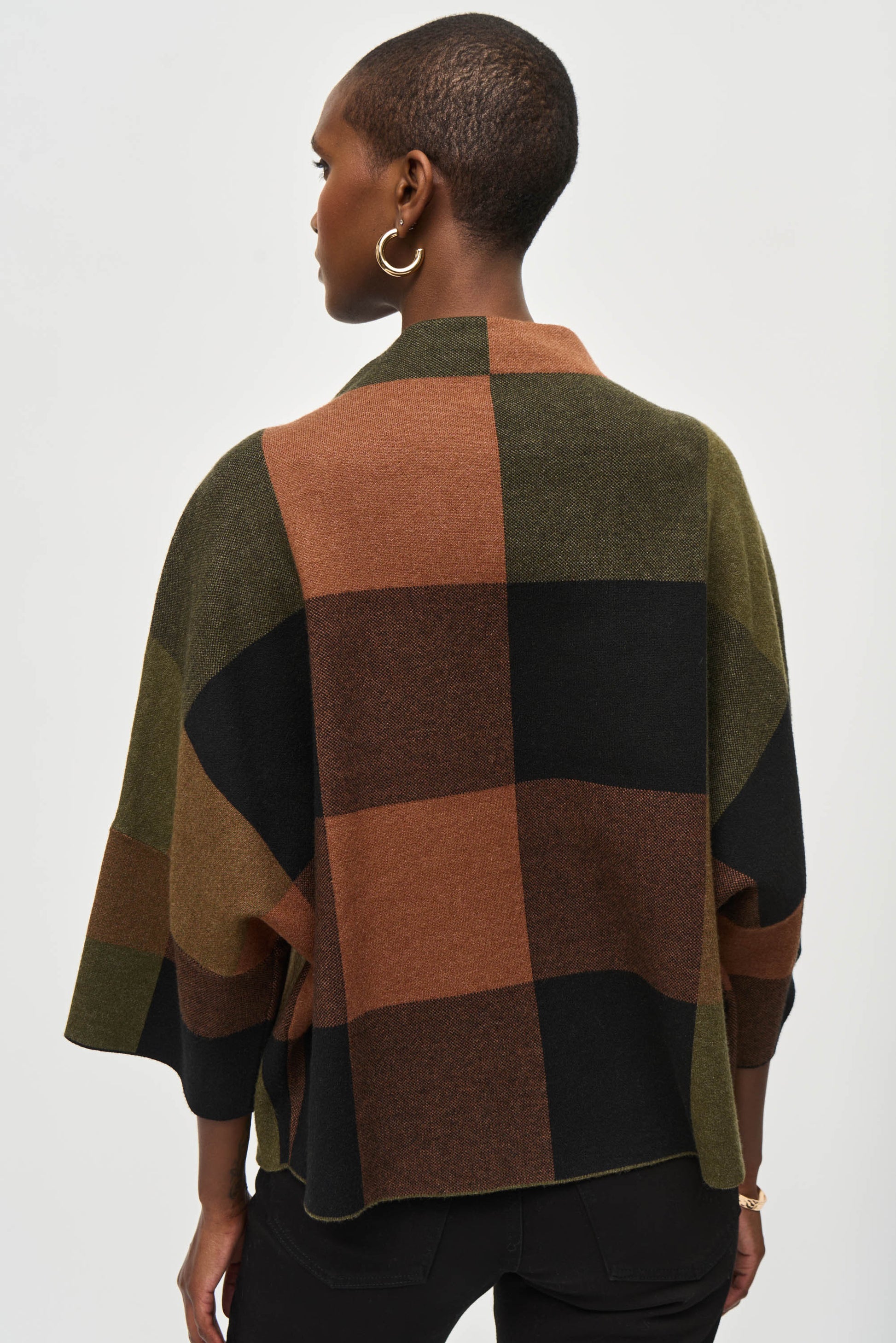 Esta prenda de cuello alto presenta un patrón geométrico jaspeado único, realzado por espléndidas mangas dolmán cortadas a 3/4 de largo. Se trata de un diseño corto adornado con elegantes botones.