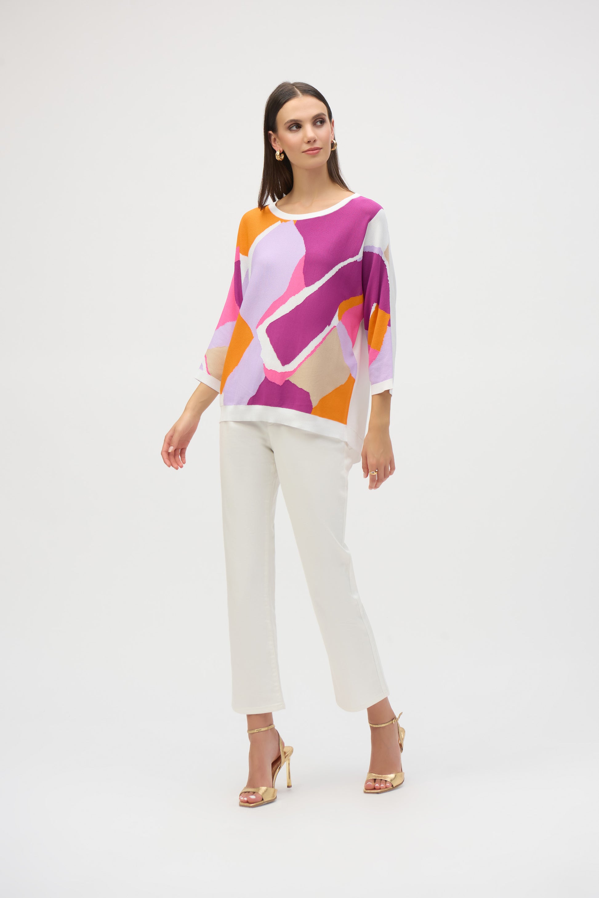 Este colorido jersey de punto presenta un fascinante diseño abstracto que resulta todo un espectáculo visual. Con un favorecedor cuello de barco, unas mangas dolmán tres cuartos y un bajo asimétrico, esta impresionante pieza sin duda animará cualquier conjunto que lleve.