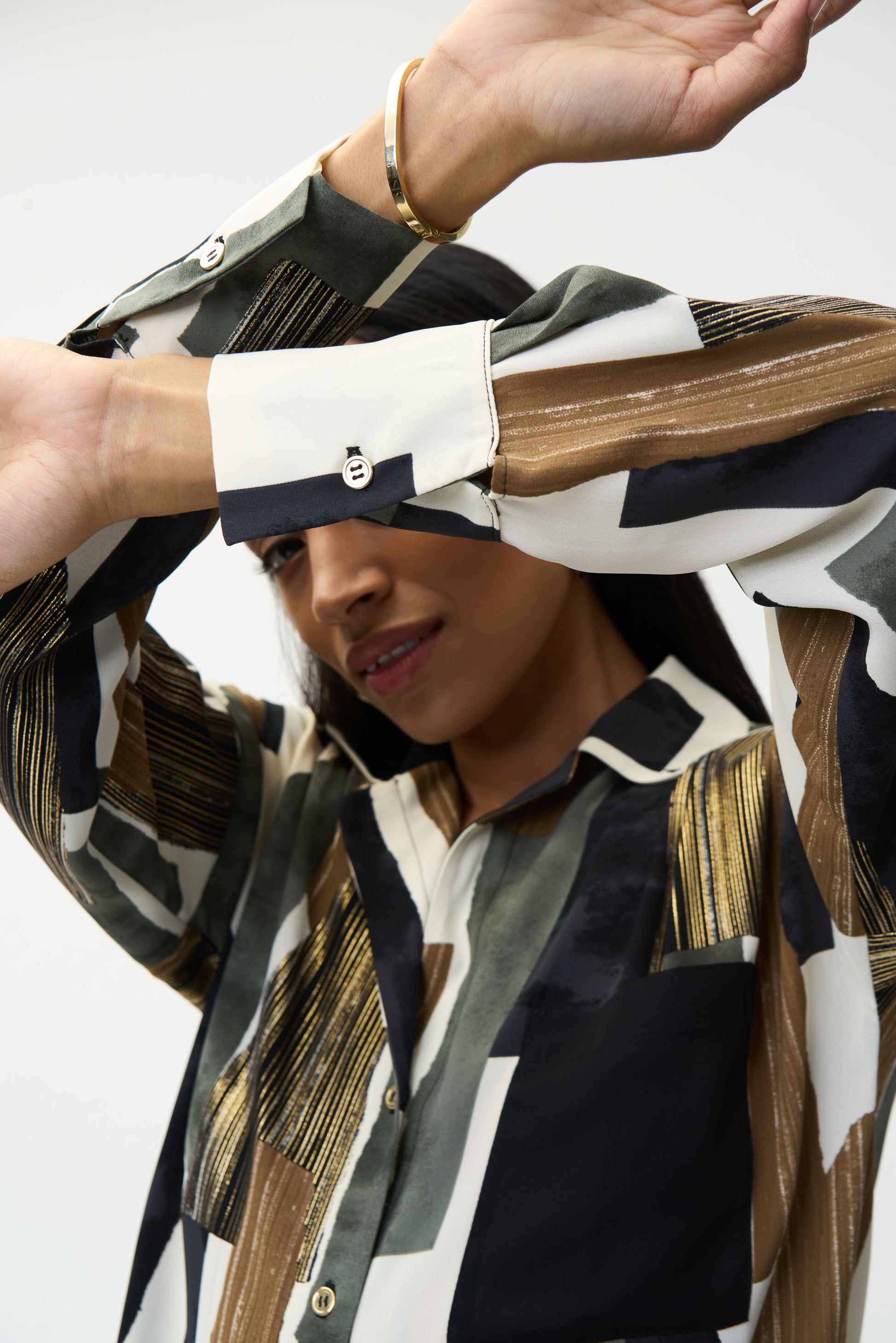 Blusa con estampado geometrico en colores verde olivo, cafŽ y negro, manga larga, corte camisero, trasero largo.