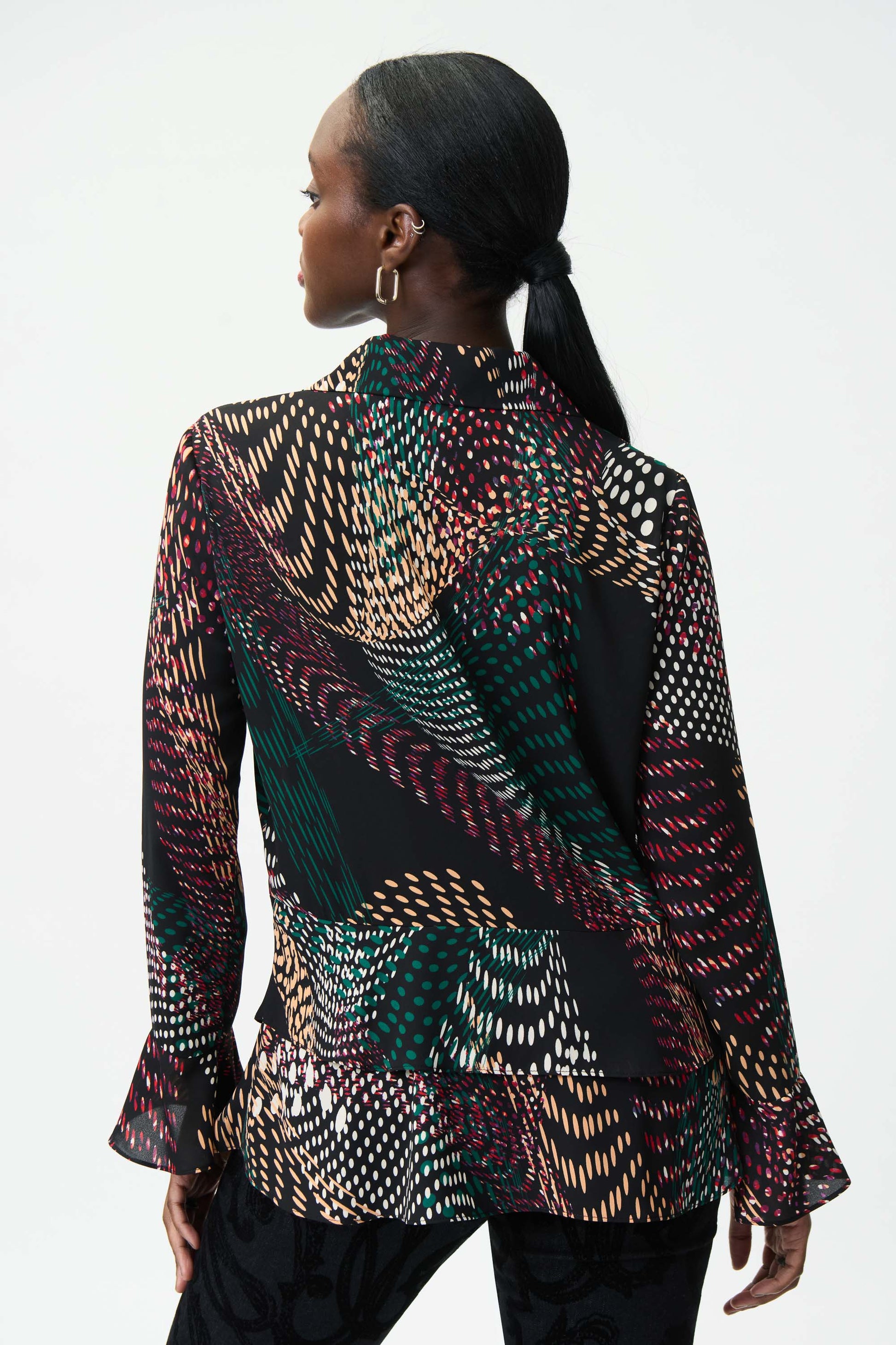 Blusa negra con estampado abstracto en colores verde, beige, blanco y granada, manga larga con puños acampanados, corte camisero, corte en capas que forma faldón sobre la cintura