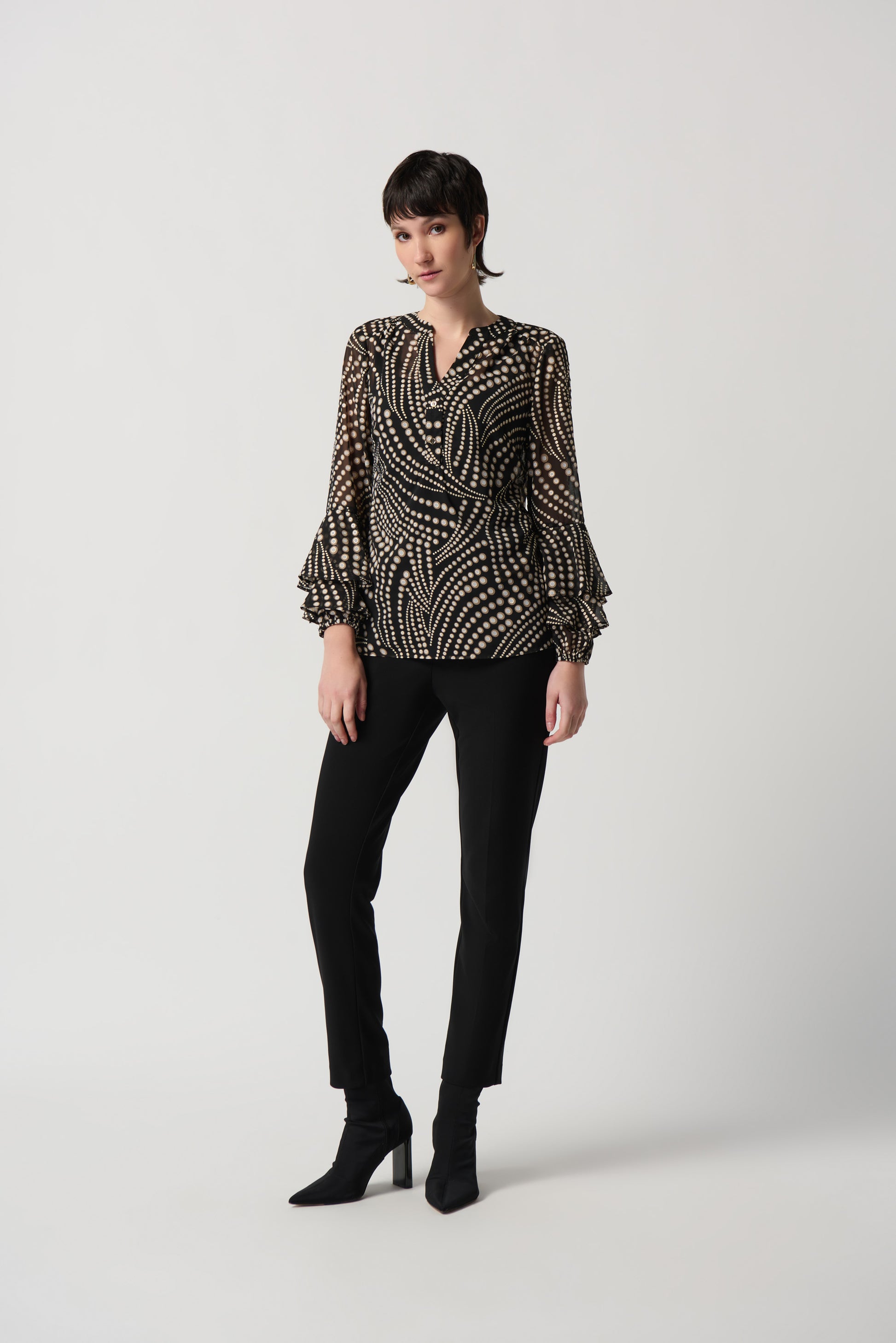 Gracias a su elegante estampado de lunares metalizados, cuello mao y mangas largas con volantes en los puños, esta camiseta se convertirá en su prenda básica para eventos formales. Confeccionado con una lujosa tela de gasa, su delicada composición aporta ligereza y un toque atrevido pensado para que destaque.