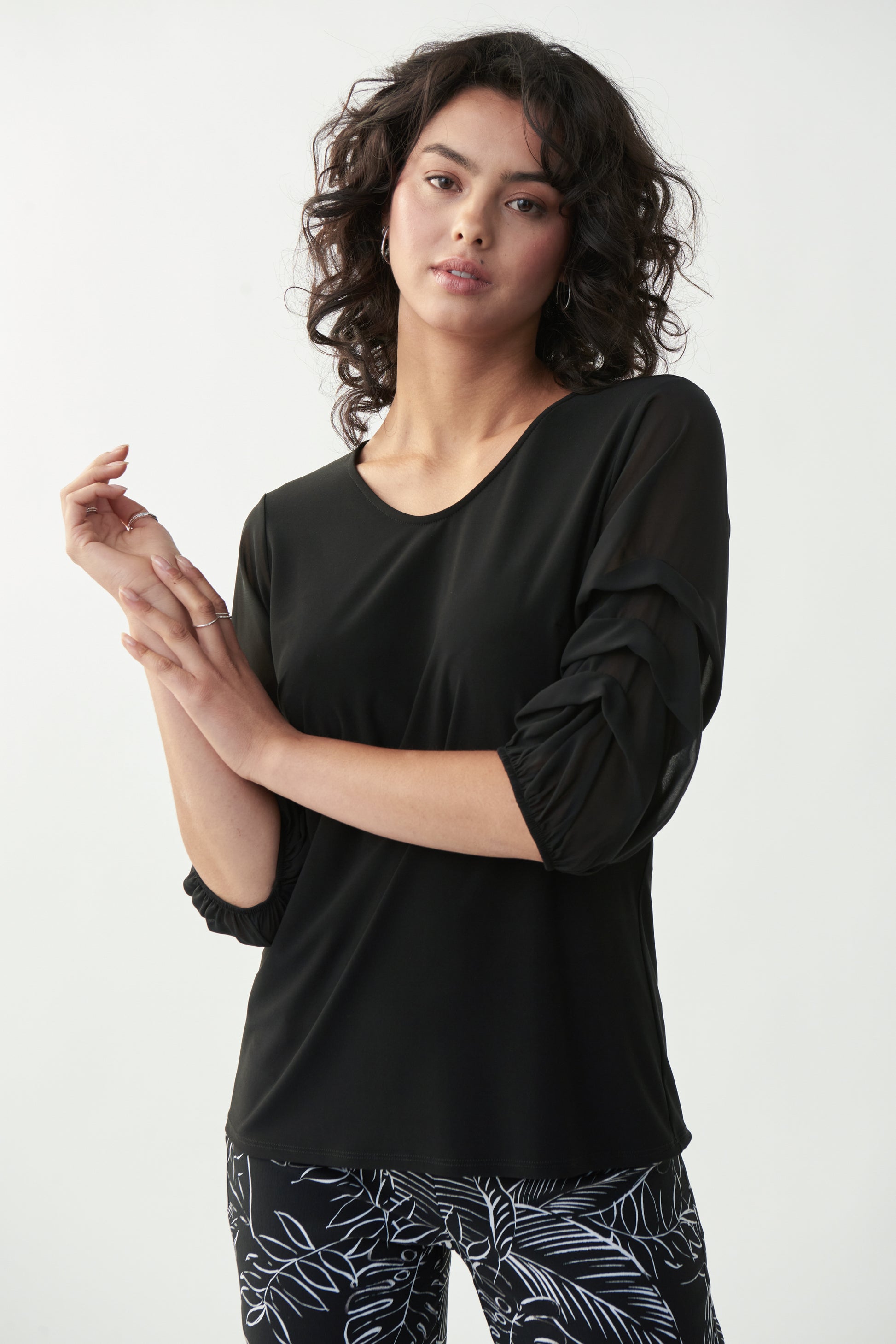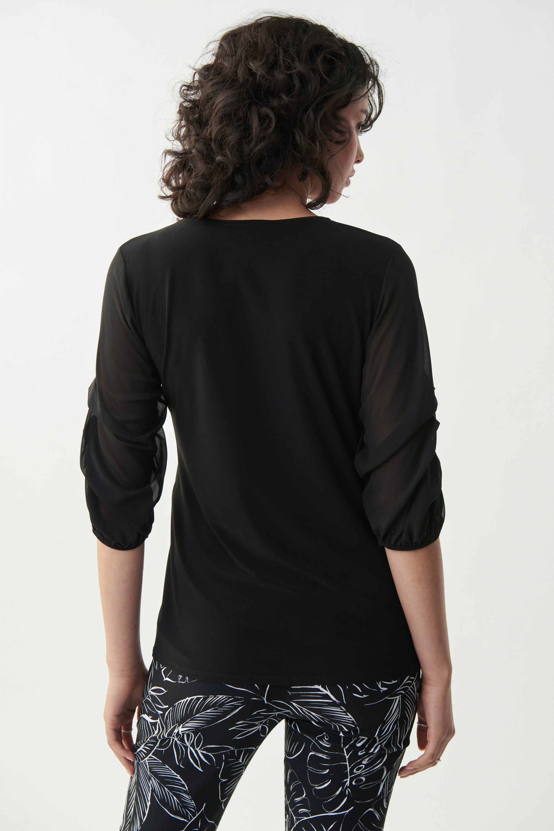 Blusa color negro con mangas escalonadas en tela semi transparente, escote en "V".