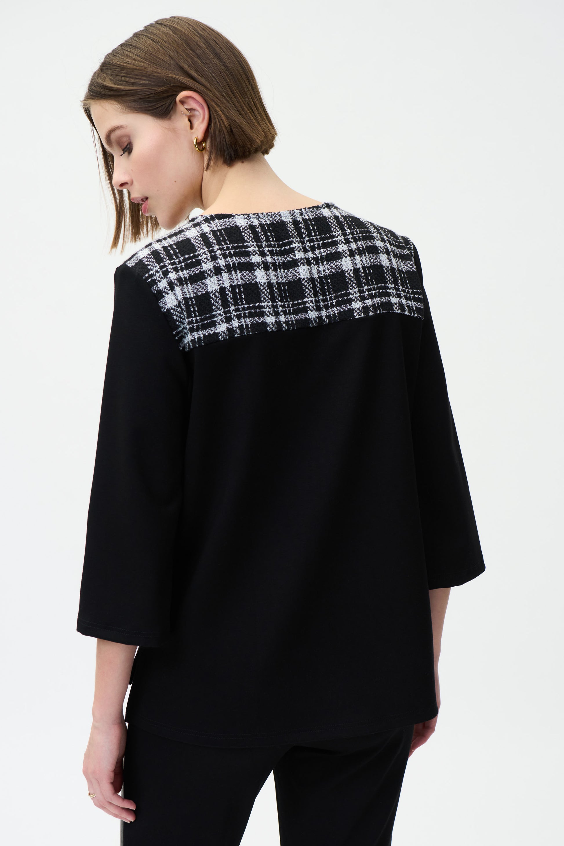 Blusa negra con bolsas de parche en tela cuadriculada, cuello redondo, manga 3/4, canesœ con tela cuadriculada, botones metalicos sobre bolsas de parche.