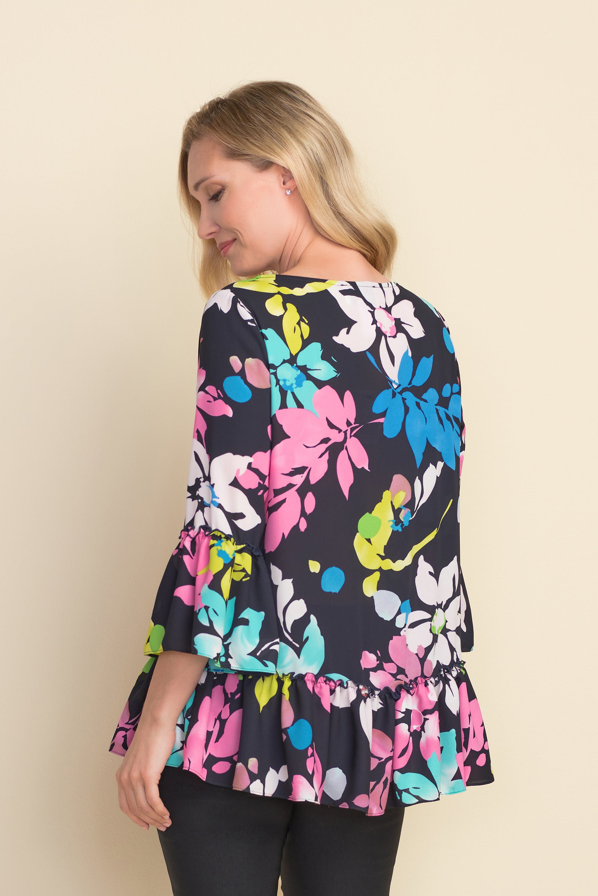 Blusón azul marino con estampado de flores rosa, turquesa y amarillo, con cuello redondo y faldón, manga 3/4 con puño acampanado.