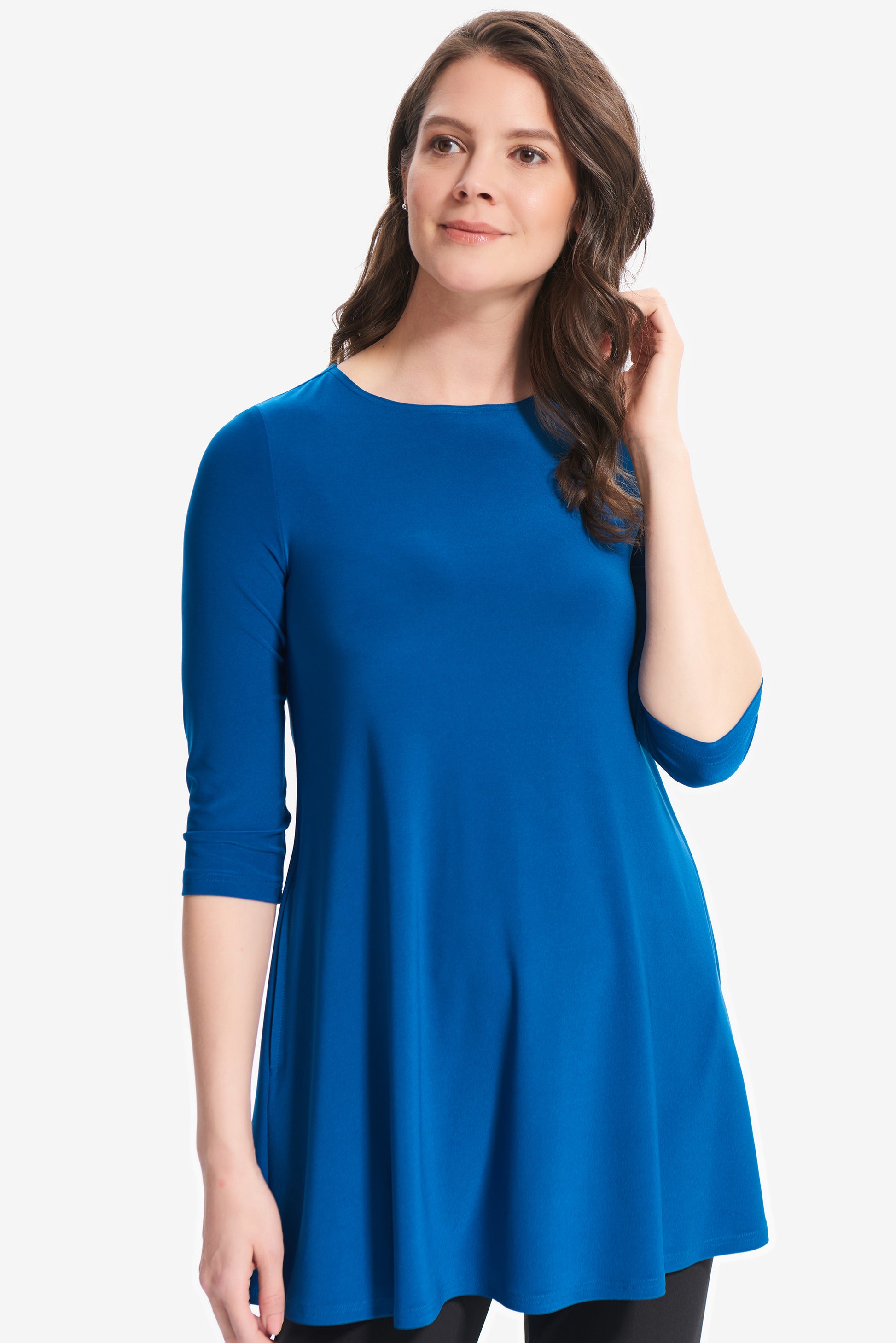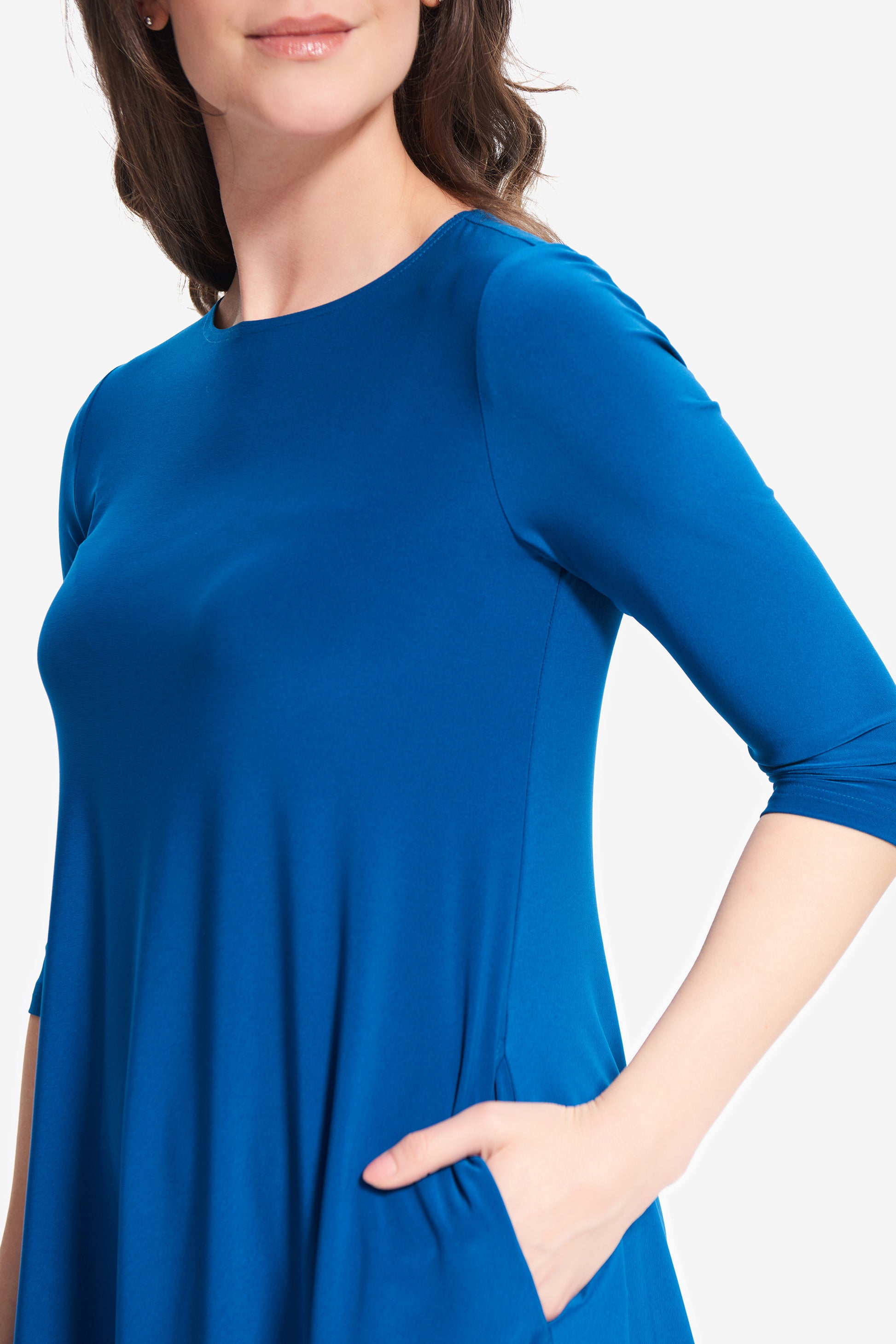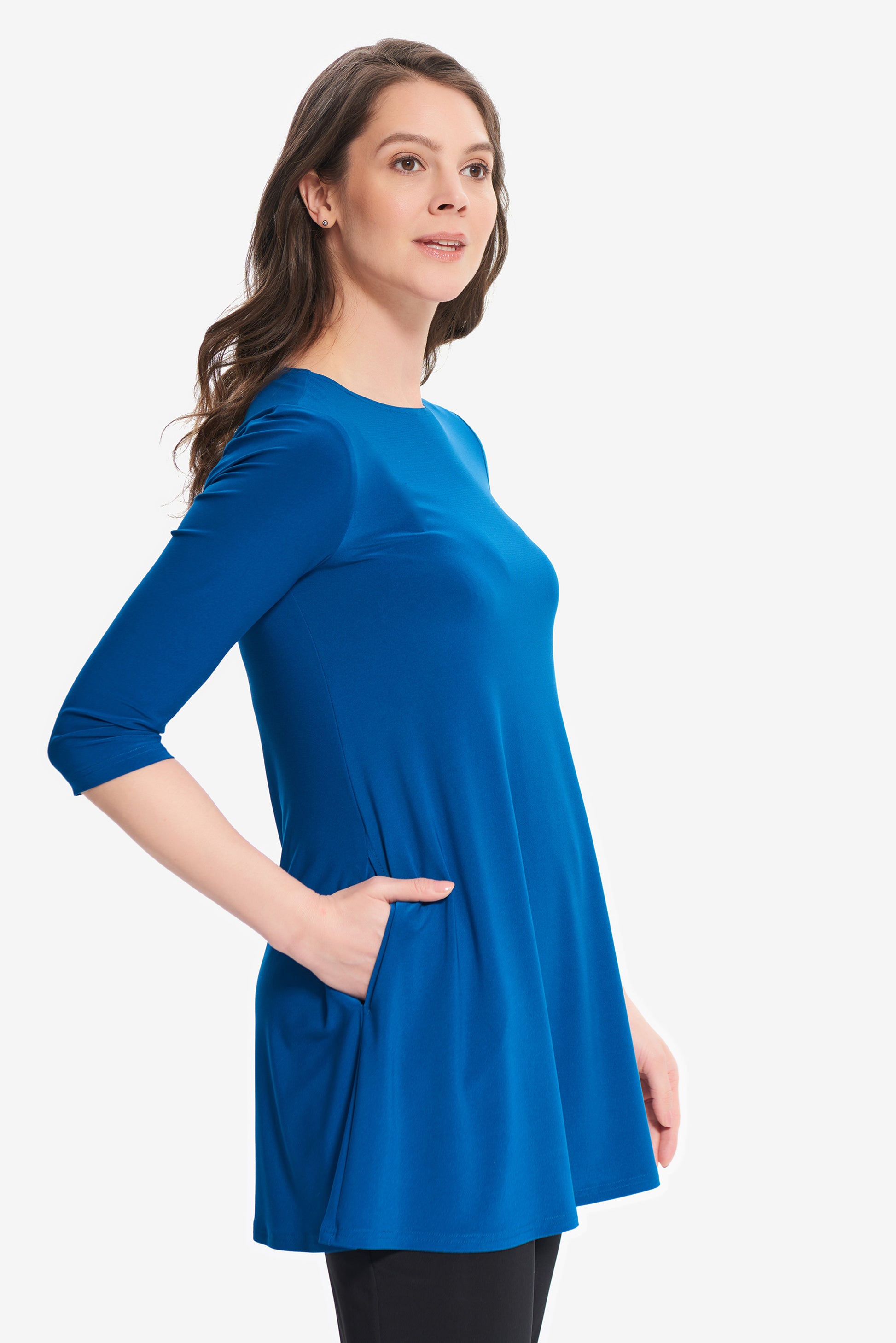 Blusón para dama color azul Aquarius, cuello redondo, manga 3/4, bolsas al frente, corte circular.