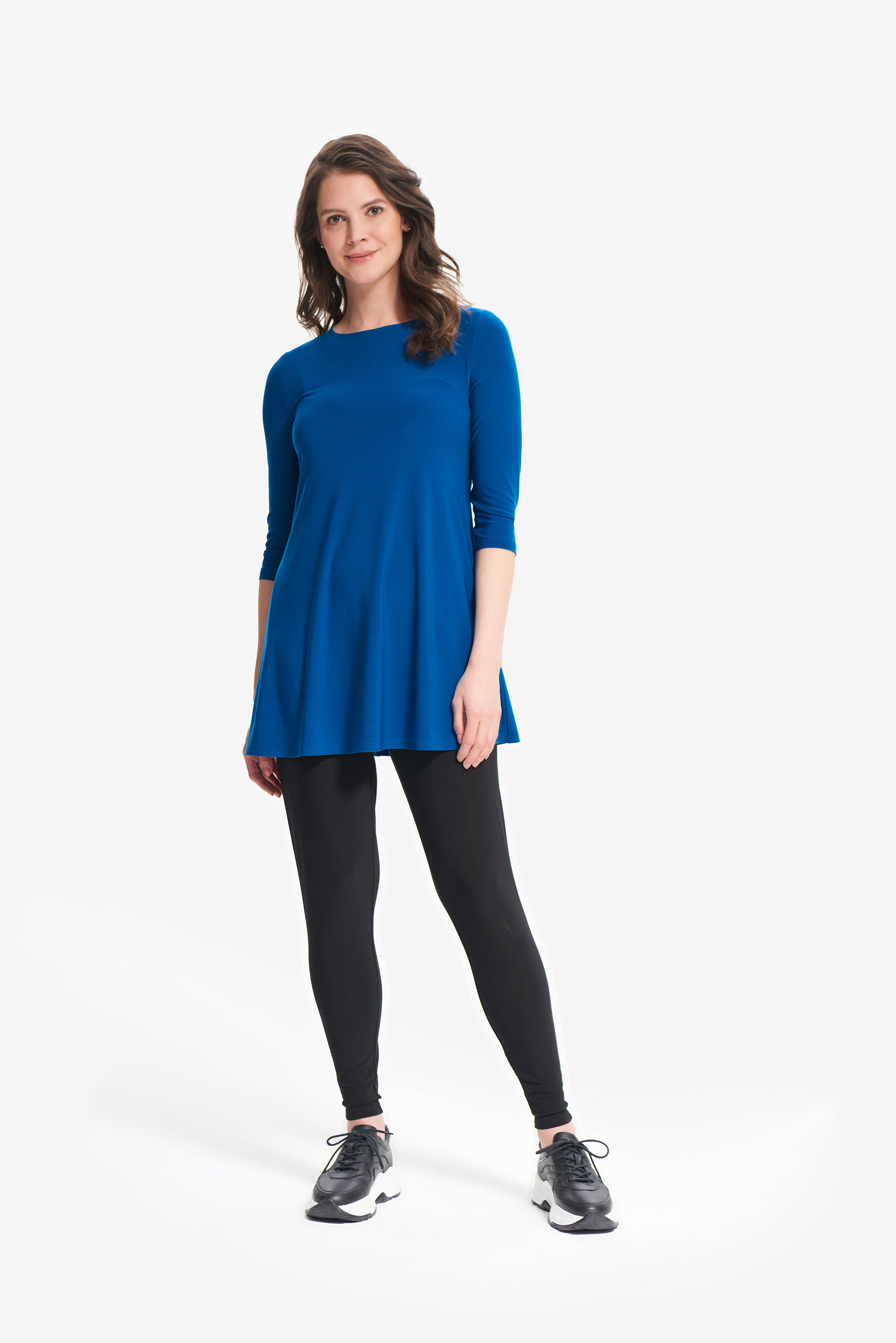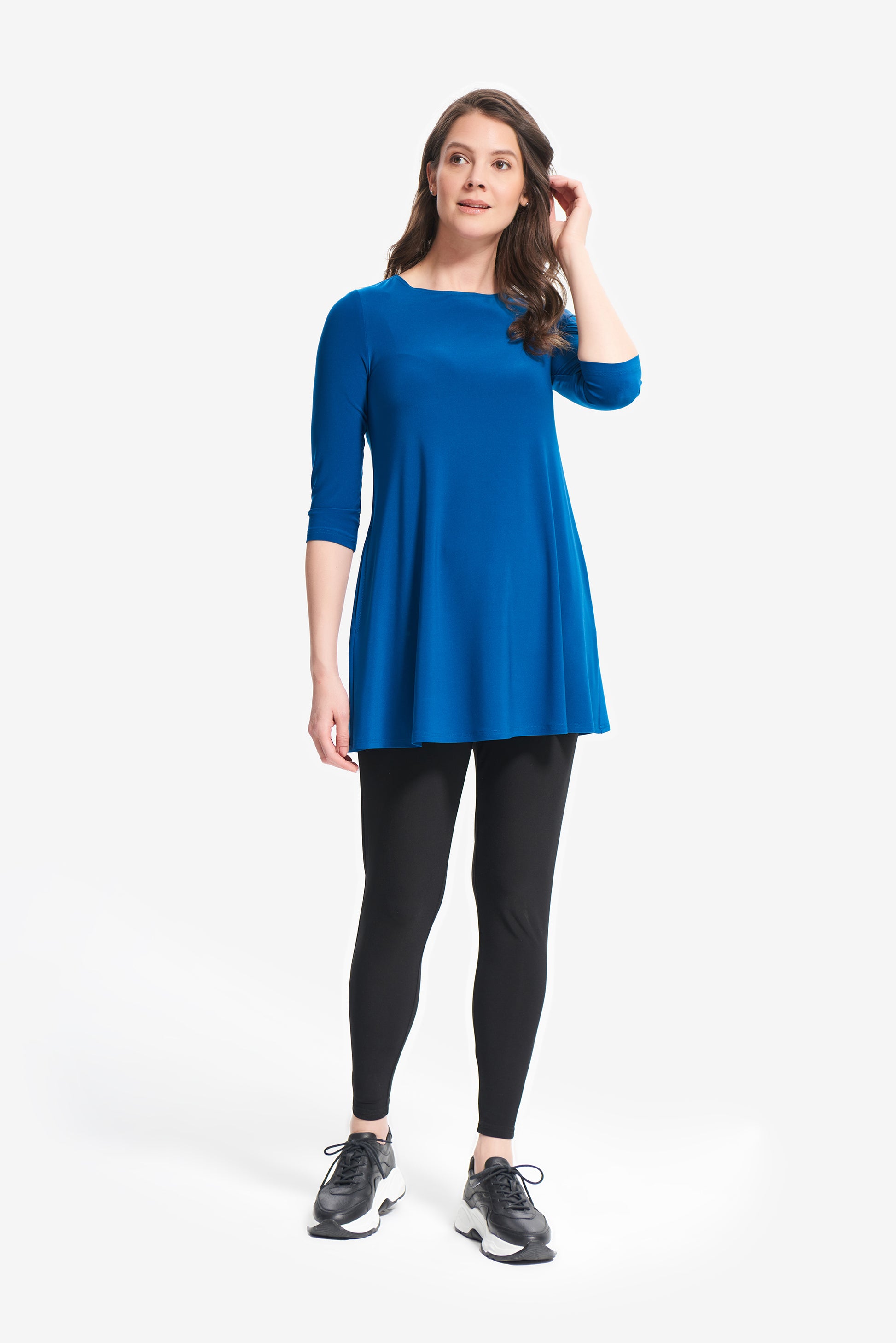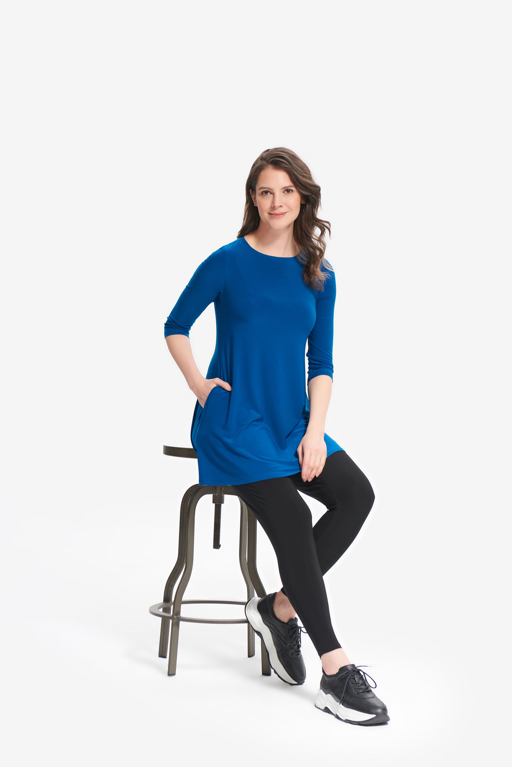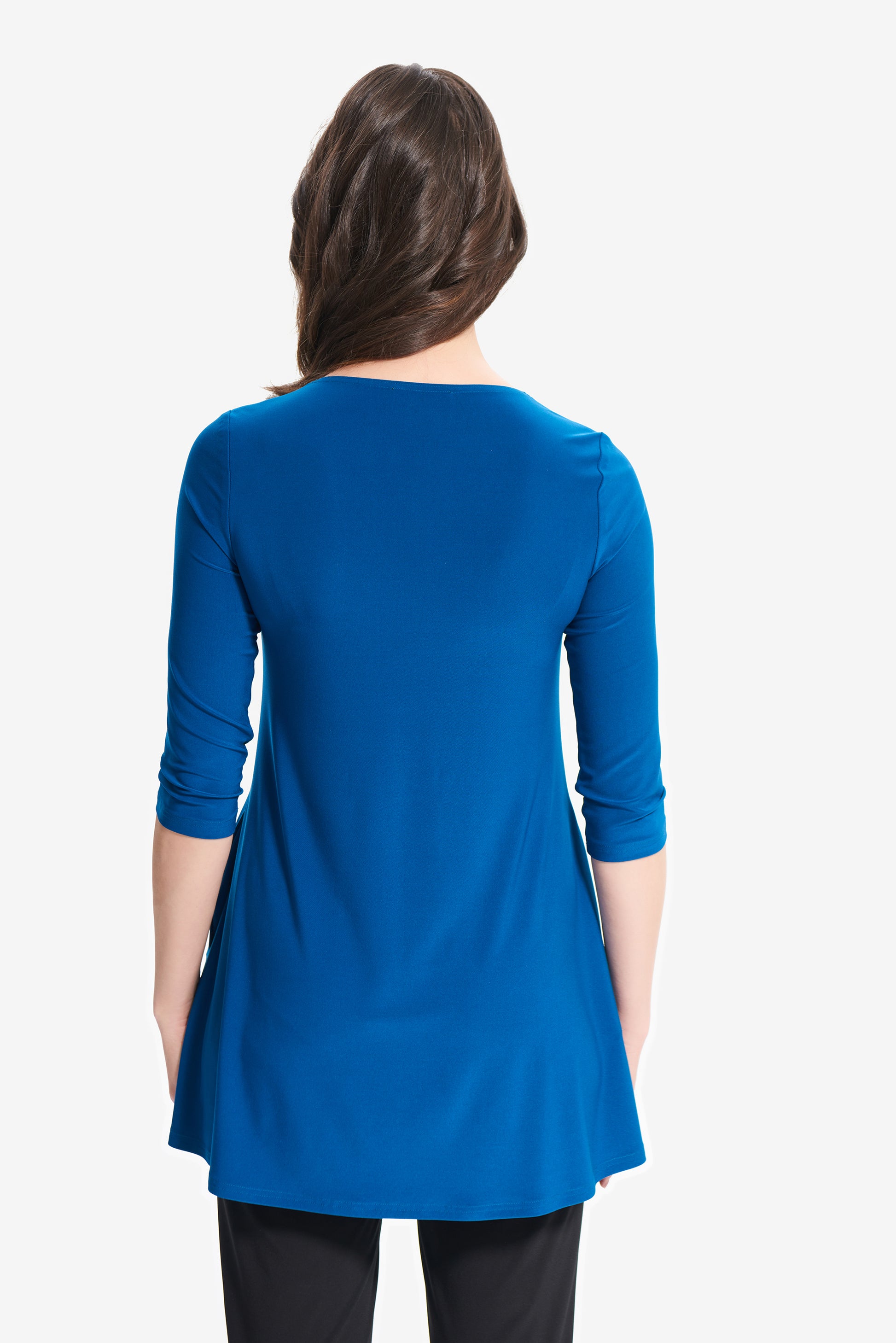 Blusón para dama color azul Aquarius, cuello redondo, manga 3/4, bolsas al frente, corte circular.