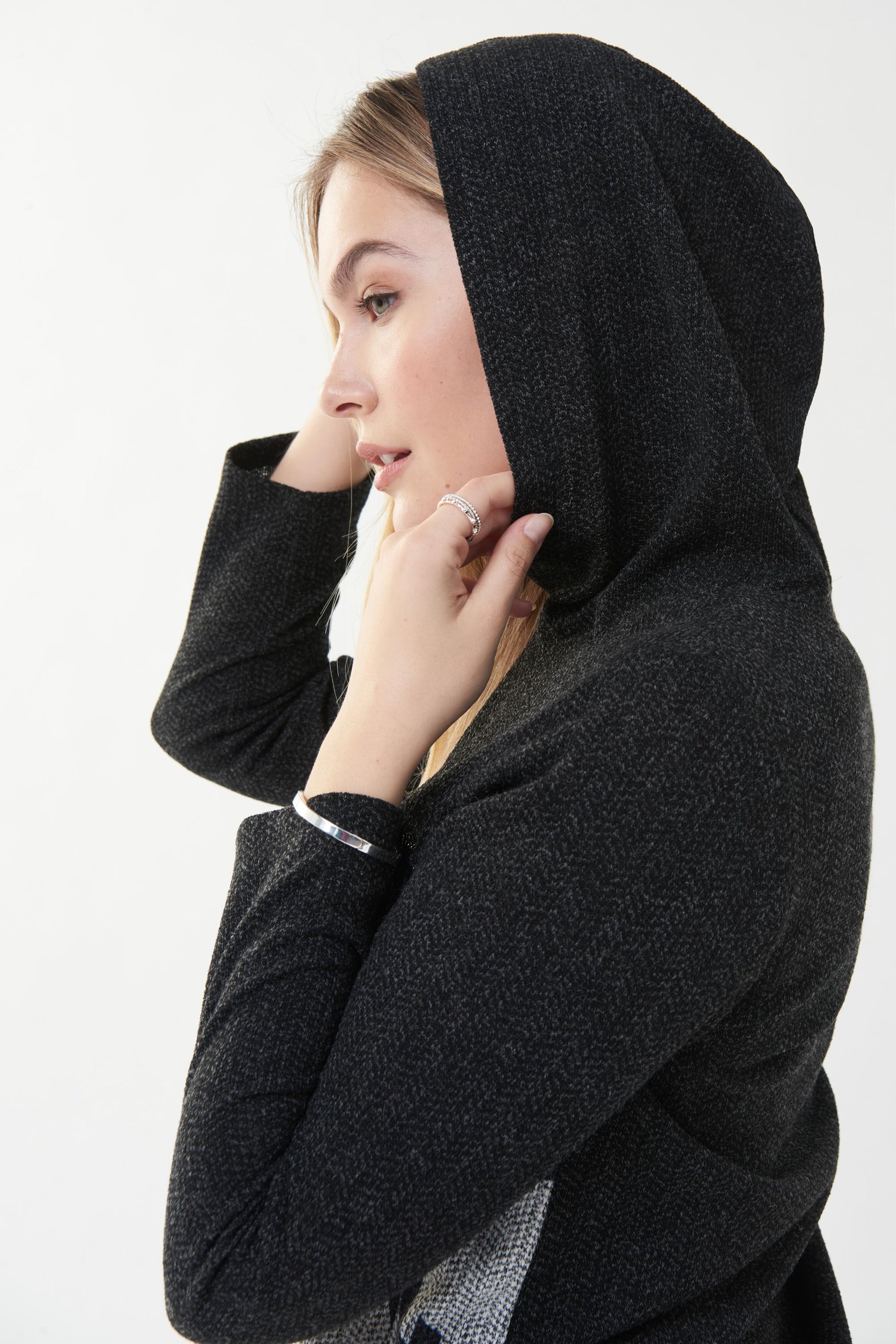 Blusón color gris con estampado de letras en contraste al frente, bloque en contraste al frente, capucha, manga larga.