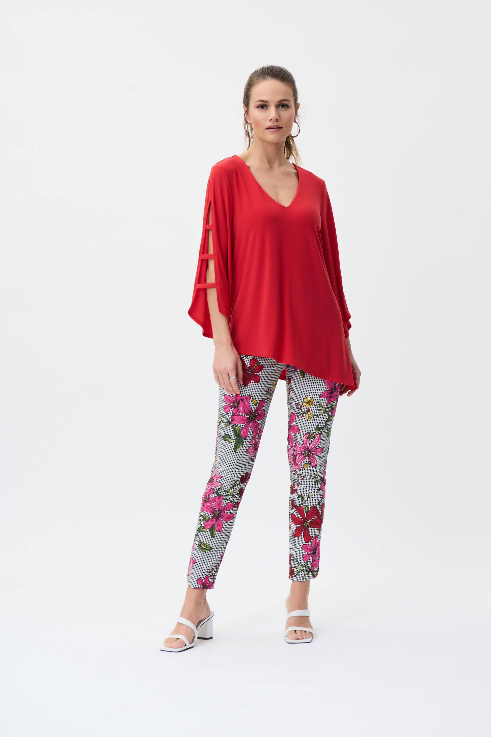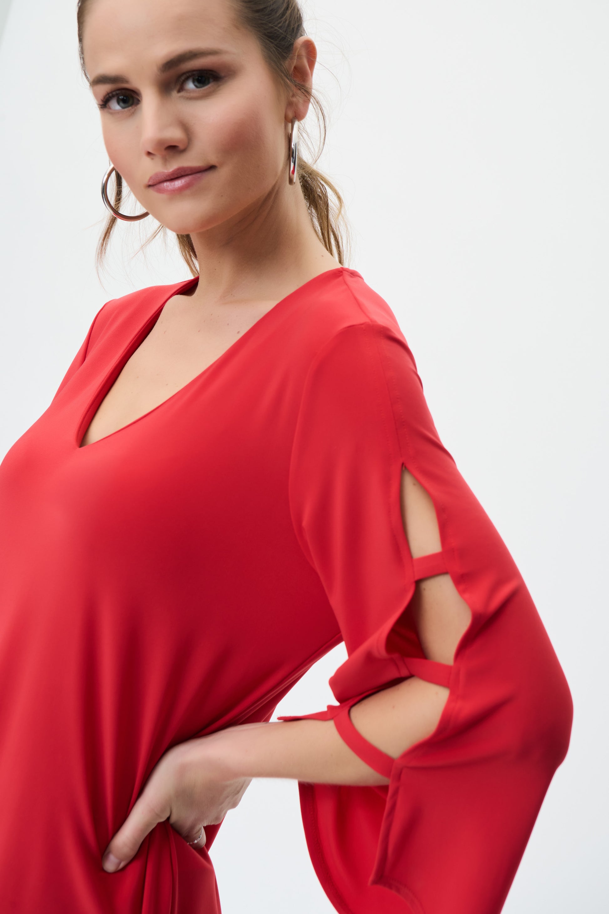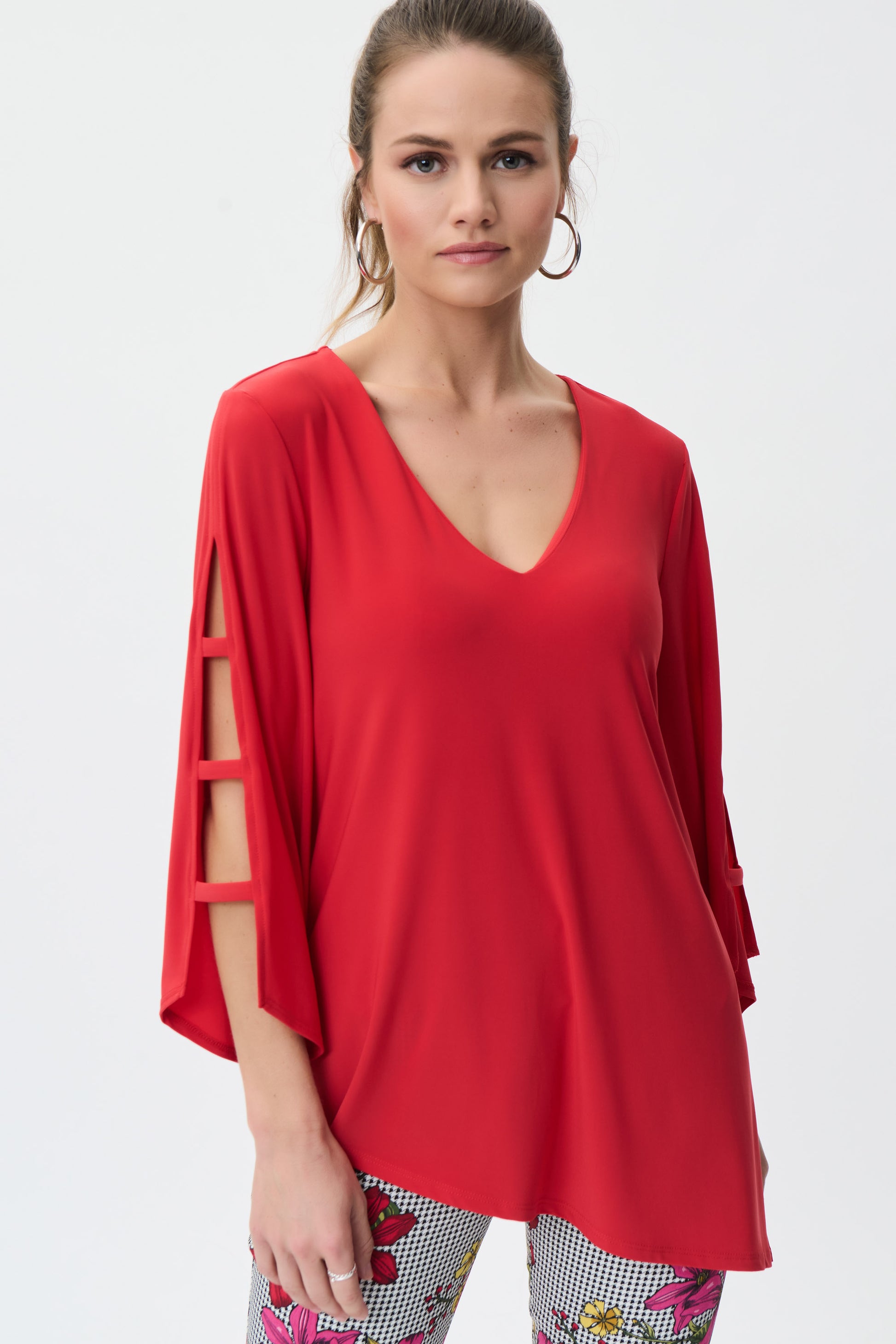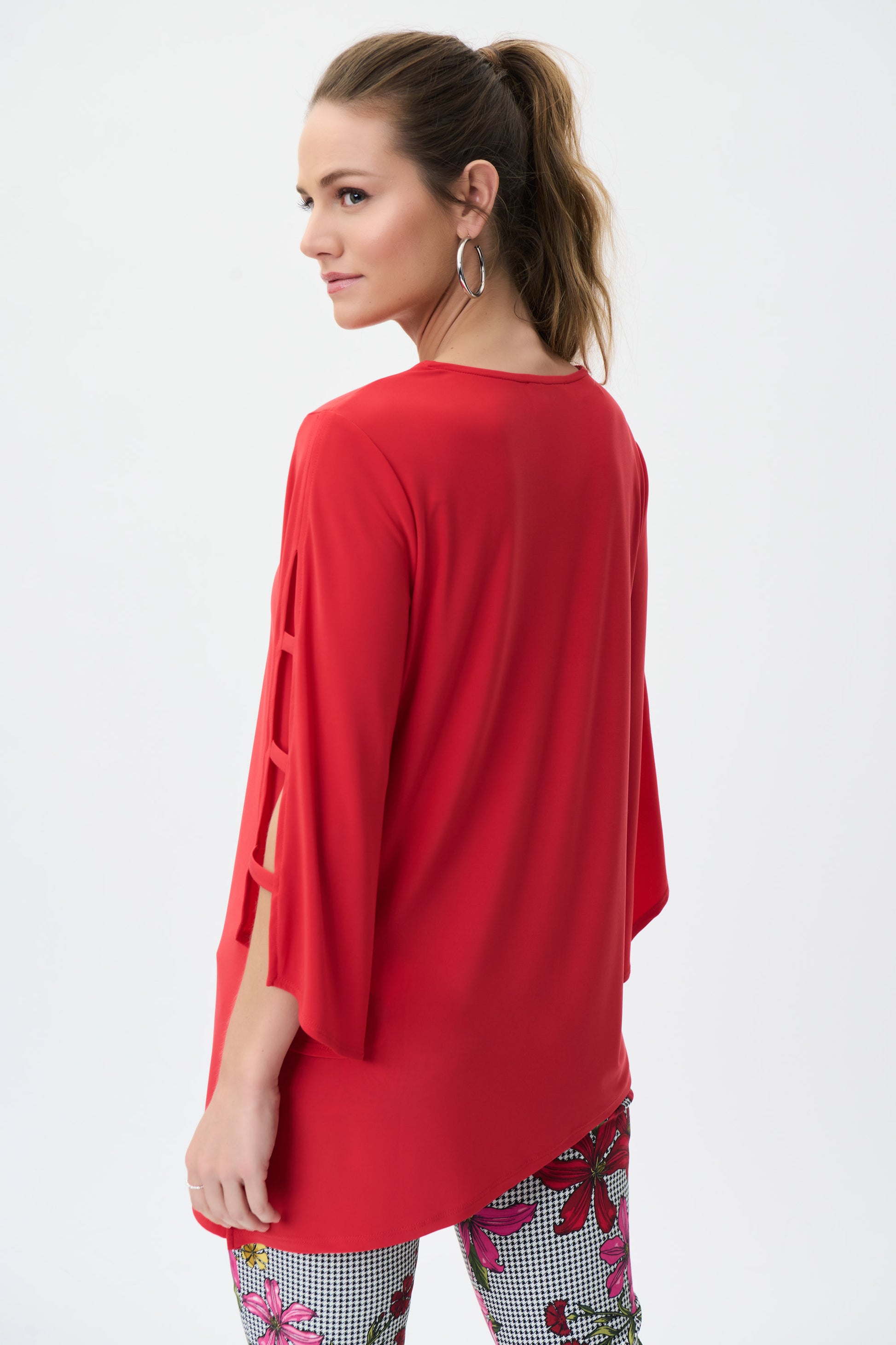Blusón rojo magma, escote en “V”, mangas acampanadas con abertura lateral y tiras horizontales, frente asimétrico