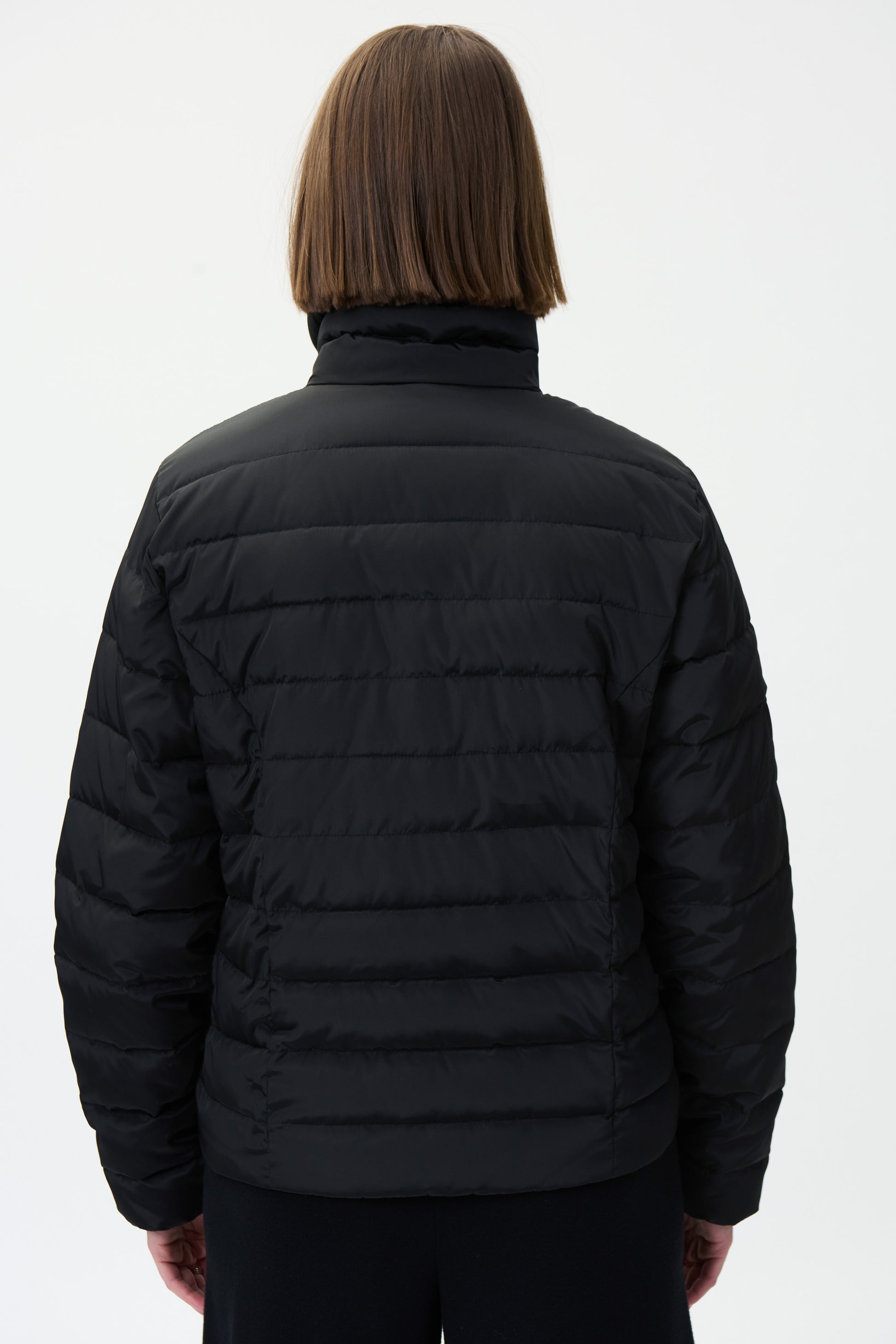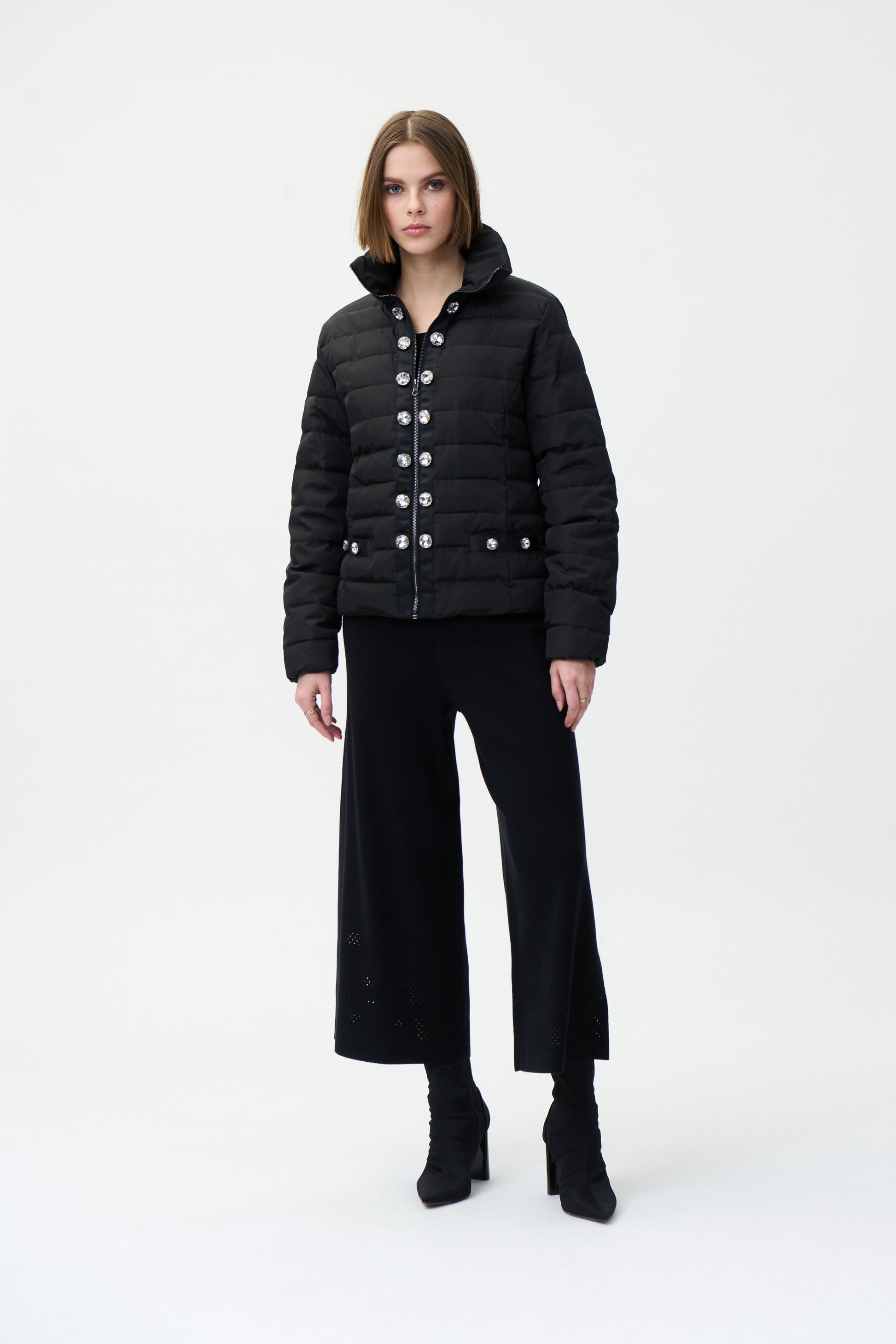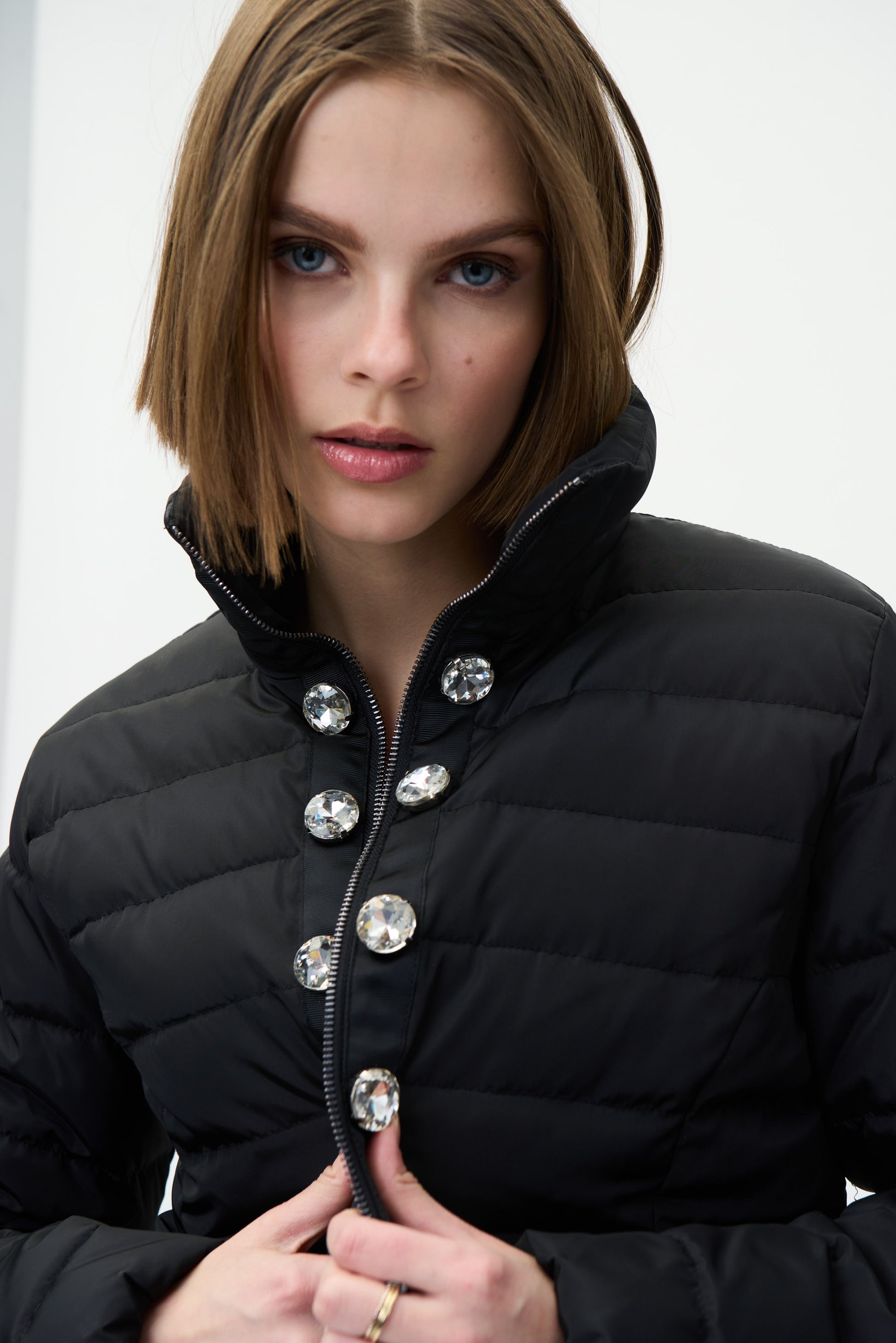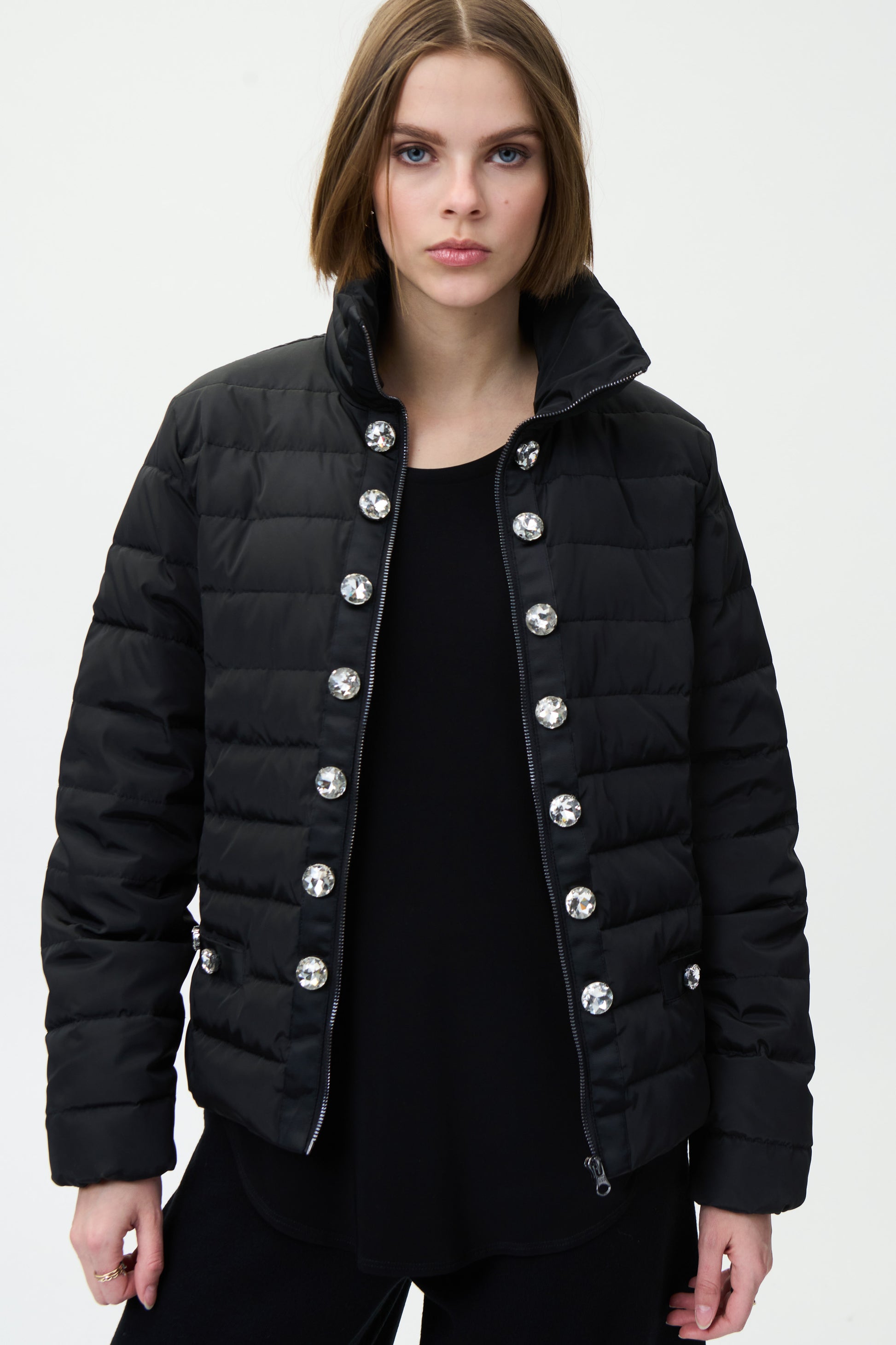Chamarra para dama color negro, abullonada, manga larga, con botones tipo brillante decorativos al frente, cierre frontal, cuello alto, bolsas frontales.