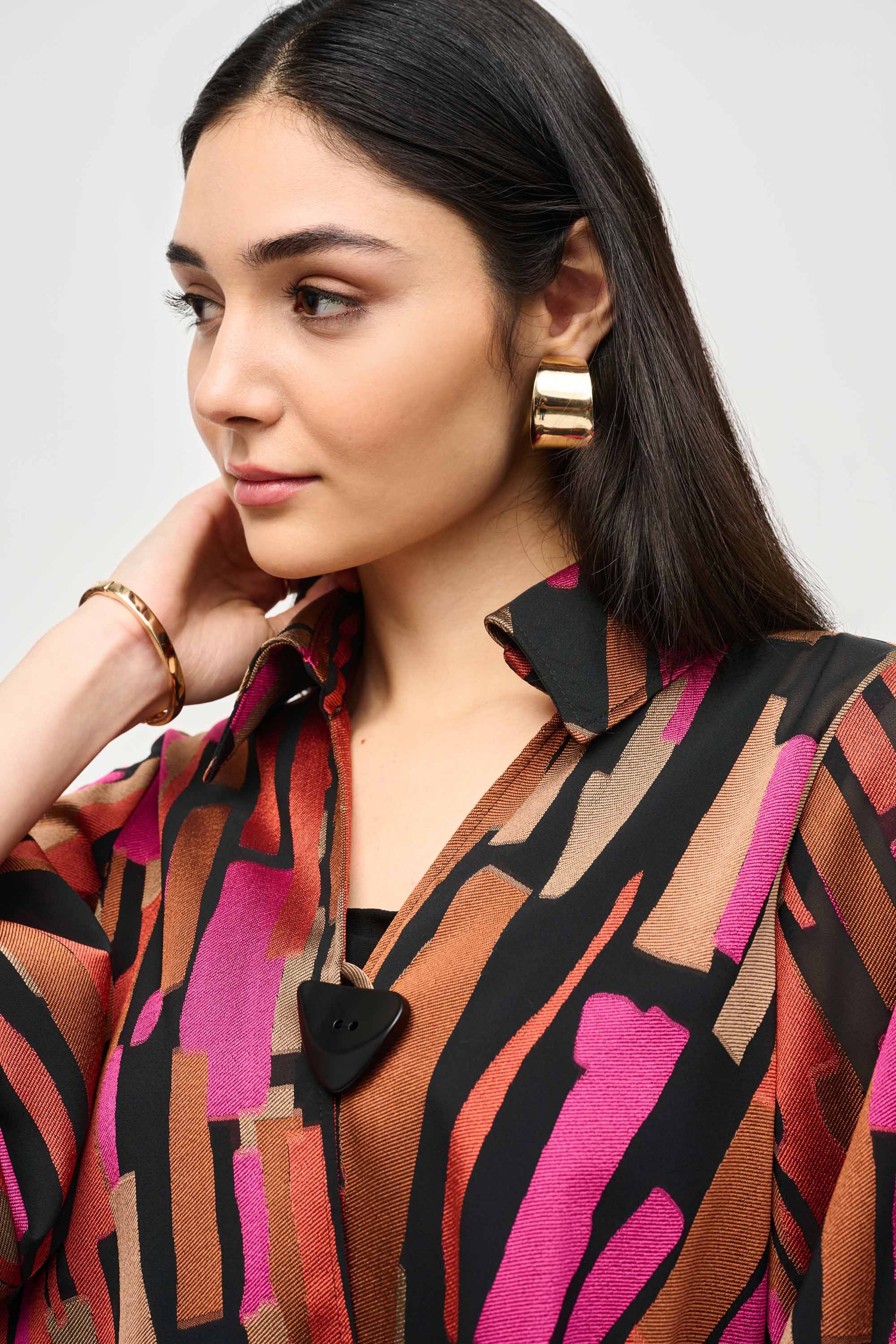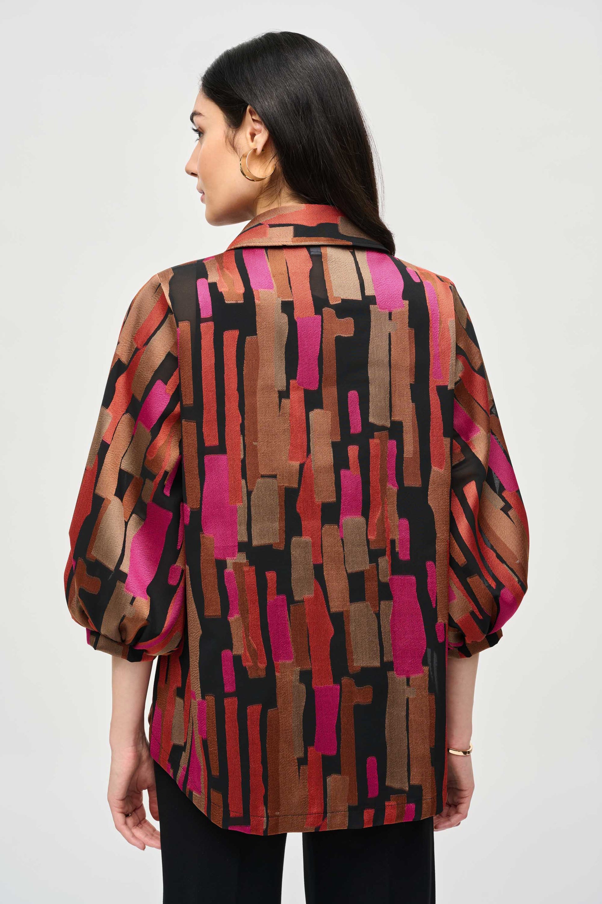 Con un patrón abstracto, escote recortado, largo corto y corte oversize para un estilo sin esfuerzo. Las mangas abullonadas 3/4 añaden un toque sofisticado, mientras que el tipo de cierre sigue siendo un elemento sorpresa. Una prenda de vestir casual.