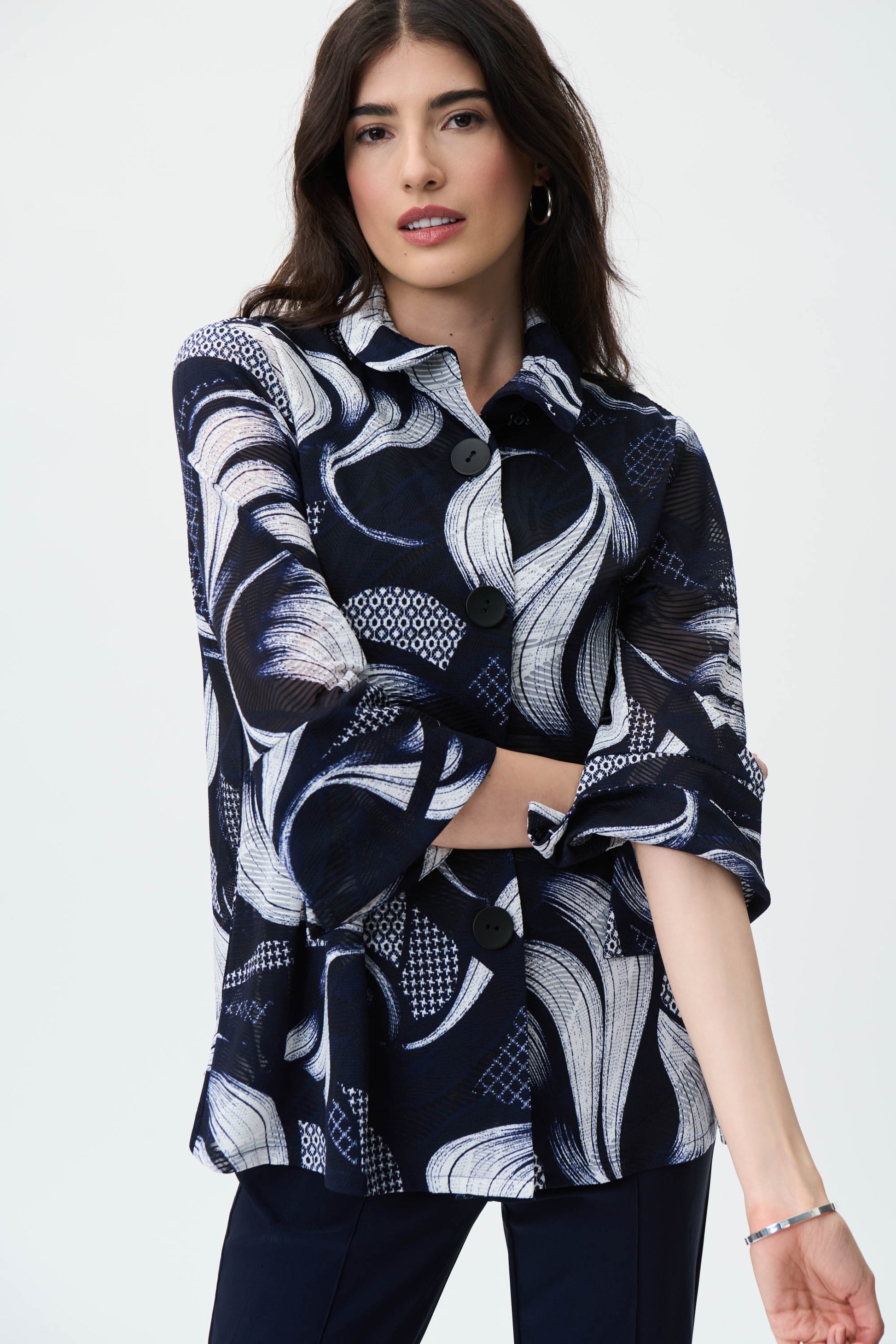 Chaqueta para dama, con estampado abstracto en azul marino y beige, cuello camisero, manga 3/4 con puños acampanados, parches de transparencias.