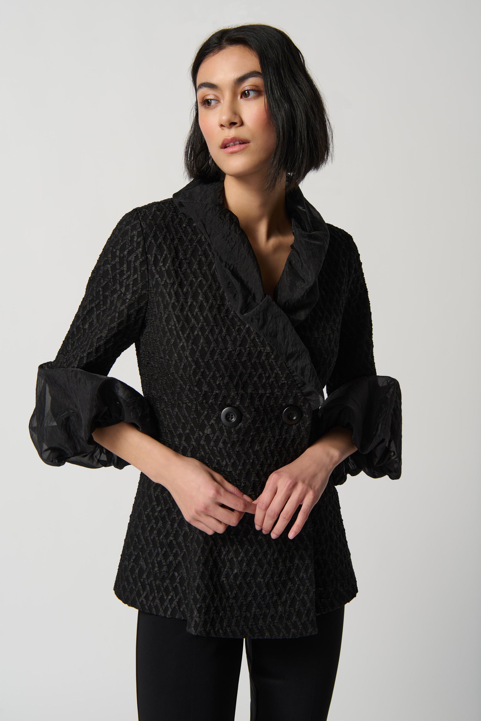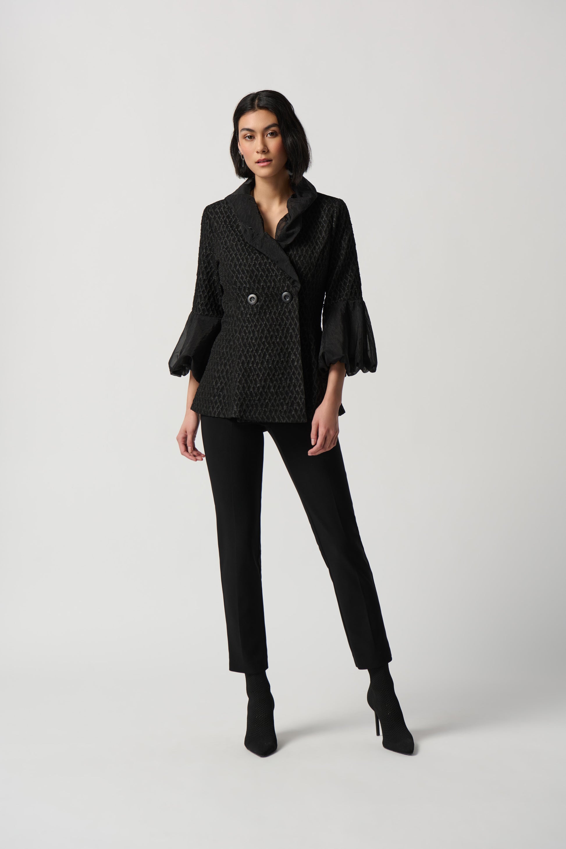 Con su diseño de mangas abullonadas, esta chaqueta derrocha elegancia y modernidad. Es perfecta para cualquier ocasión especial, gracias a sus mangas tres cuartos abullonadas, su cierre con doble botonadura y su favorecedor corte ajustado y acampanado.