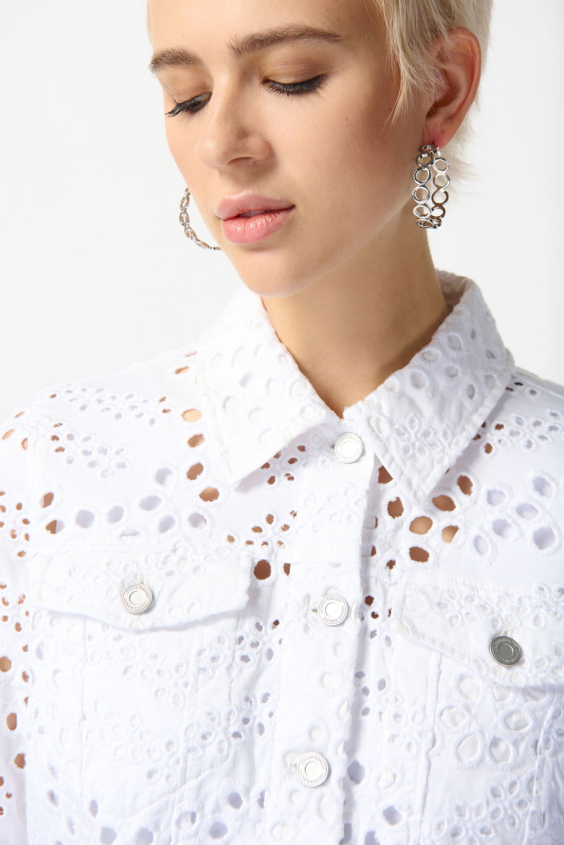 Súmele un estilo moderno y atrevido a su armario con esta exquisita chaqueta vaquera bordada. Esta prenda cuenta con un atractivo clásico, que ofrece una elegancia discreta con su intrincado bordado de ojales. El corte ajustado, el cuello de camisa y las mangas largas con puños crean con armonía un aspecto impresionante, que resulta cómodo y pulido a partes iguales. Además, la chaqueta viene graciosamente adornada con botones de níquel mate y dos bolsillos de parche con solapas, para asegurar el encanto vanguardista pero sofisticado de la pieza.