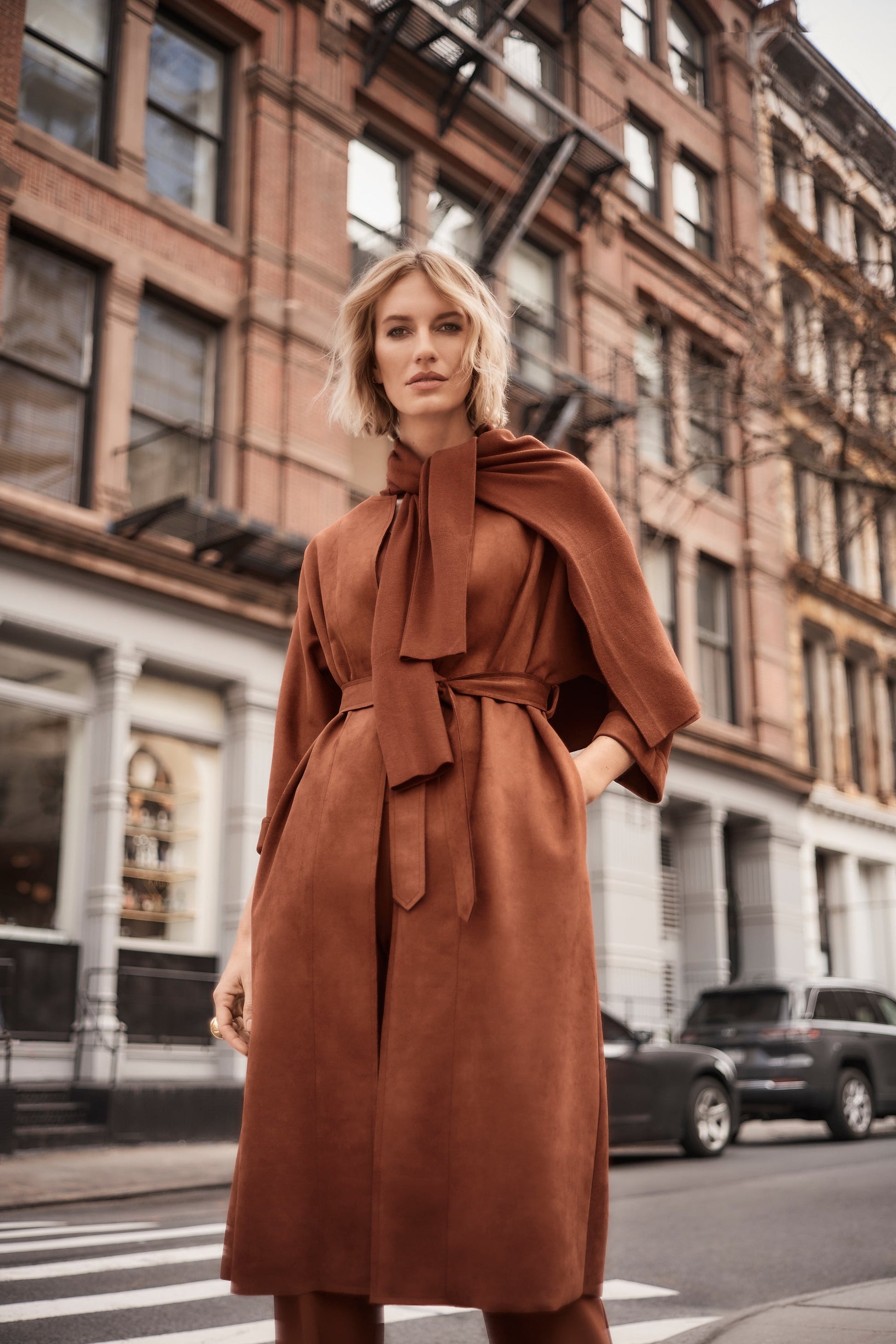 Diseño largo y con manga tres cuartos. Perfecta para cualquier ocasión ,es te cover de gamuza cuenta con cinturón del mismo tono y material.