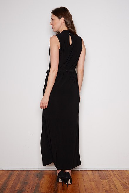 El vestido sin mangas diseñado por Joseph Ribkoff está ajustado, tiene un suave escote en V, fluye a una falda completa que se corta hasta la mitad del muslo detallada con dos botones de metal y el dobladillo cae hasta el tobillo,