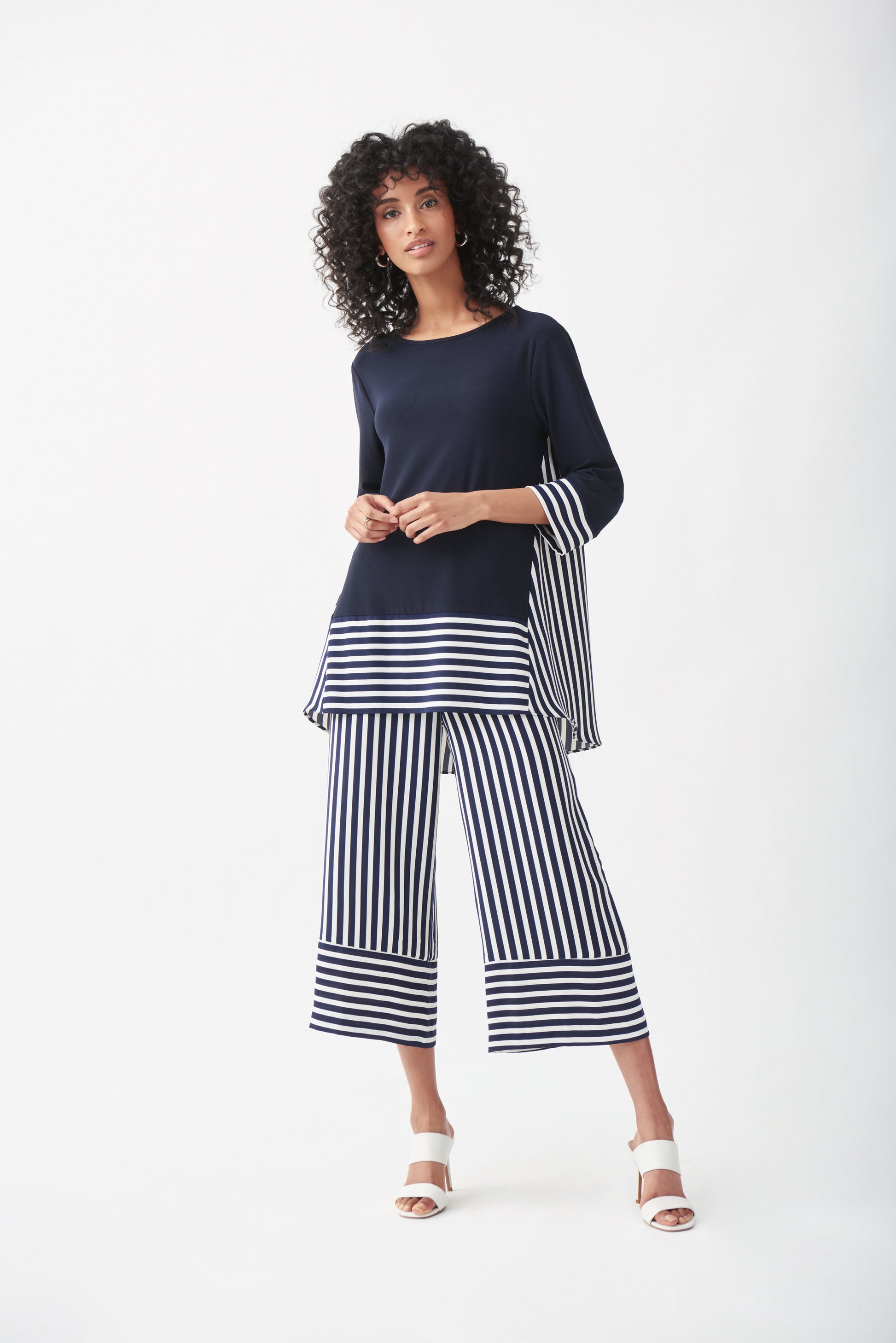 Falda pantalón con rayas horizontales y verticales, cintura fruncida por detrás., sin bolsas.