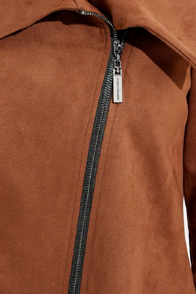 Gabardina de gamuza con sus solapas de gran tamaño y detalles con cremallera.