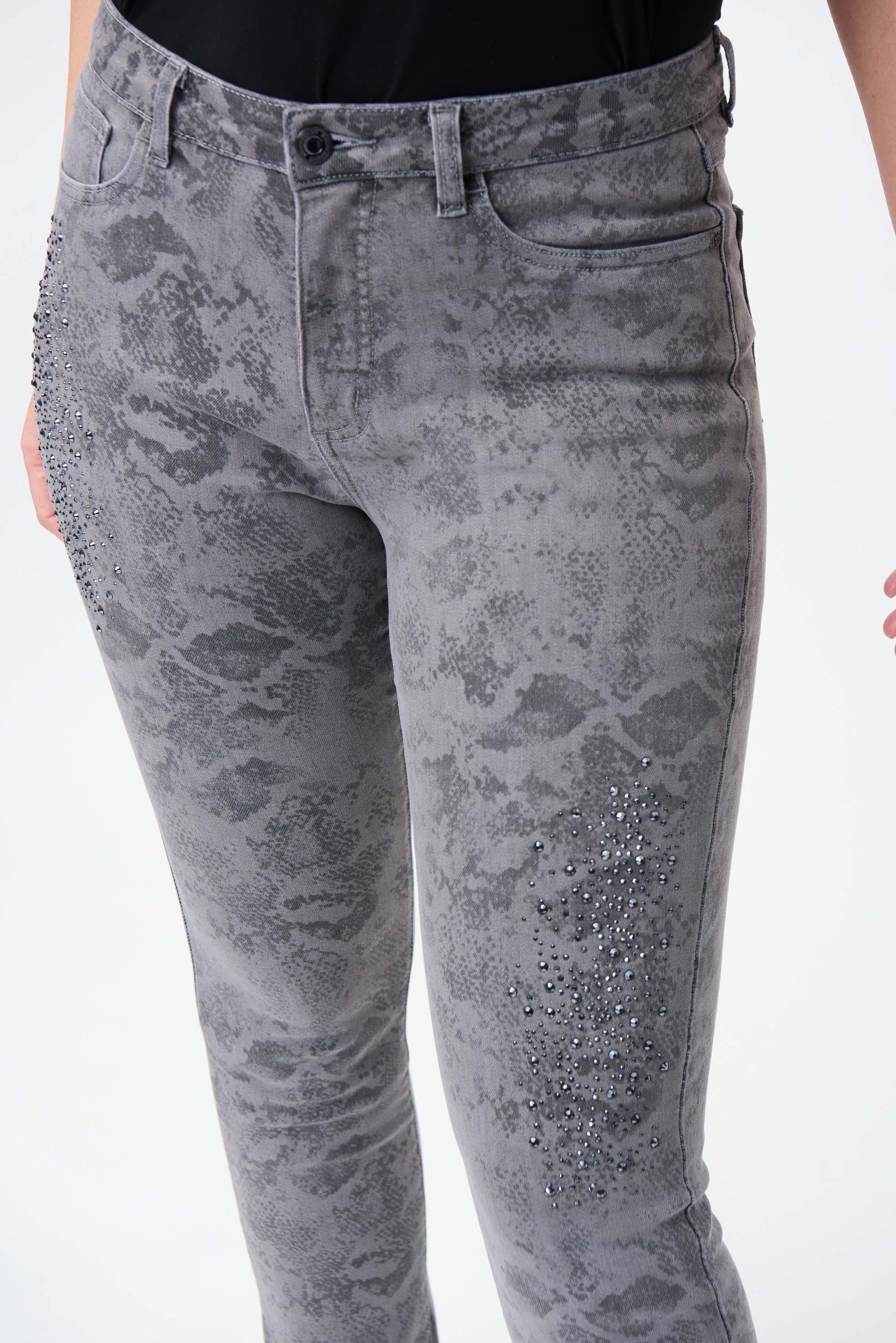Jeans para dama color gris con anima print, aplicación de brillantes al frente, cinco bolsas, corte ajustado.