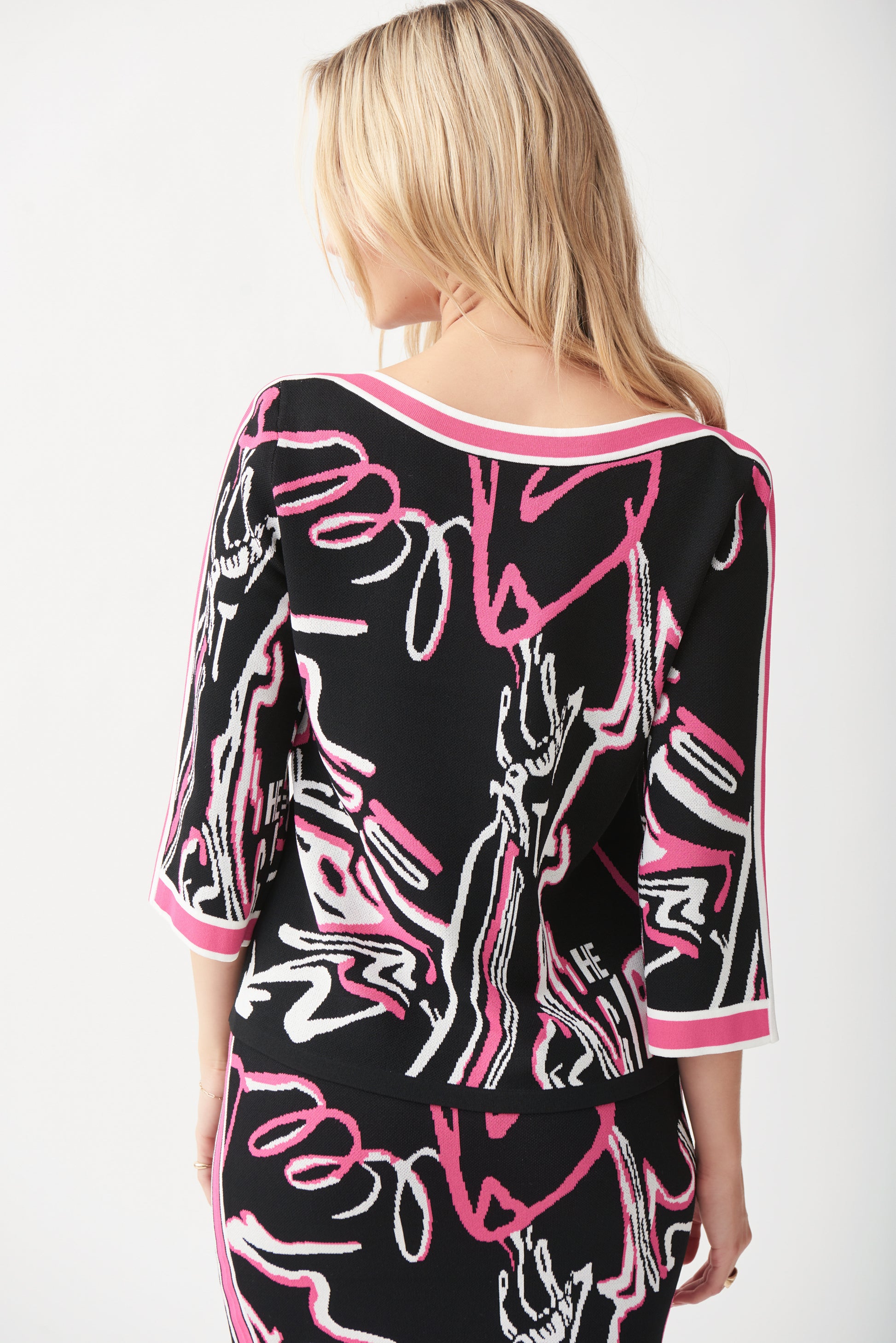 Jersey negro con estampado abstracto en blanco y rosa, cuello barco, manga 3/4