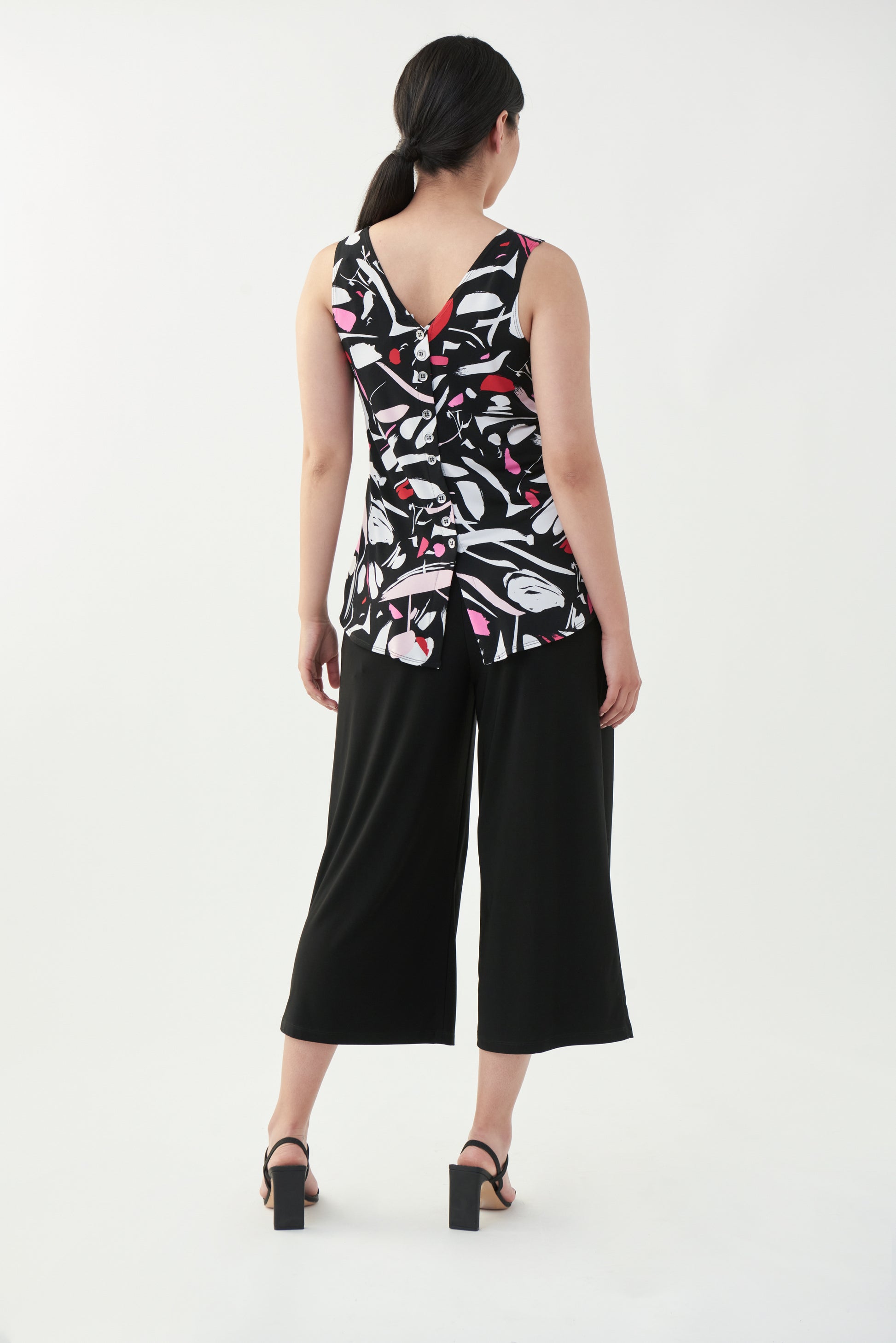 Jumpsuit negro, con blusa estampada en tonos de blanco, rosa y rojo, sin mangas, cuello redondo, pantalón corto acampanado, botones traseros, escote en "V" en la espalda, bolsas delanteras