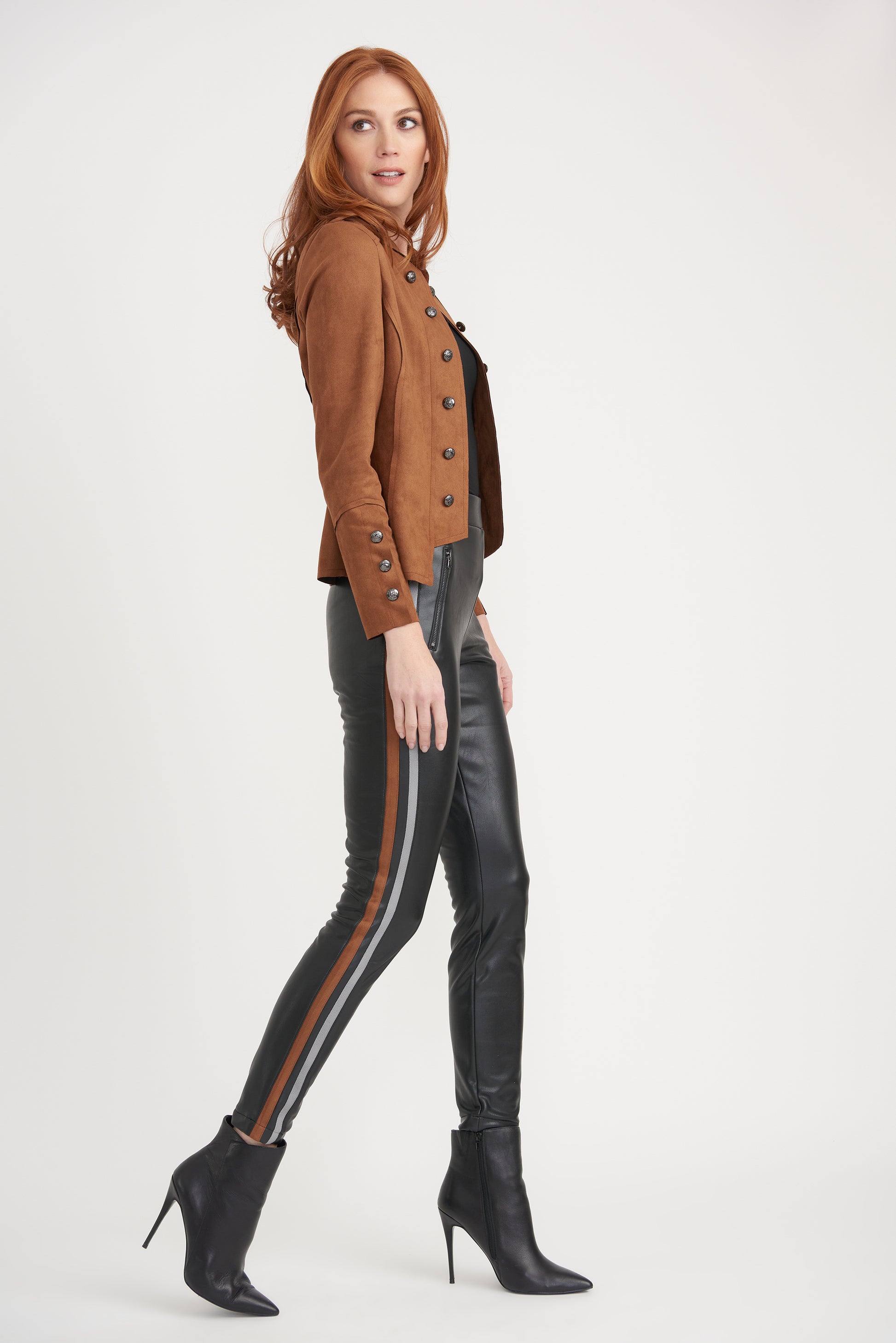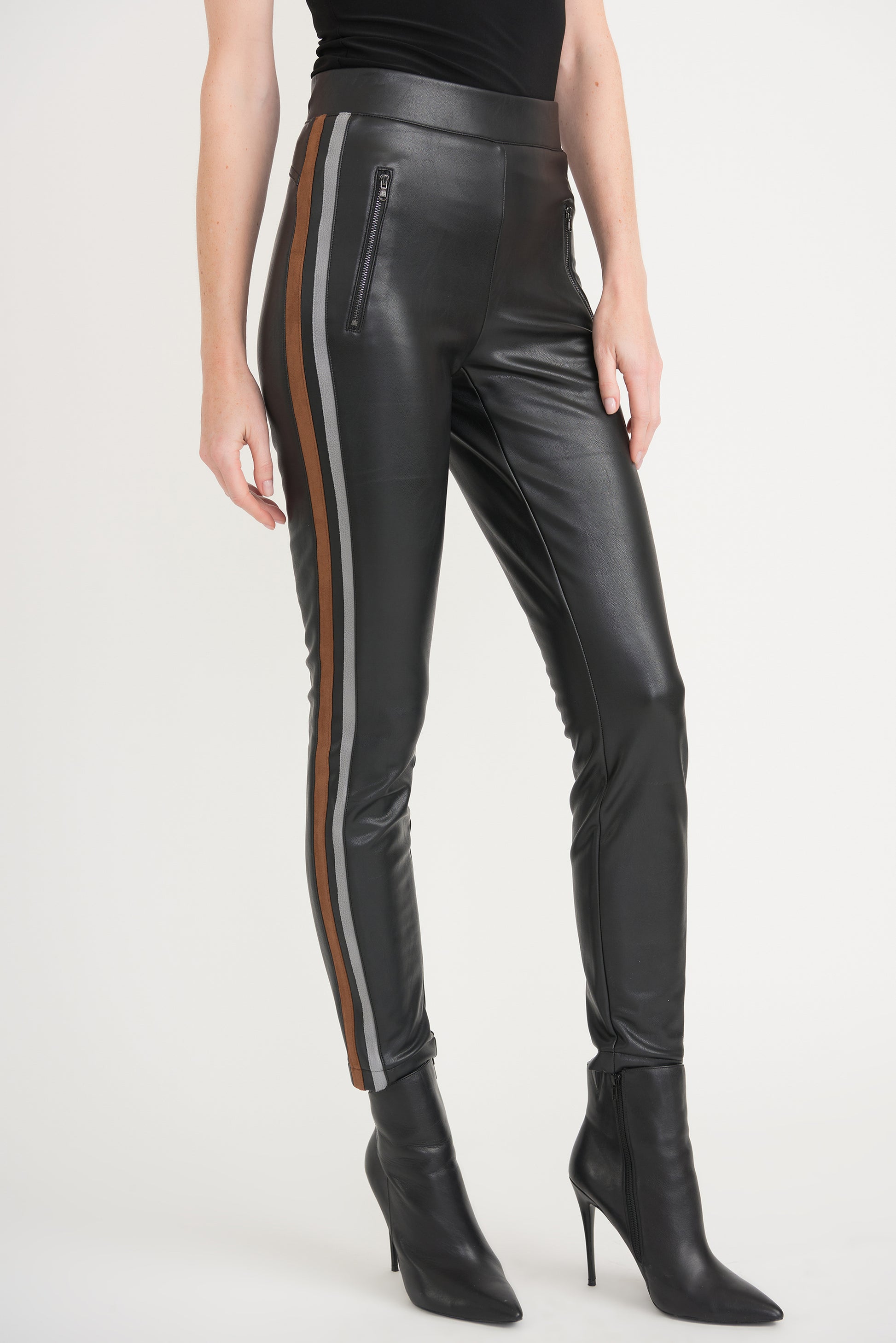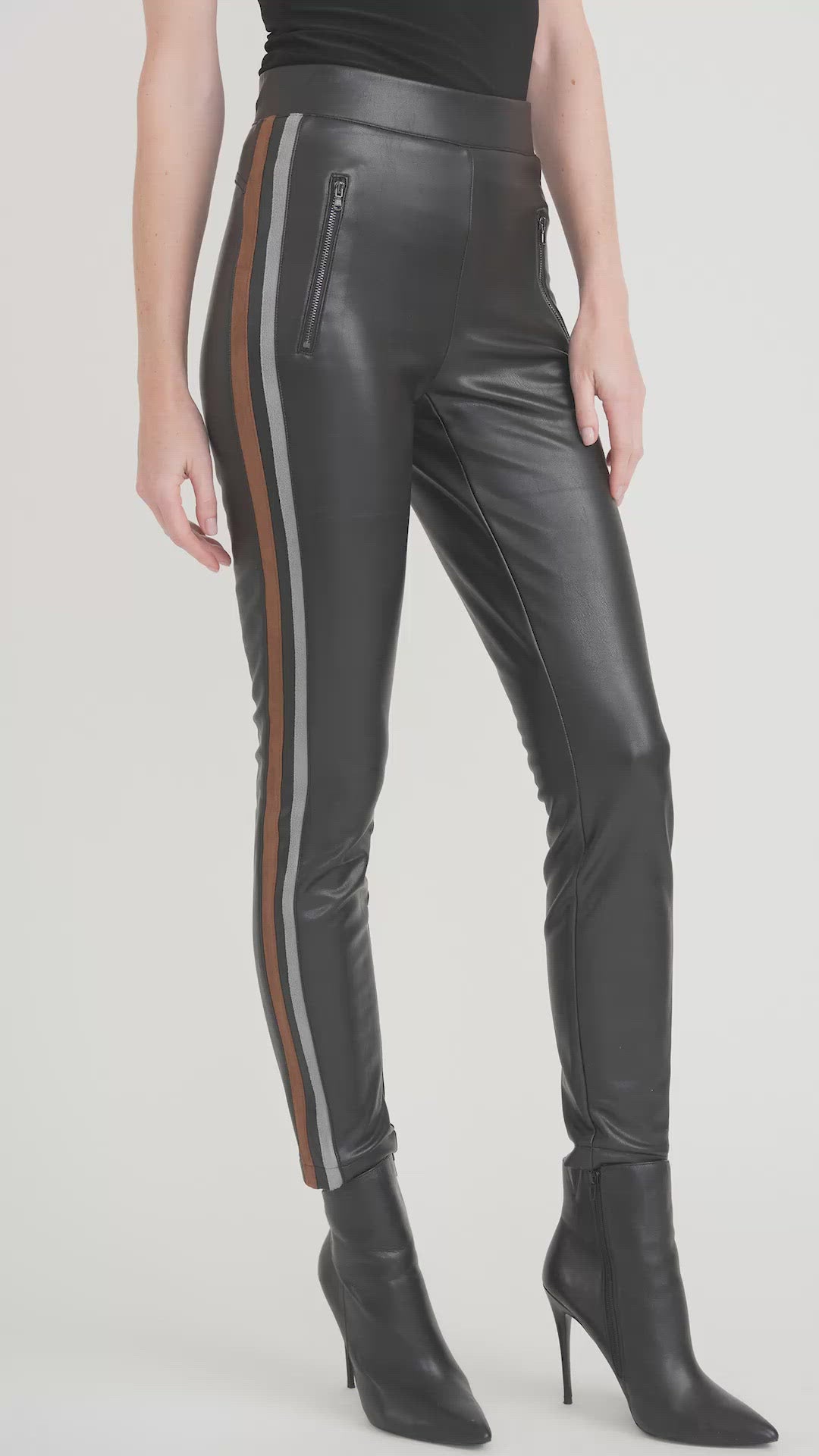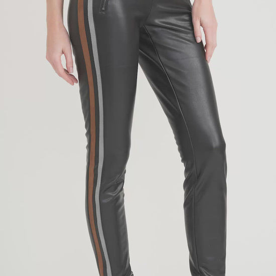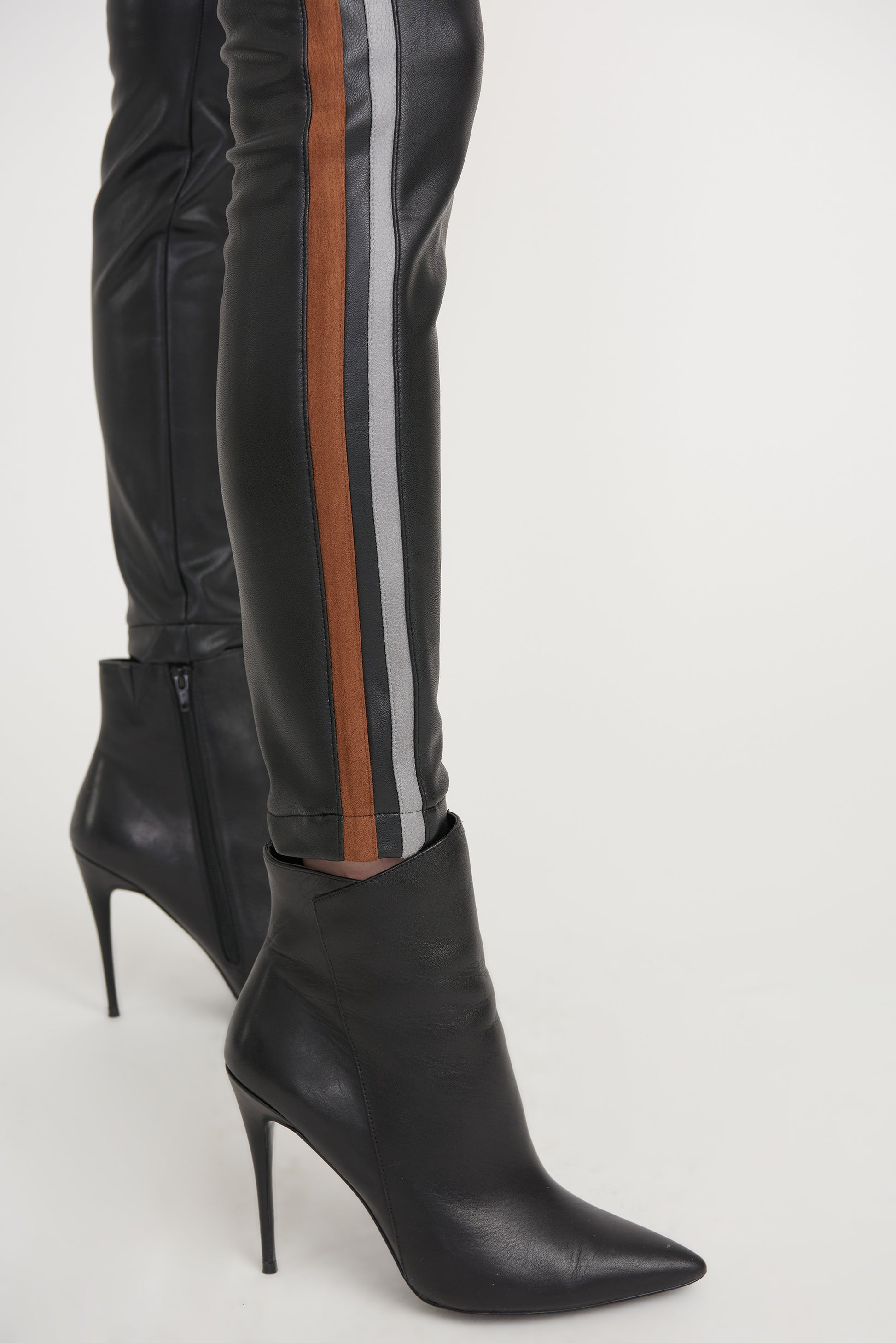 Pantalón color negro en tela tipo piel con bandas laterales en contraste café y gris. Cierres al frente. Corte ajustado