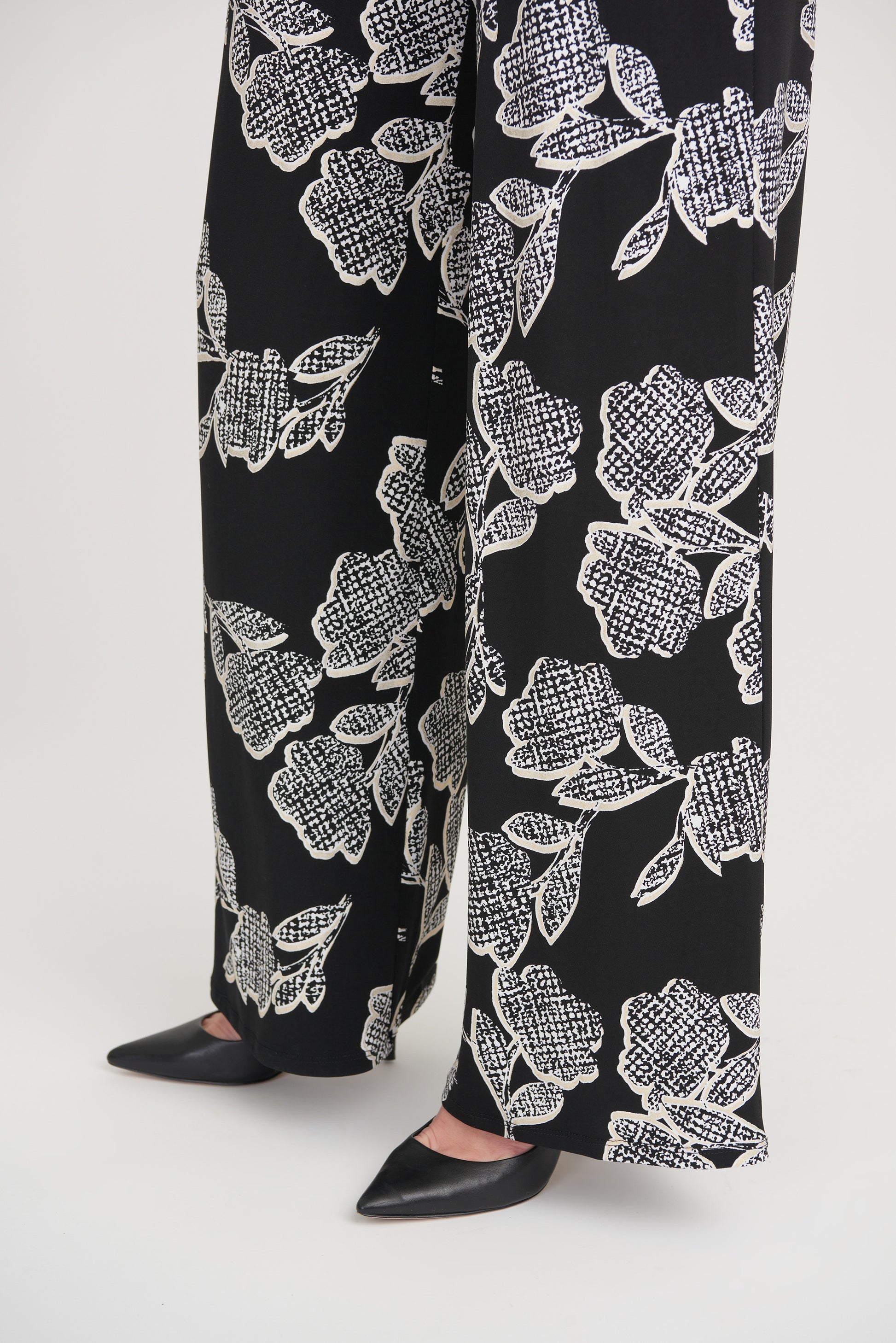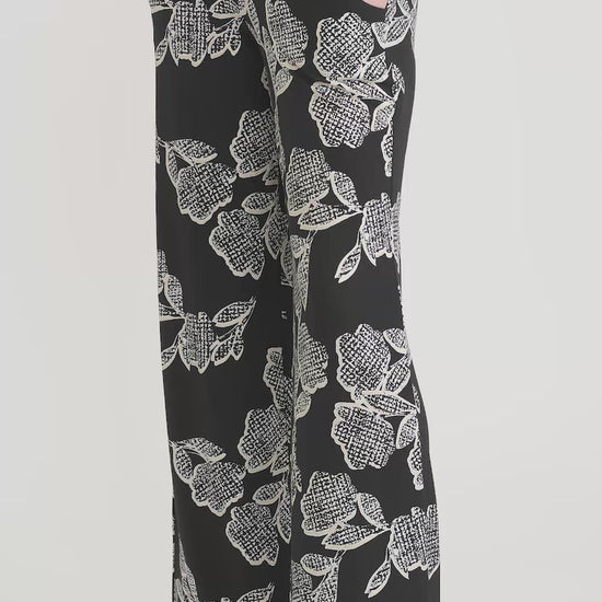 Pantalón corte relajado, negro con estampado de flores blancas con dorado.