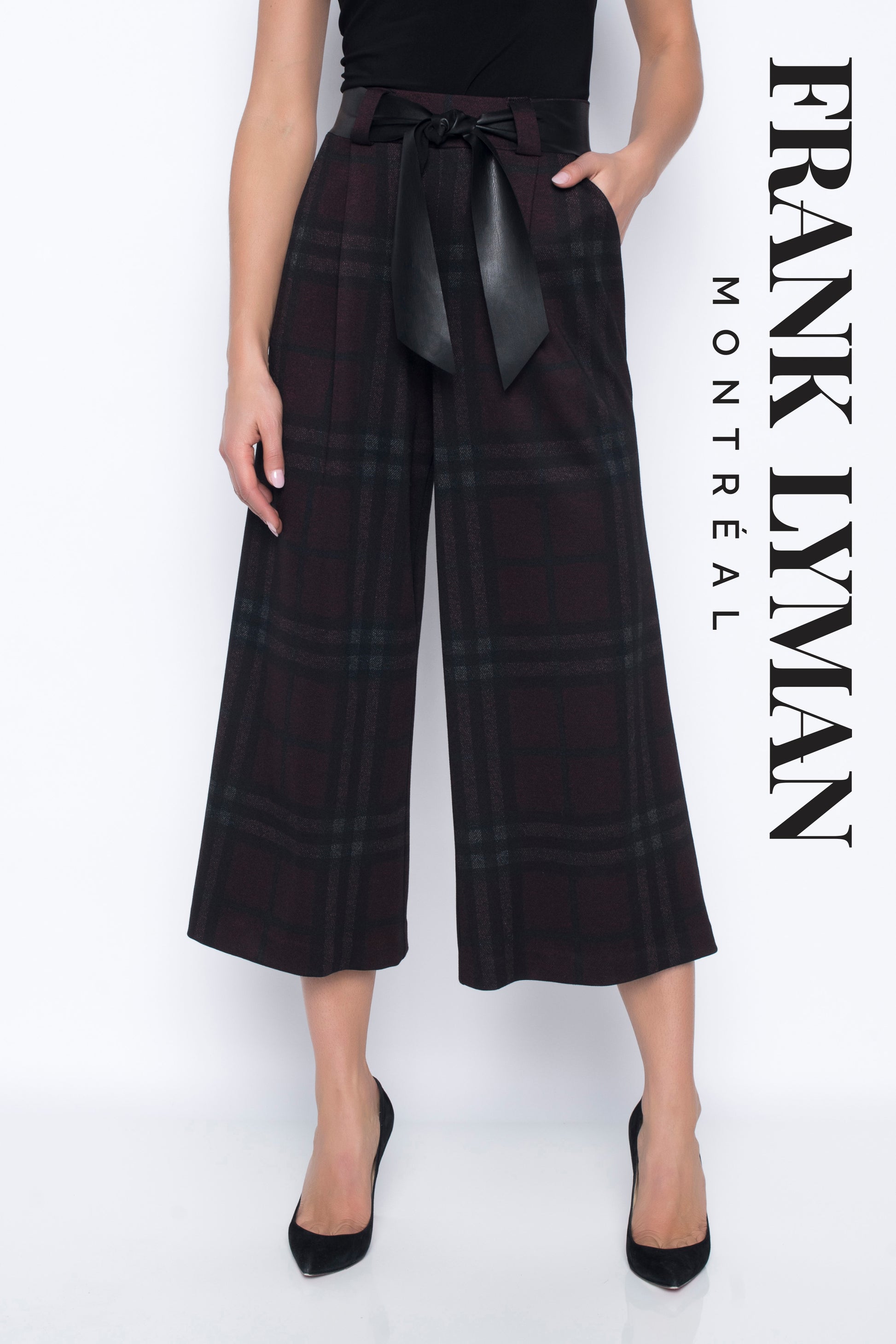 Pantalón corto, corte culotte, con estampado de cuadros color negro y vino, con moño en la pretina de piel sintética.